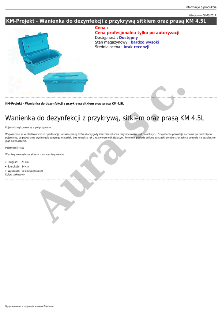 Informacje o produkcie Utworzono 08-03-2017 KM-Projekt - Wanienka do dezynfekcji z przykrywą sitkiem oraz prasą KM 4,5L Cena : Cena profesjonalna tylko po autoryzacji s. c. Dostępność : Dostępny Stan magazynowy : bardzo wysoki Średnia ocena : brak recenzji KM-Projekt - Wanienka do dezynfekcji z przykrywą sitkiem oraz prasą KM 4,5L Wanienka do dezynfekcji z przykrywą, sitkiem oraz prasą KM 4,5L Pojemniki wykonane są z polipropylenu. Wyposażone są w plastikowy kosz z perforacją , a także prasę, która dla wygody i bezpieczeństwa przymocowana jest do uchwytu. Dzięki temu pozostaje ruchoma po zamknięciu pojemnika, co pozwala na wyciśnięcie zużytego materiału bez kontaktu rąk z roztworem odkażającym. Pojemnik posiada solidne zatrzaski po obu stronach co pozwala na bezpieczne jego przenoszenie. Wymiary wewnętrzne sitka = max wymiary wsadu: Długość: ● Szerokość: 14 cm 29 cm Au r ● Wysokość: 10 cm (głębokość) Kolor: turkusowy ● a Pojemność: 4,5L Wygenerowano w programie www.oscGold.com