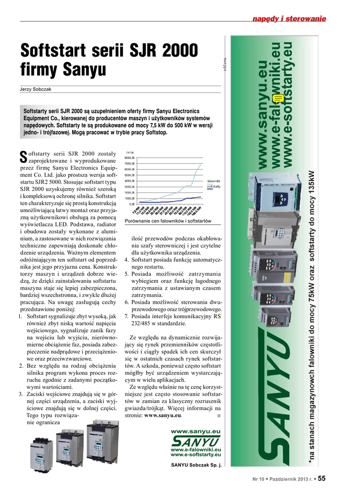 reklama Softstart serii SJR 2000 firmy Sanyu Jerzy Sobczak Softstarty serii SJR 2000 są uzupełnieniem oferty firmy Sanyu Electronics Equipment Co., kierowanej do producentów maszyn i użytkowników systemów napędowych. Softstarty te są produkowane od mocy 7,5 kW do 500 kW w wersji jedno- i trójfazowej. Mogą pracować w trybie pracy Softstop. S oftstarty serii SJR 2000 zostały zaprojektowane i wyprodukowane przez firmę Sanyu Electronics Equipment Co. Ltd. jako prostsza wersja softstartu SJR2 5000. Stosując softstart typu SJR 2000 uzyskujemy również szeroką i kompleksową ochronę silnika. Softstart ten charakteryzuje się prostą konstrukcją umożliwiającą łatwy montaż oraz przyjazną użytkownikowi obsługą za pomocą wyświetlacza LED. Podstawa, radiator i obudowa zostały wykonane z aluminium, a zastosowane w nich rozwiązania techniczne zapewniają doskonałe chłodzenie urządzenia. Ważnym elementem odróżniającym ten softstart od poprzednika jest jego przyjazna cena. Konstruktorzy maszyn i urządzeń dobrze wiedzą, że dzięki zainstalowaniu softstartu maszyna staje się lepiej zabezpieczona, bardziej wszechstronna, i zwykle dłużej pracująca. Na uwagę zasługują cechy przedstawione poniżej: 1. Softstart sygnalizuje zbyt wysoką, jak również zbyt niską wartość napięcia wejściowego, sygnalizuje zanik fazy na wejściu lub wyjściu, nierównomierne obciążenie faz, posiada zabezpieczenie nadprądowe i przeciążeniowe oraz przeciwzwarciowe. 2. Bez względu na rodzaj obciążenia silnika program wykona proces rozruchu zgodnie z zadanymi początkowymi wartościami. 3. Zaciski wejściowe znajdują się w górnej części urządzenia, a zaciski wyjściowe znajdują się w dolnej części. Tego typu rozwiązanie ogranicza Porównanie cen falowników i softstartów ilość przewodów podczas okablowania szafy sterowniczej i jest czytelne dla użytkownika urządzenia. 4. Softstart posiada funkcję automatycznego restartu. 5. Posiada możliwość zatrzymania wybiegiem oraz funkcję łagodnego zatrzymania z ustawianym czasem zatrzymania. 6. Posiada możliwość sterowania dwuprzewodowego oraz trójprzewodowego. 7. Posiada interfejs komunikacyjny RS 232/485 w standardzie. Ze względu na dynamicznie rozwijający się rynek przemienników częstotliwości i ciągły spadek ich cen skurczył się w ostatnich czasach rynek softstartów. A szkoda, ponieważ często softstart mógłby być urządzeniem wystarczającym w wielu aplikacjach. Ze względu właśnie na tę cenę korzystniejsze jest często stosowanie softstartów w zamian za klasyczny rozrusznik gwiazda/trójkąt. Więcej informacji na stronie: www.sanyu.eu. n SANYU Sobczak Sp. j. Nr 10 l Październik 2013 r. l 55