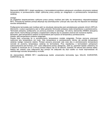 Sterownik ARSEN RP-1 dzięki współpracy z termostatem/czujnikiem pokojowym umożliwia utrzymanie zadanej temperatury w pomieszczeniu dzięki cyklicznej pracy pompy po osiągnięciu w pomieszczeniu temperatury zadanej. Uwaga: Ze względów bezpieczeństwa cykliczna praca pompy możliwa jest tylko do temperatury nieprzekraczającej 800C. Powyżej tej wartości pompa aktywuje się automatycznie i pracuje cały czas aby nie dopuścić do dalszego wzrostu temperatury. Podłączenie termostatu jest możliwe jeśli na obudowie sterownika jest zainstalowane gniazdo chinch (OPCJASterownik z aukcji wyposażony jest w takie gniazdo).Termostat pokojowy bada temperaturę w pomieszczeniu. Termostat pokojowy podłączamy za pomocą przewodu 2-żyłowego. Od strony sterownika ARSEN stosujemy wtyk chinch. Komunikacja pomiędzy urządzeniami odbywa się na zasadzie zwarcia lub rozwarcia styków. Rozwarte- jeśli temperatura zadana na termostacie jest wyższa od temperatury pomieszczenia. Zwarte- jeśli temperatura zostanie osiągnięta. Zwarte styki oznaczają że w pomieszczeniu temperatura została osiągnięta. Pompa zaczyna pracować cyklicznie aby temperatura nie rosła. Gdy temperatura w pomieszczeniu obniży się poniżej temperatury zadanej nastąpi rozwarcie styków. Pompa zaczyna pracować cały czas aby w pomieszczeniu temperatura wzrosła do poziomu temperatury zadanej na termostacie. Przy współpracy z termostatem pokojowym wykorzystywana jest funkcja „CO”- czas odłączenia pompy obiegowej. Jeśli np. parametr będzie ustawiony na 3 będzie to oznaczać że co 3 minuty pompa włączy się na 30 sekund. (wartość 30 sekund jest zawsze stała). Należy tak ustawić czas odłączenia aby pompa nie załączała się zbyt rzadko co może doprowadzać do nadmiernego wzrostu temperatury na kotle. Ze sterownikiem ARSEN RP-1 współpracują każde uniwersalne termostaty typu SALUS, EUROSTER, AURATON itp. itd.