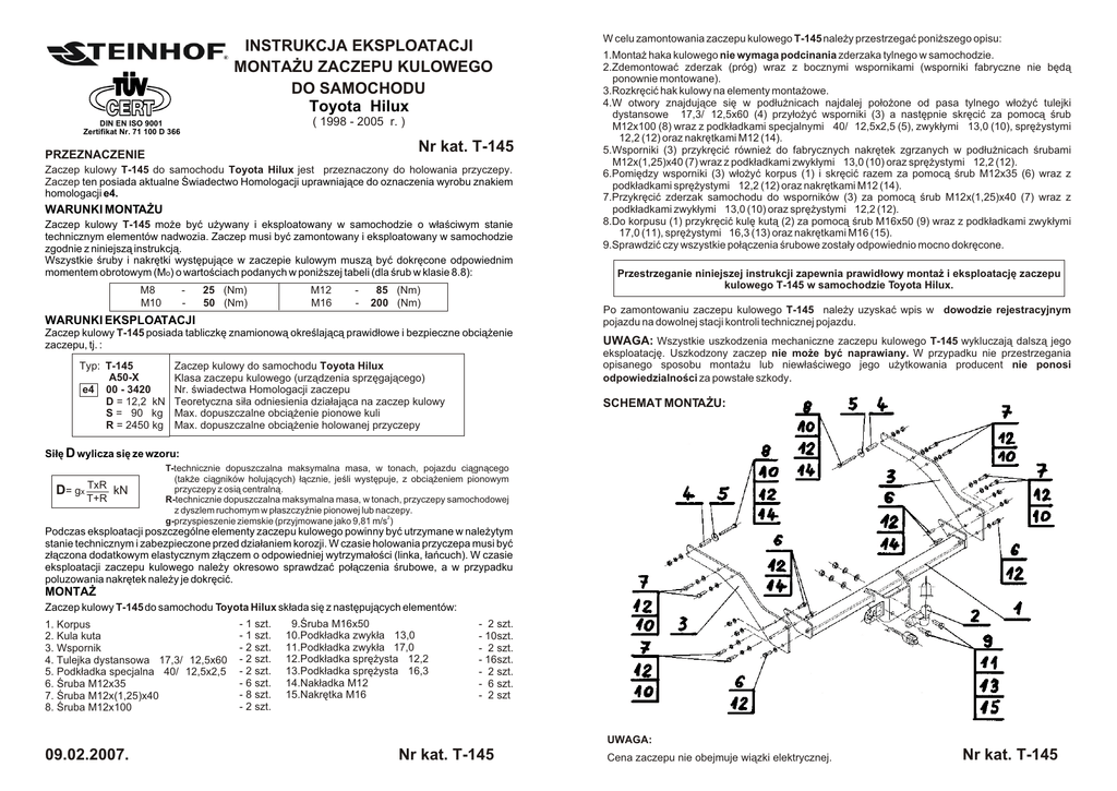 INSTRUKCJA EKSPLOATACJI I MONTA¯U ZACZEPU KULOWEGO DO SAMOCHODU Toyota Hilux ( 1998 - 2005 r. ) DIN EN ISO 9001 Zertifikat Nr. 71 100 D 366 Nr kat. T-145 PRZEZNACZENIE Zaczep kulowy T-145 do samochodu Toyota Hilux jest przeznaczony do holowania przyczepy. Zaczep ten posiada aktualne Œwiadectwo Homologacji uprawniaj¹ce do oznaczenia wyrobu znakiem homologacji e4. WARUNKI MONTA¯U Zaczep kulowy T-145 mo¿e byæ u¿ywany i eksploatowany w samochodzie o w³aœciwym stanie technicznym elementów nadwozia. Zaczep musi byæ zamontowany i eksploatowany w samochodzie zgodnie z niniejsz¹ instrukcj¹. Wszystkie œruby i nakrêtki wystêpuj¹ce w zaczepie kulowym musz¹ byæ dokrêcone odpowiednim momentem obrotowym (Mo) o wartoœciach podanych w poni¿szej tabeli (dla œrub w klasie 8.8): M8 M10 - 25 (Nm) 50 (Nm) M12 M16 - 85 (Nm) 200 (Nm) Przestrzeganie niniejszej instrukcji zapewnia prawid³owy monta¿ i eksploatacjê zaczepu kulowego T-145 w samochodzie Toyota Hilux. Po zamontowaniu zaczepu kulowego T-145 nale¿y uzyskaæ wpis w dowodzie rejestracyjnym pojazdu na dowolnej stacji kontroli technicznej pojazdu. WARUNKI EKSPLOATACJI Zaczep kulowy T-145 posiada tabliczkê znamionow¹ okreœlaj¹c¹ prawid³owe i bezpieczne obci¹¿enie zaczepu, tj. : Typ: T-145 A50-X e4 00 - 3420 D = 12,2 kN S = 90 kg R = 2450 kg W celu zamontowania zaczepu kulowego T-145 nale¿y przestrzegaæ poni¿szego opisu: 1.Monta¿ haka kulowego nie wymaga podcinania zderzaka tylnego w samochodzie. 2.Zdemontowaæ zderzak (próg) wraz z bocznymi wspornikami (wsporniki fabryczne nie bêd¹ ponownie montowane). 3.Rozkrêciæ hak kulowy na elementy monta¿owe. 4.W otwory znajduj¹ce siê w pod³u¿nicach najdalej po³o¿one od pasa tylnego w³o¿yæ tulejki dystansowe Ø17,3/Ø12,5x60 (4) przy³o¿yæ wsporniki (3) a nastêpnie skrêciæ za pomoc¹ œrub M12x100 (8) wraz z podk³adkami specjalnymi Ø40/Ø12,5x2,5 (5), zwyk³ymi Ø13,0 (10), sprê¿ystymi Ø12,2 (12) oraz nakrêtkami M12 (14). 5.Wsporniki (3) przykrêciæ równie¿ do fabrycznych nakrêtek zgrzanych w pod³u¿nicach œrubami M12x(1,25)x40 (7) wraz z podk³adkami zwyk³ymi Ø13,0 (10) oraz sprê¿ystymi Ø12,2 (12). 6.Pomiêdzy wsporniki (3) w³o¿yæ korpus (1) i skrêciæ razem za pomoc¹ œrub M12x35 (6) wraz z podk³adkami sprê¿ystymi Ø12,2 (12) oraz nakrêtkami M12 (14). 7.Przykrêciæ zderzak samochodu do wsporników (3) za pomoc¹ œrub M12x(1,25)x40 (7) wraz z podk³adkami zwyk³ymi Ø13,0 (10) oraz sprê¿ystymi Ø12,2 (12). 8.Do korpusu (1) przykrêciæ kulê kut¹ (2) za pomoc¹ œrub M16x50 (9) wraz z podk³adkami zwyk³ymi Ø17,0 (11), sprê¿ystymi Ø16,3 (13) oraz nakrêtkami M16 (15). 9.Sprawdziæ czy wszystkie po³¹czenia œrubowe zosta³y odpowiednio mocno dokrêcone. Zaczep kulowy do samochodu Toyota Hilux Klasa zaczepu kulowego (urz¹dzenia sprzêgaj¹cego) Nr. œwiadectwa Homologacji zaczepu Teoretyczna si³a odniesienia dzia³aj¹ca na zaczep kulowy Max. dopuszczalne obci¹¿enie pionowe kuli Max. dopuszczalne obci¹¿enie holowanej przyczepy UWAGA: Wszystkie uszkodzenia mechaniczne zaczepu kulowego T-145 wykluczaj¹ dalsz¹ jego eksploatacjê. Uszkodzony zaczep nie mo¿e byæ naprawiany. W przypadku nie przestrzegania opisanego sposobu monta¿u lub niew³aœciwego jego u¿ytkowania producent nie ponosi odpowiedzialnoœci za powsta³e szkody. SCHEMAT MONTA¯U: Si³ê D wylicza siê ze wzoru: D= gx TxR kN T+R T-technicznie dopuszczalna maksymalna masa, w tonach, pojazdu ci¹gn¹cego (tak¿e ci¹gników holuj¹cych) ³¹cznie, jeœli wystêpuje, z obci¹¿eniem pionowym przyczepy z osi¹ centraln¹. R-technicznie dopuszczalna maksymalna masa, w tonach, przyczepy samochodowej z dyszlem ruchomym w p³aszczyŸnie pionowej lub naczepy. g-przyspieszenie ziemskie (przyjmowane jako 9,81 m/s2) Podczas eksploatacji poszczególne elementy zaczepu kulowego powinny byæ utrzymane w nale¿ytym stanie technicznym i zabezpieczone przed dzia³aniem korozji. W czasie holowania przyczepa musi byæ z³¹czona dodatkowym elastycznym z³¹czem o odpowiedniej wytrzyma³oœci (linka, ³añcuch). W czasie eksploatacji zaczepu kulowego nale¿y okresowo sprawdzaæ po³¹czenia œrubowe, a w przypadku poluzowania nakrêtek nale¿y je dokrêciæ. MONTA¯ Zaczep kulowy T-145 do samochodu Toyota Hilux sk³ada siê z nastêpuj¹cych elementów: 1. Korpus 2. Kula kuta 3. Wspornik 4. Tulejka dystansowa Ø17,3/Ø12,5x60 5. Podk³adka specjalna Ø40/Ø12,5x2,5 6. Œruba M12x35 7. Œruba M12x(1,25)x40 8. Œruba M12x100 - 1 szt. - 1 szt. - 2 szt. - 2 szt. - 2 szt. - 6 szt. - 8 szt. - 2 szt. 9.Œruba M16x50 10.Podk³adka zwyk³a Ø13,0 11.Podk³adka zwyk³a Ø17,0 12.Podk³adka sprê¿ysta Ø12,2 13.Podk³adka sprê¿ysta Ø16,3 14.Nak³adka M12 15.Nakrêtka M16 - 2 szt. - 10szt. - 2 szt. - 16szt. - 2 szt. - 6 szt. - 2 szt UWAGA: 09.02.2007. Nr kat. T-145 Cena zaczepu nie obejmuje wi¹zki elektrycznej. Nr kat. T-145