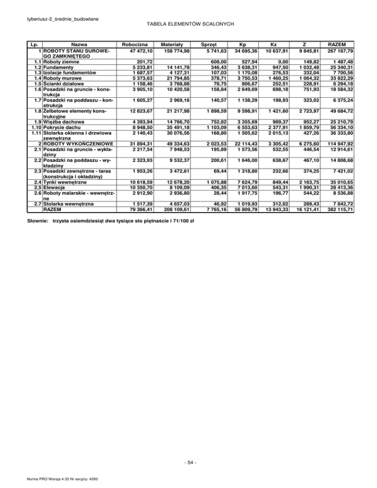 tyberiusz-2_średnie_budowlane Lp. Nazwa 1 ROBOTY STANU SUROWEGO ZAMKNIĘTEGO 1.1 Roboty ziemne 1.2 Fundamenty 1.3 Izolacje fundamentów 1.4 Roboty murowe 1.5 Ścianki działowe 1.6 Posadzki na gruncie - konstrukcja 1.7 Posadzki na poddaszu - konstrukcja 1.8 śelbetowe elementy konstrukcyjne 1.9 Więźba dachowa 1.10 Pokrycie dachu 1.11 Stolarka okienna i drzwiowa zewnętrzna 2 ROBOTY WYKOŃCZENIOWE 2.1 Posadzki na gruncie - wykładziny 2.2 Posadzki na poddaszu - wykładziny 2.3 Posadzki zewnętrzne - taras (konstrukcja i okładziny) 2.4 Tynki wewnętrzne 2.5 Elewacja 2.6 Roboty malarskie - wewnętrzne 2.7 Stolarka wewnętrzna RAZEM TABELA ELEMENTÓW SCALONYCH Robocizna 47 472,10 Materiały 158 774,98 Sprzęt 5 741,63 Kp 34 695,36 Kz 10 637,91 Z 9 845,81 RAZEM 267 167,79 201,72 5 233,81 1 687,57 5 373,63 1 158,46 3 905,10 14 141,78 4 127,31 21 794,85 3 768,88 10 420,58 608,00 346,43 107,03 378,71 78,75 158,84 527,94 3 638,31 1 170,08 3 750,53 806,67 2 649,69 0,00 947,50 276,53 1 460,25 252,51 698,18 149,82 1 032,48 332,04 1 064,32 228,91 751,93 1 487,48 25 340,31 7 700,56 33 822,29 6 294,18 18 584,32 1 605,27 2 969,16 140,57 1 138,29 198,93 323,02 6 375,24 12 823,67 21 217,98 1 898,59 9 598,91 1 421,60 2 723,97 49 684,72 4 393,94 8 948,50 2 140,43 14 766,70 35 491,18 30 076,56 752,82 1 103,09 168,80 3 355,69 6 553,63 1 505,62 989,37 2 377,91 2 015,13 952,27 1 859,79 427,26 25 210,79 56 334,10 36 333,80 31 894,31 2 217,54 49 334,63 7 948,53 2 023,53 195,89 22 114,43 1 573,56 3 305,42 532,55 6 275,60 446,54 114 947,92 12 914,61 2 323,93 9 532,37 200,61 1 646,00 638,67 467,10 14 808,68 1 953,26 3 472,61 69,44 1 318,80 232,66 374,25 7 421,02 10 618,59 10 350,70 2 912,90 12 678,20 8 109,09 2 936,80 1 075,88 406,35 28,44 7 624,79 7 013,60 1 917,75 849,44 543,31 196,77 2 163,75 1 990,31 544,22 35 010,65 28 413,36 8 536,88 1 517,39 79 366,41 4 657,03 208 109,61 46,92 7 765,16 1 019,93 56 809,79 312,02 13 943,33 289,43 16 121,41 7 842,72 382 115,71 Słownie: trzysta osiemdziesiąt dwa tysiące sto piętnaście i 71/100 zł - 54 - Norma PRO Wersja 4.33 Nr seryjny: 4393
