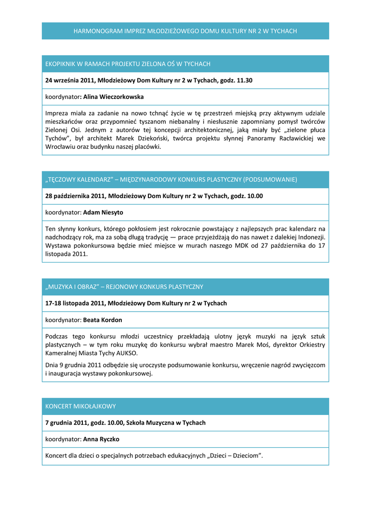 HARMONOGRAM IMPREZ MŁODZIEŻOWEGO DOMU KULTURY NR 2 W TYCHACH EKOPIKNIK W RAMACH PROJEKTU ZIELONA OŚ W TYCHACH 24 września 2011, Młodzieżowy Dom Kultury nr 2 w Tychach, godz. 11.30 koordynator: Alina Wieczorkowska Impreza miała za zadanie na nowo tchnąć życie w tę przestrzeń miejską przy aktywnym udziale mieszkańców oraz przypomnieć tyszanom niebanalny i niesłusznie zapomniany pomysł twórców Zielonej Osi. Jednym z autorów tej koncepcji architektonicznej, jaką miały być „zielone płuca Tychów”, był architekt Marek Dziekoński, twórca projektu słynnej Panoramy Racławickiej we Wrocławiu oraz budynku naszej placówki. „TĘCZOWY KALENDARZ” – MIĘDZYNARODOWY KONKURS PLASTYCZNY (PODSUMOWANIE) 28 października 2011, Młodzieżowy Dom Kultury nr 2 w Tychach, godz. 10.00 koordynator: Adam Niesyto Ten słynny konkurs, którego pokłosiem jest rokrocznie powstający z najlepszych prac kalendarz na nadchodzący rok, ma za sobą długą tradycję — prace przyjeżdżają do nas nawet z dalekiej Indonezji. Wystawa pokonkursowa będzie mieć miejsce w murach naszego MDK od 27 października do 17 listopada 2011. „MUZYKA I OBRAZ” – REJONOWY KONKURS PLASTYCZNY 17-18 listopada 2011, Młodzieżowy Dom Kultury nr 2 w Tychach koordynator: Beata Kordon Podczas tego konkursu młodzi uczestnicy przekładają ulotny język muzyki na język sztuk plastycznych – w tym roku muzykę do konkursu wybrał maestro Marek Moś, dyrektor Orkiestry Kameralnej Miasta Tychy AUKSO. Dnia 9 grudnia 2011 odbędzie się uroczyste podsumowanie konkursu, wręczenie nagród zwycięzcom i inauguracja wystawy pokonkursowej. KONCERT MIKOŁAJKOWY 7 grudnia 2011, godz. 10.00, Szkoła Muzyczna w Tychach koordynator: Anna Ryczko Koncert dla dzieci o specjalnych potrzebach edukacyjnych „Dzieci – Dzieciom”. DZIEŃ BABCI I DZIADKA 22 stycznia 2012, Młodzieżowy Dom Kultury nr 2 w Tychach koordynator: Anna Niemczewska Spotkanie z Babciami i Dziadkami w MDK nr 2 – minikoncert naszych wychowanków. „DZIECI – MAMOM” – KONCERT Z OKAZJI DNIA MATKI 25 maja 2012, Teatr Mały w Tychach koordynator: Joanna Zamasz-Widera Koncert. DZIEŃ DZIECKA 1 czerwca 2012, Młodzieżowy Dom Kultury nr 2 w Tychach koordynator: Jolanta Kloc Dzień sportu w naszej placówce. MOZAIKOWY OGRÓD 25 czerwca – 06 lipca 2012, ogród Młodzieżowego Domu Kultury nr 2 w Tychach koordynator: Gabriela Kiełczewska-Słowikowska Otwarte warsztaty ceramiczne prowadzone w naszej placówce. KOLORY MIASTA 29 – 31 sierpnia 2012, Młodzieżowy Dom Kultury nr 2 w Tychach koordynator: Adam Niesyto Otwarte warsztaty graffiti w Młodzieżowym Domu Kultury nr 2 w Tychach.