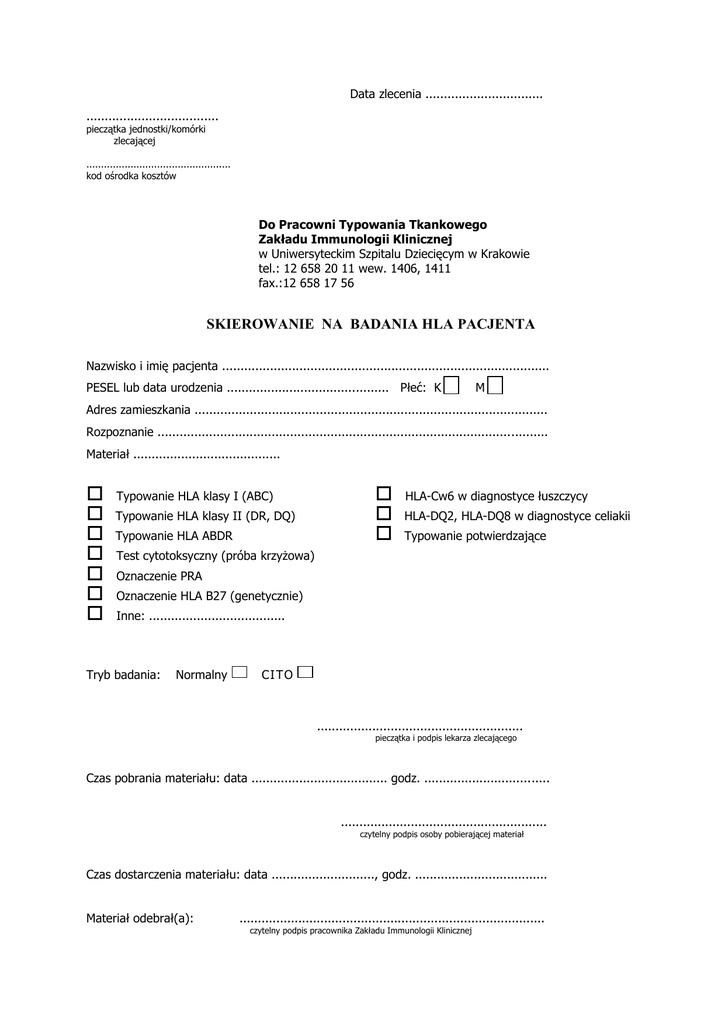 Data zlecenia ................................ .................................... pieczątka jednostki/komórki zlecającej ................................................. kod ośrodka kosztów Do Pracowni Typowania Tkankowego Zakładu Immunologii Klinicznej w Uniwersyteckim Szpitalu Dziecięcym w Krakowie tel.: 12 658 20 11 wew. 1406, 1411 fax.:12 658 17 56 SKIEROWANIE NA BADANIA HLA PACJENTA Nazwisko i imię pacjenta ......................................................................................... PESEL lub data urodzenia ............................................ Płeć: K M Adres zamieszkania ................................................................................................ Rozpoznanie .......................................................................................................... Materiał ........................................ Typowanie HLA klasy I (ABC) Typowanie HLA klasy II (DR, DQ) Typowanie HLA ABDR HLA-Cw6 w diagnostyce łuszczycy HLA-DQ2, HLA-DQ8 w diagnostyce celiakii Typowanie potwierdzające Test cytotoksyczny (próba krzyżowa) Oznaczenie PRA Oznaczenie HLA B27 (genetycznie) Inne: ..................................... Tryb badania: Normalny CI TO ........................................................ pieczątka i podpis lekarza zlecającego Czas pobrania materiału: data ..................................... godz. .................................. ........................................................ czytelny podpis osoby pobierającej materiał Czas dostarczenia materiału: data ............................, godz. .................................... Materiał odebrał(a): ................................................................................... czytelny podpis pracownika Zakładu Immunologii Klinicznej
