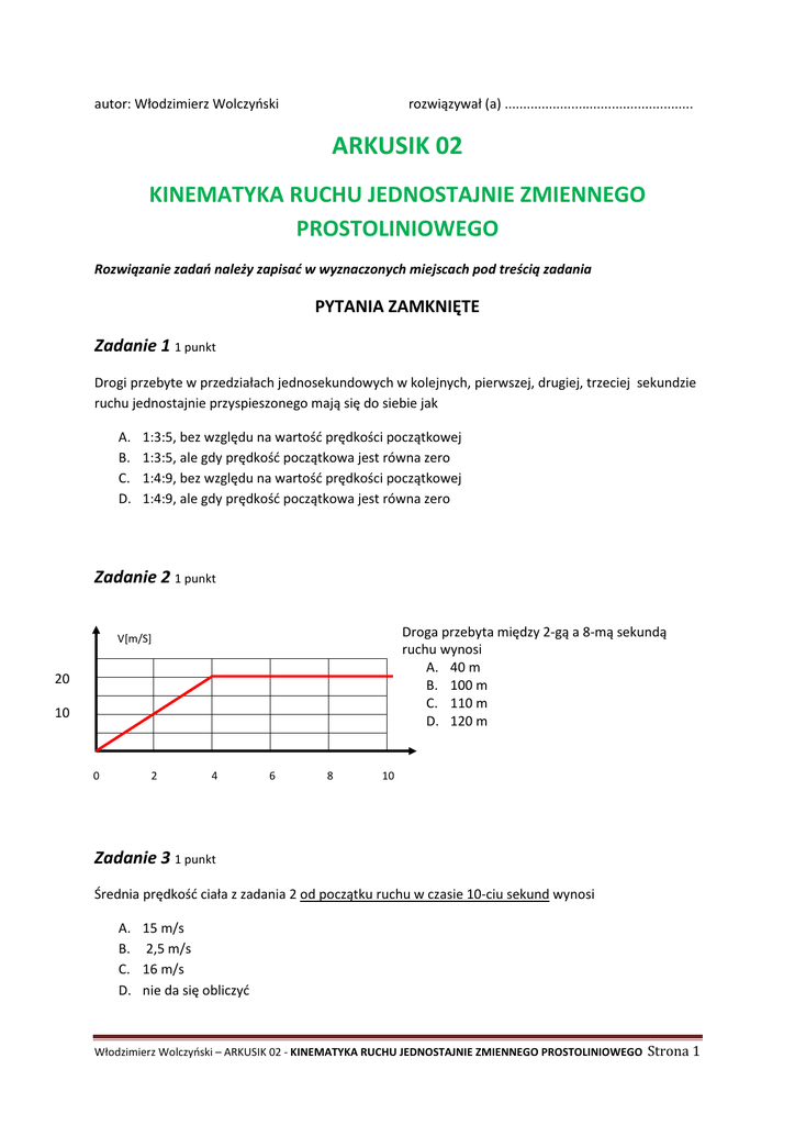 autor: Włodzimierz Wolczyński rozwiązywał (a) ................................................... ARKUSIK 02 KINEMATYKA RUCHU JEDNOSTAJNIE ZMIENNEGO PROSTOLINIOWEGO Rozwiązanie zadań należy zapisać w wyznaczonych miejscach pod treścią zadania PYTANIA ZAMKNIĘTE Zadanie 1 1 punkt Drogi przebyte w przedziałach jednosekundowych w kolejnych, pierwszej, drugiej, trzeciej sekundzie ruchu jednostajnie przyspieszonego mają się do siebie jak A. B. C. D. 1:3:5, bez względu na wartość prędkości początkowej 1:3:5, ale gdy prędkość początkowa jest równa zero 1:4:9, bez względu na wartość prędkości początkowej 1:4:9, ale gdy prędkość początkowa jest równa zero Zadanie 2 1 punkt Droga przebyta między 2-gą a 8-mą sekundą ruchu wynosi A. 40 m B. 100 m C. 110 m D. 120 m V[m/S] 20 10 0 t[s] 2 4 6 8 10 Zadanie 3 1 punkt Średnia prędkość ciała z zadania 2 od początku ruchu w czasie 10-ciu sekund wynosi A. B. C. D. 15 m/s 2,5 m/s 16 m/s nie da się obliczyć Włodzimierz Wolczyński – ARKUSIK 02 - KINEMATYKA RUCHU JEDNOSTAJNIE ZMIENNEGO PROSTOLINIOWEGO Strona 1 PYTANIA OTWARTE Zadanie 4 5 punktów Zaznacz krzyżykiem PRAWDA FAŁSZ Jeśli ruch jest jednostajnie zmienny, to prędkość średnia jest równa średniej arytmetycznej. W ruchu jednostajnie opóźnionym przyspieszenie ma wartość ujemną i w czasie maleje. Pole figury pod wykresem zależności prędkości od czasu jest liczbowo równe drodze przebytej przez ciało, ale tylko w ruchu jednostajnym, lub jednostajnie zmiennym. Jeśli opóźnienie w ruchu wynosi 2 m/s2, to przyspieszenie wynosi -2 m/s2. W ruchu jednostajnie przyspieszonym przyspieszenie ma stałą w czasie wartość dodatnią. Zadanie 5 6 punktów Poniższy wykres przedstawia zależność v(t) w ruchu pewnego ciała. v[m/s] 20 10 0 2 4 6 8 10 12 14 t[s] -10 -20 Włodzimierz Wolczyński – ARKUSIK 02 - KINEMATYKA RUCHU JEDNOSTAJNIE ZMIENNEGO PROSTOLINIOWEGO Strona 2 a. Przedstaw zależność przyspieszenia od czasu dla tego ciała. (3 pkt.) a[m/s2] 2 4 6 8 10 12 14 t[s] b. Oblicz drogę przebytą w czasie 15 s od początku ruchu. (2 pkt.) c. Podkreśl właściwe odpowiedzi. Po 15 tej sekundzie ciało porusza się ruchem jednostajnie zmiennym – niejednostajnie zmiennym – jednostajnym a bardziej konkretnie, to niejednostajnie opóźnionym – jednostajnie opóźnionym – jednostajnie przyspieszonym - jednostajnym (1 pkt.) Włodzimierz Wolczyński – ARKUSIK 02 - KINEMATYKA RUCHU JEDNOSTAJNIE ZMIENNEGO PROSTOLINIOWEGO Strona 3 Zadanie 6 4 punkty W drugiej sekundzie ruchu jednostajnie przyspieszonego bez prędkości początkowej ciało przebyło drogę 3 m. a. Jego przyspieszenie wynosiło (2 pkt.) b. Oblicz drogę przebytą w ciągu pierwszej sekundy i całkowitą, po dwóch sekundach (2 pkt.) Zadanie 7 7 punktów Ciało porusza się zgodzie z równaniem: = −5 ଶ + 20 + 10[, ] Gdzie x, to położenie ciała, czyli odległość od punktu 0 0 x Podaj wartości: a. przyspieszenia tego ciała (1 pkt.) Włodzimierz Wolczyński – ARKUSIK 02 - KINEMATYKA RUCHU JEDNOSTAJNIE ZMIENNEGO PROSTOLINIOWEGO Strona 4 d. prędkości początkowej i prędkości po 2 s ruchu (2 pkt.) e. położenia ciała po 2 s ruchu (2 pkt.) f. przemieszczenia ciała po 2 s ruchu (2 pkt.) Ocena l. p. temat ZADANIA ZAMKNIĘTE 4 Zaznacz krzyżykiem 5 Poniższy wykres przedstawia 6 W drugiej sekundzie 7 Ciało porusza się zgodzie z równaniem RAZEM ZADANIA OTWARTE RAZEM ZDOBYTYCH PKT. MAX 3 5 6 4 7 22 25 Włodzimierz Wolczyński – ARKUSIK 02 - KINEMATYKA RUCHU JEDNOSTAJNIE ZMIENNEGO PROSTOLINIOWEGO Strona 5