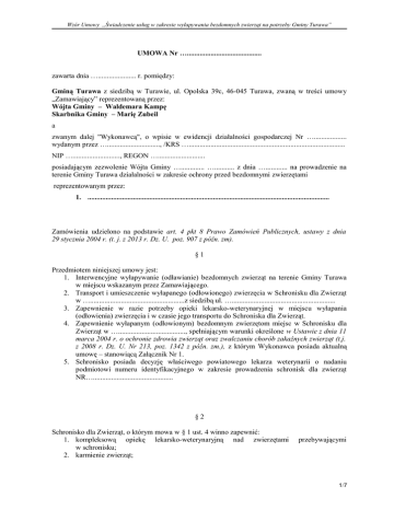 Wzór Umowy „Świadczenie usług w zakresie wyłapywania bezdomnych zwierząt na potrzeby Gminy Turawa” UMOWA Nr …......................................... zawarta dnia …..................... r. pomiędzy: Gminą Turawa z siedzibą w Turawie, ul. Opolska 39c, 46-045 Turawa, zwaną w treści umowy „Zamawiający” reprezentowaną przez: Wójta Gminy – Waldemara Kampę Skarbnika Gminy – Marię Zubeil a zwanym dalej "Wykonawcą", o wpisie w ewidencji działalności gospodarczej Nr ….................. wydanym przez …............................., /KRS …...................................................................................... NIP ….........................., REGON ….......................... posiadającym zezwolenie Wójta Gminy …............. …........... z dnia …............ na prowadzenie na terenie Gminy Turawa działalności w zakresie ochrony przed bezdomnymi zwierzętami reprezentowanym przez: 1. ..................................................................................................................................... Zamówienia udzielono na podstawie art. 4 pkt 8 Prawo Zamówień Publicznych, ustawy z dnia 29 stycznia 2004 r. (t. j. z 2013 r. Dz. U. poz. 907 z późn. zm). §1 Przedmiotem niniejszej umowy jest: 1. Interwencyjne wyłapywanie (odławianie) bezdomnych zwierząt na terenie Gminy Turawa w miejscu wskazanym przez Zamawiającego. 2. Transport i umieszczenie wyłapanego (odłowionego) zwierzęcia w Schronisku dla Zwierząt w …....................................................z siedzibą ul. …......................................................... 3. Zapewnienie w razie potrzeby opieki lekarsko-weterynaryjnej w miejscu wyłapania (odłowienia) zwierzęcia i w czasie jego transportu do Schroniska dla Zwierząt. 4. Zapewnienie wyłapanym (odłowionym) bezdomnym zwierzętom miejsc w Schronisku dla Zwierząt w …....................................., spełniającym warunki określone w Ustawie z dnia 11 marca 2004 r. o ochronie zdrowia zwierząt oraz zwalczaniu chorób zakaźnych zwierząt (t.j. z 2008 r. Dz. U. Nr 213, poz. 1342 z późn. zm.), z którym Wykonawca posiada aktualną umowę – stanowiącą Załącznik Nr 1. 5. Schronisko posiada decyzję właściwego powiatowego lekarza weterynarii o nadaniu podmiotowi numeru identyfikacyjnego w zakresie prowadzenia schronisk dla zwierząt NR…............................................ §2 Schronisko dla Zwierząt, o którym mowa w § 1 ust. 4 winno zapewnić: 1. kompleksową opiekę lekarsko-weterynaryjną nad zwierzętami w schronisku; 2. karmienie zwierząt; przebywającymi 1/7 Wzór Umowy „Świadczenie usług w zakresie wyłapywania bezdomnych zwierząt na potrzeby Gminy Turawa” 3. obligatoryjną sterylizację i kastrację zwierząt po 14 dniach od przyjęcia do schroniska, z wyjątkiem zwierząt u których istnieją przeciwwskazania do wykonania tych zabiegów z uwagi na stan zdrowia i/lub wiek; 4. poszukiwanie właścicieli dla bezdomnych zwierząt i oddawanie do adopcji zainteresowanym osobom; 5. usypianie ślepych miotów; 6. niezbędne do opieki nad zwierzętami środki, materiały i wyposażenie; 7. prowadzenie ewidencji przyjętych zwierząt z terenu Gminy Turawa oraz przeprowadzonych na nich zabiegach weterynaryjnych, 8. czipowanie zgodnie z wiedzą weterynaryjną zwierząt, które wcześniej nie zostały oznakowane identyfikatorem elektronicznym, w momencie przyjmowania do schroniska. §3 Wyłapywanie (odławianie) oraz transport wyłapanych (odłowionych) bezdomnych zwierząt, o których mowa § 1 ust. 1 niniejszej umowy może odbywać się wyłącznie przy pomocy środków do tego celu przystosowanych i może być prowadzone jedynie w odpowiednich warunkach, zgodnie z Rozporządzeniem Rady (WE) nr 1/2005 z dnia 22 grudnia 2004r. w sprawie ochrony zwierząt podczas transportu i związanych z tym działań oraz zmieniającym dyrektywy 64/432/EWG i 93/119/WE oraz rozporządzeniem (WE) nr 1255/97 (Dz. Urz. UE L 3 z 5.01.2005, str. 1), zwanym dalej “rozporządzeniem nr 1/2005”. §4 1. Wykonawca przy wykonywaniu przedmiotu umowy zobowiązany jest do stosowania przepisów określonych w Ustawie z dnia 21 sierpnia 1997 r. o ochronie zwierząt (t.j. z 2013 r. Dz. U. poz. 856), 2. Wykonawca przy wykonywaniu przedmiotu umowy zobowiązany jest do stosowania się do wymagań określonych w zezwoleniu Wójta Gminy Turawa …............. z dnia …................. na prowadzenie na terenie Gminy Turawa działalności w zakresie ochrony przed bezdomnymi zwierzętami. 3. Wykonawca zapewnia całoroczną gotowość do świadczenia usług przez całą dobę, we wszystkie dni w roku. 4. Wykonawca zobowiązuje się udostępnić numer telefonu kontaktowego, który będzie dostępny 24 godziny na dobę. 5. Przy wykonywaniu przedmiotu umowy Wykonawca zapewnia specjalistyczny pojazd wraz z wyposażeniem oraz udział kierowcy. 6. Używane przy wyłapaniu zwierząt bezdomnych urządzenia i środki nie mogą stwarzać zagrożenia dla ich życia i zdrowia ani zadawać im cierpienia. 7. Usługa wyłapania (odłowienia) bezdomnego zwierzęcia, jego transport i umieszczenie w Schronisku dla Zwierząt, o którym mowa w § 1 niniejszej umowy odbywa się na zlecenie Zamawiającego. 8. Zlecenie o którym mowa w § 4 ust. 2 i ust. 6 polega na pisemnym (fax, e-mail) lub ustnym (telefonicznym) wezwaniu Wykonawcy, do jego wykonania. 9. Wykonawca zobowiązuje się każdorazowo sporządzać protokół przekazania zwierzęcia bądź protokołu z interwencji. Wzór protokołu stanowi Załącznik Nr 3 do niniejszej umowy. 10. Ze strony Zamawiającego ustala się koordynatora w osobie Kierownika Referatu Gospodarki Nieruchomościami, Ochrony Środowiska i Rolnictwa tel. 77 4212 072 wew. 104 oraz inspektora ds. ochrony środowiska tel. 77 4212 072 wew. 105. 11. Ze strony Wykonawcy ustala się koordynatora w osobie: ….................. tel. …....................... 12. Wykonawca ma obo