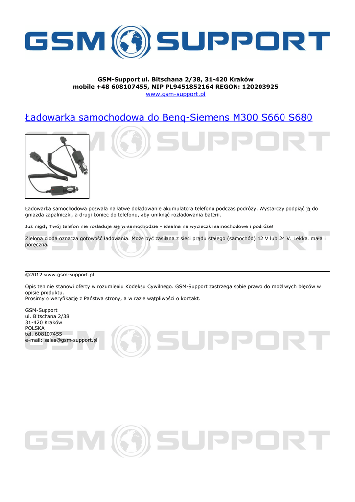 GSM-Support ul. Bitschana 2/38, 31-420 Kraków mobile +48 608107455, NIP PL9451852164 REGON: 120203925 www.gsm-support.pl Ładowarka samochodowa do Benq-Siemens M300 S660 S680 Ładowarka samochodowa pozwala na łatwe doładowanie akumulatora telefonu podczas podróży. Wystarczy podpiąć ją do gniazda zapalniczki, a drugi koniec do telefonu, aby uniknąć rozładowania baterii. Już nigdy Twój telefon nie rozładuje się w samochodzie - idealna na wycieczki samochodowe i podróże! Zielona dioda oznacza gotowość ładowania. Może być zasilana z sieci prądu stałego (samochód) 12 V lub 24 V. Lekka, mała i poręczna. ©2012 www.gsm-support.pl Opis ten nie stanowi oferty w rozumieniu Kodeksu Cywilnego. GSM-Support zastrzega sobie prawo do możliwych błędów w opisie produktu. Prosimy o weryfikację z Państwa strony, a w razie wątpliwości o kontakt. GSM-Support ul. Bitschana 2/38 31-420 Kraków POLSKA tel. 608107455 e-mail: [email protected] Powered by TCPDF (www.tcpdf.org)