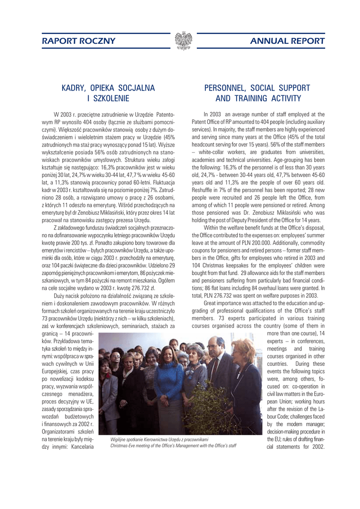 RAPORT ROCZNY KADRY, OPIEKA SOCJALNA I SZKOLENIE ANNUAL REPORT PERSONNEL, SOCIAL SUPPORT AND TRAINING ACTIVITY In 2003 an average number of staff employed at the W 2003 r. przeciêtne zatrudnienie w Urzêdzie PatentoPatent Office of RP amounted to 404 people (including auxiliary wym RP wynosi³o 404 osoby (³¹cznie ze s³u¿bami pomocniservices). In majority, the staff members are highly experienced czymi). Wiêkszoœæ pracowników stanowi¹ osoby z du¿ym doand serving since many years at the Office (45% of the total œwiadczeniem i wieloletnim sta¿em pracy w Urzêdzie (45% headcount serving for over 15 years). 56% of the staff members zatrudnionych ma sta¿ pracy wynosz¹cy ponad 15 lat). Wy¿sze – white-collar workers, are graduates from universities, wykszta³cenie posiada 56% osób zatrudnionych na stanoacademies and technical universities. Age-grouping has been wiskach pracowników umys³owych. Struktura wieku za³ogi the following: 16,3% of the personnel is of less than 30 years kszta³tuje siê nastêpuj¹co: 16,3% pracowników jest w wieku old, 24,7% - between 30-44 years old, 47,7% between 45-60 poni¿ej 30 lat, 24,7% w wieku 30-44 lat, 47,7 % w wieku 45-60 years old and 11,3% are the people of over 60 years old. lat, a 11,3% stanowi¹ pracownicy ponad 60-letni. Fluktuacja Reshuffle in 7% of the personnel has been reported; 28 new kadr w 2003 r. kszta³towa³a siê na poziomie poni¿ej 7%. Zatrudpeople were recruited and 26 people left the Office, from niono 28 osób, a rozwi¹zano umowy o pracê z 26 osobami, among of which 11 people were pensioned or retired. Among z których 11 odesz³o na emeryturê. Wœród przechodz¹cych na those pensioned was Dr. Zenobiusz Miklasiñski who was emeryturê by³ dr Zenobiusz Miklasiñski, który przez okres 14 lat holding the post of Deputy President of the Office for 14 years. pracowa³ na stanowisku zastêpcy prezesa Urzêdu. Within the welfare benefit funds at the Office’s disposal, Z zak³adowego funduszu œwiadczeñ socjalnych przeznaczothe Office contributed to the expenses on: employees’ summer no na dofinansowanie wypoczynku letniego pracowników Urzêdu leave at the amount of PLN 200.000. Additionally, commodity kwotê prawie 200 tys. z³. Ponadto zakupiono bony towarowe dla coupons for pensioners and retired persons – former staff mememerytów i rencistów – by³ych pracowników Urzêdu, a tak¿e upobers in the Office, gifts for employees who retired in 2003 and minki dla osób, które w ci¹gu 2003 r. przechodzi³y na emeryturê, 104 Christmas keepsakes for the employees’ children were oraz 104 paczki œwi¹teczne dla dzieci pracowników. Udzielono 29 bought from that fund. 29 allowance aids for the staff members zapomóg pieniê¿nych pracownikom i emerytom, 86 po¿yczek mieand pensioners suffering from particularly bad financial condiszkaniowych, w tym 84 po¿yczki na remont mieszkania. Ogó³em tions; 86 flat loans including 84 overhaul loans were granted. In na cele socjalne wydano w 2003 r. kwotê 276.732 z³. total, PLN 276.732 was spent on welfare purposes in 2003. Du¿y nacisk po³o¿ono na dzia³alnoœæ zwi¹zan¹ ze szkoleGreat importance was attached to the education and upniem i doskonaleniem zawodowym pracowników. W ró¿nych grading of professional qualifications of the Office’s staff formach szkoleñ organizowanych na terenie kraju uczestniczy³o members. 73 experts participated in various training 73 pracowników Urzêdu (niektórzy z nich – w kilku szkoleniach), courses organised across the country (some of them in zaœ w konferencjach szkoleniowych, seminariach, sta¿ach za more than one course), 14 granic¹ – 14 pracowniexperts – in conferences, ków. Przyk³adowa temameetings and training tyka szkoleñ to miêdzy incourses organised in other nymi: wspó³praca w spracountries. During these wach cywilnych w Unii events the following topics Europejskiej, czas pracy were, among others, fopo nowelizacji kodeksu cused on: co-operation in pracy, wyzwania wspó³civil law matters in the Euroczesnego menad¿era, pean Union; working hours proces decyzyjny w UE, after the revision of the Lazasady sporz¹dzania sprabour Code; challenges faced wozdañ bud¿etowych by the modern manager; i finansowych za 2002 r. decision-making procedure in Organizatorami szkoleñ the EU; rules of drafting finanWigilijne spotkanie Kierownictwa Urzêdu z pracownikami na terenie kraju by³y miêChristmas-Eve meeting of the Office’s Management with the Office’s staff cial statements for 2002. dzy innymi: Kancelaria RAPORT ROCZNY Prezesa Rady Ministrów, Krajowa Szko³a Administracji Publicznej, Urz¹d Komitetu Integracji Europejskiej, Urz¹d S³u¿by Cywilnej, Polska Fundacja Promocji Kadr, Mazowiecki Wojewódzki Oœrodek Szkolenia i Dokszta³cania Kadr, „EDUKATOR” sp. z o. o., Fundacja Rozwoju Rachunkowoœci w Polsce, Zak³ad Ubezpieczeñ Spo³ecznych. Pracownicy Urzêdu byli uczestnikami ogó³em 29 szkoleñ i kursów. Form¹ doskonalenia zawodowego pracowników by³ tak¿e ich udzia³ w konferencjach i sympozjach merytorycznie zwi¹zanych z podstawow¹ dzia³alnoœci¹ Urzêdu Patentowego, tj. przyjmowaniem zg³oszeñ i udzielaniem praw wy³¹cznych na przedmioty ochrony w³asnoœci przemys³owej, w tym sta¿e i praktyki zagraniczne, organizowane w wiêkszoœci przez Europejski Urz¹d Patentowy, Urz¹d ds. Harmonizacji Rynku Wewnêtrznego w Alicante i inne instytucje unijne. Przygotowano i zorganizowano szkolenie bhp i przeciwpo¿arowe dla 180 pracowników Urzêdu. Czterech pracowników bra³o udzia³ w semestralnych kursach jêzyków obcych, organizowanych przez Krajow¹ Szko³ê Administracji Publicznej. W szkoleniu z zakresu s³u¿by przygotowawczej do s³u¿by cywilnej bra³o udzia³ 14 pracowników. Do egzaminu koñcz¹cego s³u¿bê przygotowawcz¹ przyst¹pi³o 11 pracowników. 40 pracowników Urzêdu zda³o egzamin przewidziany w art. 323 ust. 3 ustawy – Prawo w³asnoœci przemys³owej, uzyskuj¹