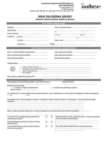 Towarzystwo Ubezpieczeń INTER Polska S.A. Biuro Odszkodowań Al. Jerozolimskie 172 02-486 Warszawa infolinia: 0 801 888 997, tel. (022) 333 77 88, fax. (022) 333 77 91 DRUK ZGŁOSZENIA SZKODY Kosztów leczenia podczas pobytu za granicą Dane osobowe ubezpieczonego Nazwisko: .................................................................................. Adres do korespondencji: ........................................................ Imię (imiona): ............................................................................ ....................................................................................……...... Imiona rodziców: ...................................................................... ................................................................................................. Nr telefonu do pracy: ............................................................. ....................................................................................…......... do domu: ........................................................... Adres e-mail: ............................................................................ Ulica Nr Kod pocztowy Miejscowość Kraj komórkowy: ...................................................... PESEL: ..................................................................................... Dane dotyczące dokumentu ubezpieczenia (polisy/certyfikatu) Seria i nr polisy/certyfikatu ubezpieczenia: ............................... Data rozpoczęcia podróży: ...................................................... Data wystawienia polisy/certyfikatu: ....................................... Data zakończenia podróży: ...................................................... Data rezerwacji podróży: ........................................................ Data opłacenia składki: ............................................................ Ubezpieczający: ............................................................................................................................................................................ miejsce opłacenia składki - Oddział INTER Polska S.A. w ....................................................................................................................... - Przedstawicielstwo INTER Polska S.A. w ........................................................................................................ - Agent Ubezpieczeniowy ............................................................................................................................... - Biuro podróży .................................................................................................................................................................. Data i godzina przekroczenia granicy RP: .................................................................................................................................... Szczegóły dotyczące szkody Data przyjęcia na leczenie/data wypadku i czas trwania leczenia Miejscowość/kraj ...................................................................................................... .................................................................................. Koszty leczenia powstałe: w związku z nagłym zachorowaniem na skutek nieszczęśliwego wypadku nazwa choroby: ........................................ Czy ubezpieczony w chwili wypadku był po spożyciu alkoholu, użyciu narkotyków lub innych podobnie działających środków odurzających: Tak Nie Szczegółowy opis choroby/wypadku, włącznie z charakterem obrażeń (podać dokładnie i wyczerpująco, w razie potrzeby sporządzić załączniki) ..................................................................................................................................................................... ……………………………………………………………………………………………………………….....................…….… ………………………………………………………………………………………………………………........................….…. ……………………………………………………………………………………………………………………......................… …………………………………………………………………………………………………………………….....................…. Nazwy i adresy placówek medycznych, w których ubezpieczony leczył się przed zachorowaniem/wypadkiem: .....................… ……………………………………………………………………………………………………………………....................….. Tak Nie Czy był(a) Pan(i) hospitalizowany(a) wskutek tej Nazwisko lekarza i adres szpitala lub kliniki, z którego korzystał(a) choroby/tego wypadku? Pan(i) wskutek choroby/wypadku …………………………………………………………………………… Tak Nie Czy kontaktował(a) się Pan(i) z Centrum Pomocy …………………………………………………………………………… INTER Polska? …………………………………… Tak Nie Czy cierpiał(a) Pan(i) na taką samą lub podobną Kto i gdzie udzielił ubezpieczonemu pierwszej pomocy: chorobę w przeszłości? …………………………………………………………………………… ………………………………………………… Dane dotyczące szkody WYKAZ KOSZTÓW LECZENIA Data Wyszczególnienie Czy spodziewa się Pan(i) innych rachunków? Czy posiada Pan(i) inną polisę ubezpieczeniową, która obejmuje ochroną ubezpieczeniową to zdarzenie? Jeśli tak proszę podać szczegóły: Kwota w lokalnej walucie RAZEM: Tak Nie Tak Nie Kto zapłacił rachunek? Nazwa ubezpieczyciela: ..........................................................................……………........ Nr poli