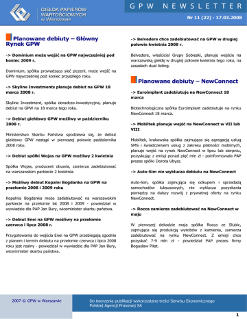 Nr 11 (22) - 17.03.2008 Planowane debiuty – Główny Rynek GPW -> Belvedere chce zadebiutować na GPW w drugiej połowie kwietnia 2008 r. -> Dominium moŜe wejść na GPW najwcześniej pod koniec 2009 r. Belvedere, właściciel Grupy Sobieski, planuje wejście na warszawską giełdę w drugiej połowie kwietnia tego roku, na zasadach dual listing. Dominium, spółka prowadząca sieć pizzerii, moŜe wejść na GPW najwcześniej pod koniec przyszłego roku. Planowane debiuty – NewConnect -> Skyline Investments planuje debiut na GPW 18 marca 2008 r. Skyline Investment, spółka doradczo-inwestycyjna, planuje debiut na GPW na 18 marca tego roku. -> Debiut giełdowy GPW moŜliwy w październiku 2008 r. Ministerstwo Skarbu Państwa spodziewa się, Ŝe debiut giełdowy GPW nastąpi w pierwszej połowie października 2008 roku. -> Debiut spółki Wojas na GPW moŜliwy 2 kwietnia Spółka Wojas, producent obuwia, zamierza zadebiutować na warszawskim parkiecie 2 kwietnia. -> MoŜliwy debiut Kopalni Bogdanka na GPW na przełomie 2008 i 2009 roku Kopalnia Bogdanka moŜe zadebiutować na warszawskim parkiecie na przełomie lat 2008 i 2009 - powiedział w wywiadzie dla PAP Jan Bury, wiceminister skarbu państwa. -> Debiut Enei na GPW moŜliwy na przełomie czerwca i lipca 2008 r. Przygotowania do wejścia Enei na GPW przebiegają zgodnie z planem i termin debiutu na przełomie czerwca i lipca 2008 roku jest realny - powiedział w wywiadzie dla PAP Jan Bury, wiceminister skarbu państwa. 2007 © GPW w Warszawie -> Euroimplant zadebiutuje na NewConnect 18 marca Biotechnologiczna spółka Euroimplant zadebiutuje na rynku NewConnect 18 marca. -> Mobiltek planuje wejść na NewConnect w VII lub VIII Mobiltek, krakowska spółka zajmująca się agregacją usług SMS i świadczeniem usług z zakresu płatności mobilnych, planuje wejść na rynek NewConnect w lipcu lub sierpniu, pozyskując z emisji ponad pięć mln zł - poinformowała PAP prezes spółki Dorota Ubysz. -> Auto-Sim nie wyklucza debiutu na NewConnect Auto-Sim, spółka zajmująca się odkupem i sprzedaŜą samochodów luksusowych, nie wyklucza pozyskania pieniędzy na dalszy rozwój z prywatnej oferty na rynku NewConnect. -> Rocca zamierza zadebiutować na NewConnect w maju W pierwszej dekadzie maja spółka Rocca ze Słubic, zajmująca się produkcją wyrobów z kamienia, zamierza zadebiutować na rynku NewConnect. Z emisji chce pozyskać 7-9 mln zł - powiedział PAP prezes firmy Bogusław Piłat. Do tworzenia publikacji wykorzystano treści Serwisu Ekonomicznego Polskiej Agencji Prasowej SA 1 Nr 11 (22) - 17.03.2008 Tydzień na rynku Wśród branŜ najwyŜszą tygodniową stopę zwrotu osiągnęły spółki z branŜy spoŜywczej (wzrost o 2,82%) i telekomunikacyjnej (w górę o 2,79%), najniŜszą zaś spółki z branŜy informatycznej (spadek o 0,92%). W tygodniu 10.03-14.03.2008 indeksy: • • • • • • • • • • WIG20 osiągnął na koniec tygodnia poziom 2.842,56 pkt (wzrost w porównaniu z poprzednim tygodniem o 0,70 proc.); średnia wartość obrotów (na sesję) wyniosła 911 mln zł; zawarto przeciętnie (na sesję) 14.941 transakcji - średnia wartość 1 transakcji to 30.497 zł; mWIG40 osiągnął na koniec tygodnia poziom 3.266,93 pkt (wzrost w porównaniu z poprzednim tygodniem o 2,18 proc.); średnia wartość obrotów (na sesję) wyniosła 153 mln zł; zawarto przeciętnie (na sesję) 5.090 transakcji – średnia wartość 1 transakcji to 15.057 zł; sWIG80 osiągnął na koniec tygodnia poziom 13.842,15 pkt (wzrost w porównaniu z poprzednim tygodniem o 0,27 proc.); średnia wartość obrotów (na sesję) wyniosła 85 mln zł; zawarto przeciętnie (na sesję) 7.297 transakcji – średnia wartość 1 transakcji to 5.825 zł; NCIndex osiągnął na koniec tygodnia 90,00 pkt (spadek w porównaniu z poprzednim tygodniem o 1,83 proc.) w porównaniu do wartości 91,68 pkt na zamknięcie poprzedniego tygodnia NajwyŜsze tygodniowe zmiany kursów : Kurs z Kurs z Akcje 07-03-08 14-03-08 06MAGNA 2,08 2,46 PCGUARD 0,06 0,07 INSTAL 5,65 6,59 PROCHEM 53,85 62,60 ASTARTA 39,56 45,98 2007 © GPW w Warszawie Zmiana (%) 18,27 16,67 16,64 16,25 16,23 GPW -> WSEInfoEngine S.A. przeprowadziła 2 transmisje internetowe Między 10 a 14 marca WSEInfoEngine S.A. przeprowadziła 2 transmisje internetowe. Informacje o transmisjach: Data Nazwa spółki transmisji zlecającej transmisje 13.03.2008 SII 14.03.2008 BRE Bank Temat transmisji Spotkanie z Zarządem Spółki Energoaparatura WZA -> WSEInfoEngine S.A. przeprowadzi 4 transmisje internetowe W najbliŜszym czasie WSEInfoEngine S.A. przeprowadzi 4 transmisje internetowe. Informacje o transmisjach: Data transmisji Nazwa spółki 18.03.2008 Euroimplant 19.03.2008 SII 19.03.2008 DFP Doradztwo Finansowe Millennium Bank 28.03.2008 Temat transmisji Debiut na NewConnect IPO Day Debiut na NewConnect WZA (po angielsku) Do tworzenia publikacji wykorzystano treści Serwisu Ekonomicznego Polskiej Agencji Prasowej SA 2 Nr 11 (22) - 17.03.2008 -> GPW podpisała aneks do umowy z DB Securities GPW podpisała aneks do umowy o dostęp do systemów informatycznych Giełdy z DB Securities w sprawie specjalnej zniŜki w opłatach za dane giełdowe udostępniane tzw. agentom firm inwestycyjnych, czyli osobom współpracującym z domami maklerskimi w pozyskiwaniu nowych inwestorów i w upowszechnianiu usług maklerskich. DB Securities jest drugim domem maklerskim (po ING Securities), który podpisał ww. aneks. Zarząd Giełdy zdecydował o wprowadzeniu zniŜki w celu ułatwienia Członkom Giełdy działań zmierzających do aktywizacji oraz zwiększania liczby inwestorów poprzez tworzenie i rozwój sieci sprzedaŜy. -> Uzupełnienie Listy Autoryzowanych Doradców NewConnect Zarząd Giełdy podjął uchwałę w sprawie wpisania spółki Kancelaria Radców Prawnych Plucińska Storczyk Mikulski Spółka Komandytowa na listę Autoryzowanych Doradców w alternatywnym systemie obrotu na rynku NewConnec