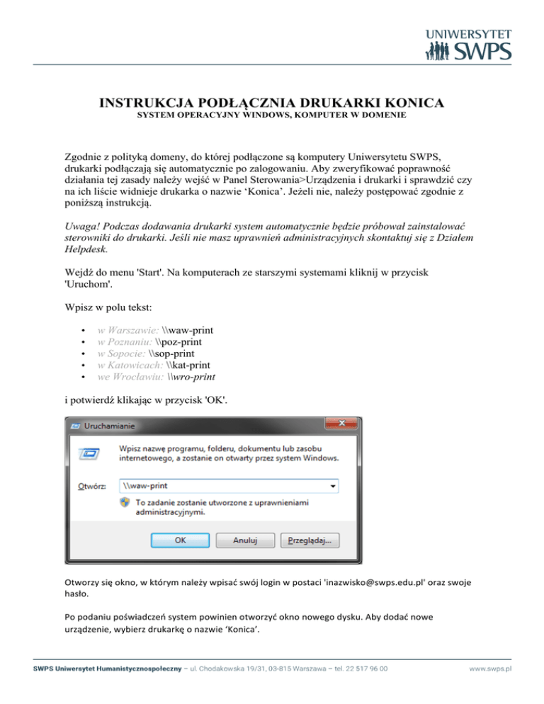 INSTRUKCJA PODŁĄCZNIA DRUKARKI KONICA SYSTEM OPERACYJNY WINDOWS, KOMPUTER W DOMENIE Zgodnie z polityką domeny, do której podłączone są komputery Uniwersytetu SWPS, drukarki podłączają się automatycznie po zalogowaniu. Aby zweryfikować poprawność działania tej zasady należy wejść w Panel Sterowania>Urządzenia i drukarki i sprawdzić czy na ich liście widnieje drukarka o nazwie ‘Konica’. Jeżeli nie, należy postępować zgodnie z poniższą instrukcją. Uwaga! Podczas dodawania drukarki system automatycznie będzie próbował zainstalować sterowniki do drukarki. Jeśli nie masz uprawnień administracyjnych skontaktuj się z Działem Helpdesk. Wejdź do menu 'Start'. Na komputerach ze starszymi systemami kliknij w przycisk 'Uruchom'. Wpisz w polu tekst: • • • • • w Warszawie: \\waw-print w Poznaniu: \\poz-print w Sopocie: \\sop-print w Katowicach: \\kat-print we Wrocławiu: \\wro-print i potwierdź klikając w przycisk 'OK'. Otworzy się okno, w którym należy wpisać swój login w postaci '[email protected]' oraz swoje hasło. Po podaniu poświadczeń system powinien otworzyć okno nowego dysku. Aby dodać nowe urządzenie, wybierz drukarkę o nazwie ‘Konica’. Jeśli wyświetli się puste okno z listą wydruku, oznacza to, że dodałeś drukarkę poprawnie. Teraz wystarczy tylko wydrukować dokument. W przypadku, gdy na ekranie pojawi się komunikat o potrzebie zainstalowania sterowników, prosimy o kontakt z Działem Helpdesk.
