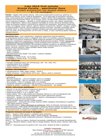 Lato 2016 first minute Grecja Paralia - aparthotel Zeus wczasy autokarem lub dojazd własny 9 i 12 noclegów Paralia - niegdyś mała wioska rybacka - dziś urocza miejscowość turystyczna, położona na południe od Salonik, na tzw. Riwierze Olimpijskiej - 70 km pasie plaż na wschodnim wybrzeżu kraju. Swoją popularność zawdzięcza błękitnym i ciepłym wodom Morza Egejskiego, łagodnemu klimatowi oraz stosunkowo niskim, jak na Grecję, cenom. Do tego Paralia obdarzona została przez naturę magicznym pięknem - odnaleźć tu można połączenie morza i gór, dające niesamowite walory krajobrazowe. Główna ulica, biegnąca równolegle do morza, ożywa po zachodzie słońca i staje się miejscem spotkań i wytchnienia po całodziennym plażowaniu. Wieczorami Paralia tętni życiem, przyciągając rzesze młodych, żądnych zabawy wczasowiczów. Sklepiki i stragany, otwarte do późnych godzin nocnych, oferują tradycyjne greckie przysmaki i pamiątki, pozwalając zabrać „kawałek Grecji” ze sobą. Ponadto w sklepach dostępna jest pełna gama galanterii skórzanej, futer oraz złota. W tej miejscowości nie ma mowy o nudzie, a urlop z pewnością będzie należał do niezapomnianych. Zakwaterowanie Aparthotel Zeus - nowo wybudowany i elegancko wyposażony budynek położony w spokojniejszej dzielnicy Paralii w odległości około 250 m od szerokiej i piaszczystej plaży oraz około 400 m od centrum miasteczka. Obiekt dysponuje pokojami 2/3 osobowymi, wszystkie są szykownie umeblowane wyposażone w łazienkę (Wc/prysznic/umywalka), TV/SAT, klimatyzację (dodatkowo płatna 5 euro/pokój/doba), pokoje posiadają aneks kuchenny z podstawowym wyposażeniem, lodówką kuchenką. We wszystkich pokojach są balkony ze stolikiem i krzesełkami. Aneks kuchenny o podstawowym wyposażeniu (lodówka, kuchenka gazowa lub elektryczna, garnki, naczynia, sztućce); należy posiadać własne środki czystości Dostępne opcje zakwaterowania: - studio 2 osobowe - studio 3 osobowe - dokwaterowanie (bez dopłat*) lub studio 1 osobowe (dopłata) dostępne turnusy: 9 noclegów w okresie 04.05 - 26.10.2016 12 noclegów w okresie 16.05 - 21.10.2016 Cena obejmuje • • • • transport autokarem klasy LUX (klimatyzacja, cafe - bar, video, WC) zakwaterowanie 9/12 noclegów opieka pilota w czasie podróży opieka rezydenta na miejscu Dopłaty obowiązkowe • ubezpieczenia KL, NNW, bagaż (utrata) - 45/50 zł • opłata serwisowo - kwaterunkowa 10/13 euro - płatne u pilota w autokarze Dopłaty opcjonalne • wyżywienie: BB (tylko śniadania) – 170 zł 9 noclegów, 210 zł 12 noclegów tylko obiadokolacje – 360 zł 9 noclegów, 440 zł 12 noclegów HB (2 posiłki) – 520 zł 9 noclegów, 630 zł 12 noclegów • możliwość wykupienia wyżywienia HB na miejscu u rezydenta (ok. 14 euro/dzień) • dopłata do pokoju 1-osobowego - 450/550 zł (dokwaterowanie – bez dopłat) Zniżki, informacje dodatkowe • • • • dziecko 0-2 lat (bez świadczeń hotelowych) płaci 400 zł dziecko 2-14 lat jako 3 i 4 os. w pokoju -20% osoba dorosła jako 3 i 4 os. w pokoju -10% dojazd własny -150 zł; daty pobytu przy dojeździe własnym to 2 dni od katalogowej daty rozpoczęcia imprezy i 2 dni przed katalogowym dniem zakończenia imprezy • dokumenty - paszport lub dowód osobisty - zgodnie z obowiązującymi przepisami (dostępne na stronie www.msz.gov.pl) • należy posiadać własne ręczniki i środki czystości • ubezpieczenie – oznaczenia [KL] koszty leczenia, [NNW] następstw nieszczęśliwych wypadków, [BP] bagaż podróżny (utrata) • *dokwaterowanie: Osoby wybierające się pojedynczo, które nie dokonały rezerwacji pokoju jednoosobowego, mogą zostać zakwaterowane z jedną lub kilkoma osobami tej samej płci, w tzw. opcji dokwaterowania, jednakże w przypadku gdy do 7 dni przed wyjazdem nie będzie innej osoby na dokwaterowanie wymagana jest dopłata do pokoju jednoosobowego. Program ramowy turnusy 9 noclegów Dzień 1 - Wyjazd z Polski zgodnie z rozkładem jazdy autokarów. Dzień 2 – Przejazd przez Słowację, Węgry, Serbię, Bułgarię / Macedonię. Dzień 3 – Przyjazd do Paralii w godzinach porannych. Spotkanie informacyjne z rezydentem. Zakwaterowanie. Dzień 3 – 12 - Pobyt na miejscu. Możliwość korzystania z dodatkowych wycieczek fakultatywnych, np. Ateny, Klasztory Meteory, Olimp, Rejs na Wyspę Skiathos, Wieczór grecki, Saloniki, Delfy, Rejs piracki. Dzień 12 - Wykwaterowanie do godziny 9.00. Czas wolny. Wyjazd do Polski w godzinach kontakt i rezerwacja: Biuro Podróży Busmarket ul. 3 Maja 36 40-097 Katowice e-mail: [email protected] tel./fax 32 253 86 34 tel. komórkowy 693 444 554 www.busmarket.turystyka.net i www.busmarket.turystyka.pl wieczornych. Dzień 13 – Przejazd przez Bułgarię / Macedonię, Serbię, Węgry, Słowację. Dzień 14 - Przyjazd do Polski – przekroczenie granicy na południu Polski w godzinach nocnych / porannych. Przyjazd do centralnej części kraju w godzinach porannych / przedpołudniowych. Informacje transportowe *Połączenia antenowe dodatkowo płatne, realizowane od 1 osoby, różnymi środkami transportu Miasto Adres Odjazd Gdynia Parking przy Teatrze Muzycznym, Plac Grunwaldzki *Połaczenie antenowe 18:00 Koszalin Dworzec Główny PKP, parking przed wejściem *Połaczenie antenowe 18:00 Gdańsk Parking przy Operze Bałtyckiej *Połaczenie antenowe 18:30 Szczecin Parking przy Teatrze Pleciuga, Plac Teatralny 1 *Połaczenie antenowe 19:00 Białystok Lublin 20:00 Parking przy MOSiR, Al. Zygmuntowskie 4 *Połaczenie antenowe Olsztyn Grudziądz 20:00 20:00 Stacja Shell, ul. Gen. J. Hallera 2 *Połaczenie antenowe 20:30 Piła Dworzec Główny PKP, parking przed wejściem *Połaczenie antenowe 20:30 Gorzów Wielkopolski Dworzec PKS, przed wejściem głównym *Połaczenie antenowe. 21:00 Bydgoszcz Hala Łucznicka, ul. Toruńska 59 *Połaczenie antenowe 21:30 Poznań Dworzec autobusowy MPK – Górczyn, ul. Zgoda 23:00 Toruń Dwor