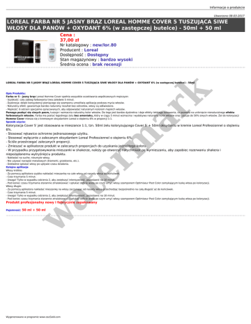Informacje o produkcie Utworzono 08-03-2017 LOREAL FARBA NR 5 JASNY BRĄZ LOREAL HOMME COVER 5 TUSZUJĄCA SIWE WŁOSY DLA PANÓW + OXYDANT 6% (w zastępczej butelce) - 50ml + 50 ml Cena : 37,00 zł Nr katalogowy : new/lor.80 Producent : Loreal Dostępność : Dostępny Stan magazynowy : bardzo wysoki Średnia ocena : brak recenzji er m ar k LOREAL FARBA NR 5 JASNY BRĄZ LOREAL HOMME COVER 5 TUSZUJĄCA SIWE WŁOSY DLA PANÓW + OXYDANT 6% (w zastępczej butelce) - 50ml Opis Produktu: Farba nr 5 - jasny brąz Loreal Homme Cover spełnia wszystkie oczekiwania współczesnych mężczyzn: - Szybkość: cały zabieg farbowania trwa zaledwie 5 minut. - Dyskrecja: dzięki konsystencji pieniącego się szamponu umożliwia aplikację podczas mycia włosów. - Naturalny efekt: gwarantuje bardzo naturalny rezultat bez odrostów, włosy są odświeżone. - Męskość: 6 odcieni specjalnie opracowanych, aby odpowiadać naturalnym kolorom męskich włosów. Pomaga pozbyć się siwych pasm, tuszuje i wzmacnia naturalny kolor włosów. Do tego jest bardzo dyskretna i daje efekty lekkiego tonowania, co pozwala na uniknięcie nienaturalnego efektu farbowanych włosów. Farba ma postać łagodnego żelu bez amoniaku, który w ciągu 5 minut wzmacnia i wydobywa naturalny kolor włosów oraz tuszuje do 50% siwych włosów. Żel do koloryzacji Homme Cover miesza się z kremowym oksydantem Loreal o stężeniu 6% w proporcji 1:1. Sposób użycia: Koloryzacja Cover 5′ jest stosowana w mieszance 1:1, tzn. 50ml żelu koloryzującego Cover 5′ + 50ml oksydantu w kremie Loreal Professionnel o stężeniu 6%. - Stosować rękawice ochronne jednorazowego użytku. - Stosować wyłącznie z zalecanym oksydantem Loreal Professionnel o stężeniu 6%. - Ściśle przestrzegać zalecanych proporcji. - Zmieszać w aplikatorze produkt w zalecanych proporcjach do uzyskania jednolitego koloru. - W przypadku przygotowywania mieszanki w shakerze, należy go otworzyć natychmiast po wymieszaniu, aby zapobiec rozerwaniu shakera i niepożądanemu wytryśnięciu produktu. at - Nakładać na suche, nieumyte włosy. - Nie używać narzędzi metalowych (klamerki, grzebienie, etc.). - Dokładnie spłukać włosy po upływie czasu działania. Kolejne aplikacje Włosy krótkie: - Za pomocą aplikatora szybko nakładać mieszankę na całe włosy od nasady włosa do końcówek. - Czas trzymania 5 minut. - Uwaga! Tylko w wypadku odcienia 2, aby zwiększyć intensywność, pozostawić na 10 minut. - Pod koniec czasu trzymania starannie zmalaksować i spłukać obficie wodą po czym umyć włosy szamponem Optimiseur Post Color zamykającym łuskę włosa po koloryzacji. Włosy długie: - Za pomocą aplikatora nakładać mieszankę na włosy zaczynając od nasady włosa przechodząc bezpośrednio na całą długość aż do końcówek. - Czas trzymania 5 minut. - Uwaga! Tylko w wypadku odcienia 2, aby zwiększyć intensywność, pozostawić na 10 minut. - Pod koniec czasu trzymania starannie zmalaksować i spłukać obficie wodą po czym umyć włosy szamponem Optimiseur Post Color zamykającym łuskę włosa po koloryzacji. Produkt profesjonalny nowy i fabrycznie zapakowany 50 ml + 50 ml w Pojemność: Wygenerowano w programie www.oscGold.com