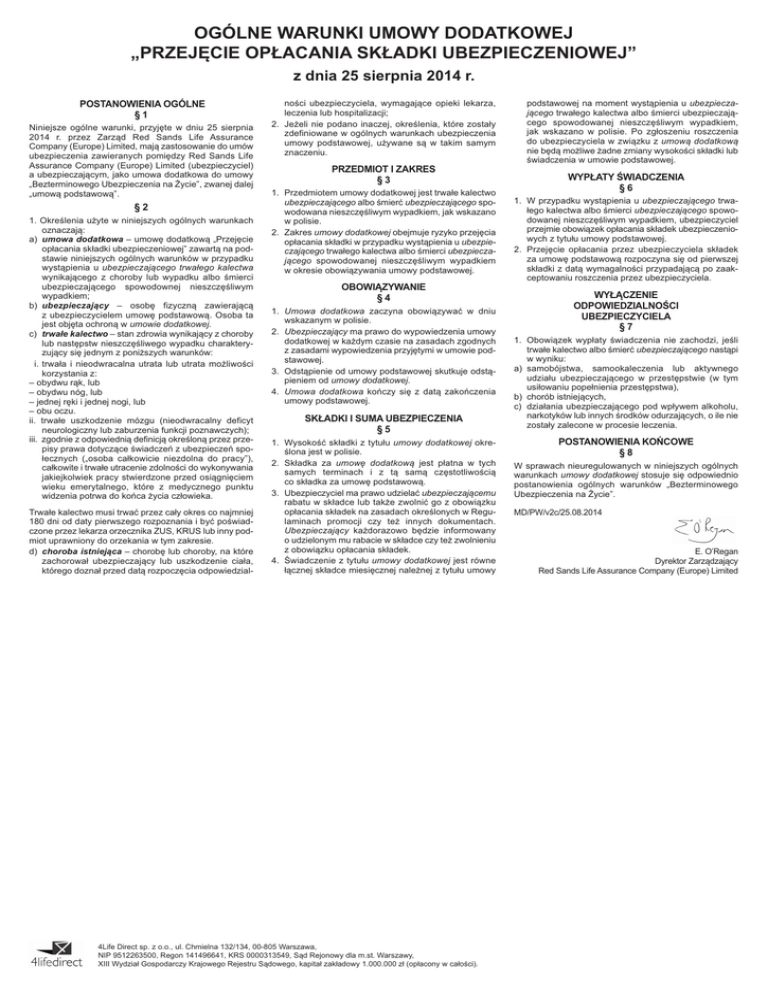 OGÓLNE WARUNKI UMOWY DODATKOWEJ „PRZEJĘCIE OPŁACANIA SKŁADKI UBEZPIECZENIOWEJ” z dnia 25 sierpnia 2014 r. POSTANOWIENIA OGÓLNE §1 Niniejsze ogólne warunki, przyjęte w dniu 25 sierpnia 2014 r. przez Zarząd Red Sands Life Assurance Company (Europe) Limited, mają zastosowanie do umów ubezpieczenia zawieranych pomiędzy Red Sands Life Assurance Company (Europe) Limited (ubezpieczyciel) a ubezpieczającym, jako umowa dodatkowa do umowy „Bezterminowego Ubezpieczenia na Życie”, zwanej dalej „umową podstawową”. §2 1. Określenia użyte w niniejszych ogólnych warunkach oznaczają: a) umowa dodatkowa – umowę dodatkową „Przejęcie opłacania składki ubezpieczeniowej” zawartą na podstawie niniejszych ogólnych warunków w przypadku wystąpienia u ubezpieczającego trwałego kalectwa wynikającego z choroby lub wypadku albo śmierci ubezpieczającego spowodownej nieszczęśliwym wypadkiem; b) ubezpieczający – osobę fizyczną zawierającą z ubezpieczycielem umowę podstawową. Osoba ta jest objęta ochroną w umowie dodatkowej. c) trwałe kalectwo – stan zdrowia wynikający z choroby lub następstw nieszczęśliwego wypadku charakteryzujący się jednym z poniższych warunków: i. trwała i nieodwracalna utrata lub utrata możliwości korzystania z: – obydwu rąk, lub – obydwu nóg, lub – jednej ręki i jednej nogi, lub – obu oczu. ii. trwałe uszkodzenie mózgu (nieodwracalny deficyt neurologiczny lub zaburzenia funkcji poznawczych); iii. zgodnie z odpowiednią definicją określoną przez przepisy prawa dotyczące świadczeń z ubezpieczeń społecznych („osoba całkowicie niezdolna do pracy”), całkowite i trwałe utracenie zdolności do wykonywania jakiejkolwiek pracy stwierdzone przed osiągnięciem wieku emerytalnego, które z medycznego punktu widzenia potrwa do końca życia człowieka. Trwałe kalectwo musi trwać przez cały okres co najmniej 180 dni od daty pierwszego rozpoznania i być poświadczone przez lekarza orzecznika ZUS, KRUS lub inny podmiot uprawniony do orzekania w tym zakresie. d) choroba istniejąca – chorobę lub choroby, na które zachorował ubezpieczający lub uszkodzenie ciała, którego doznał przed datą rozpoczęcia odpowiedzial- ności ubezpieczyciela, wymagające opieki lekarza, leczenia lub hospitalizacji; 2. Jeżeli nie podano inaczej, określenia, które zostały zdefiniowane w ogólnych warunkach ubezpieczenia umowy podstawowej, używane są w takim samym znaczeniu. PRZEDMIOT I ZAKRES §3 1. Przedmiotem umowy dodatkowej jest trwałe kalectwo ubezpieczającego albo śmierć ubezpieczającego spowodowana nieszczęśliwym wypadkiem, jak wskazano w polisie. 2. Zakres umowy dodatkowej obejmuje ryzyko przejęcia opłacania składki w przypadku wystąpienia u ubezpieczającego trwałego kalectwa albo śmierci ubezpieczającego spowodowanej nieszczęśliwym wypadkiem w okresie obowiązywania umowy podstawowej. OBOWIĄZYWANIE §4 1. Umowa dodatkowa zaczyna obowiązywać w dniu wskazanym w polisie. 2. Ubezpieczający ma prawo do wypowiedzenia umowy dodatkowej w każdym czasie na zasadach zgodnych z zasadami wypowiedzenia przyjętymi w umowie podstawowej. 3. Odstąpienie od umowy podstawowej skutkuje odstąpieniem od umowy dodatkowej. 4. Umowa dodatkowa kończy się z datą zakończenia umowy podstawowej. SKŁADKI I SUMA UBEZPIECZENIA §5 1. Wysokość składki z tytułu umowy dodatkowej określona jest w polisie. 2. Składka za umowę dodatkową jest płatna w tych samych terminach i z tą samą częstotliwością co składka za umowę podstawową. 3. Ubezpieczyciel ma prawo udzielać ubezpieczającemu rabatu w składce lub także zwolnić go z obowiązku opłacania składek na zasadach określonych w Regulaminach promocji czy też innych dokumentach. Ubezpieczający każdorazowo będzie informowany o udzielonym mu rabacie w składce czy też zwolnieniu z obowiązku opłacania składek. 4. Świadczenie z tytułu umowy dodatkowej jest równe łącznej składce miesięcznej należnej z tytułu umowy 4Life Direct sp. z o.o., ul. Chmielna 132/134, 00-805 Warszawa, NIP 9512263500, Regon 141496641, KRS 0000313549, Sąd Rejonowy dla m.st. Warszawy, XIII Wydział Gospodarczy Krajowego Rejestru Sądowego, kapitał zakładowy 1.000.000 zł (opłacony w całości). podstawowej na moment wystąpienia u ubezpieczającego trwałego kalectwa albo śmierci ubezpieczającego spowodowanej nieszczęśliwym wypadkiem, jak wskazano w polisie. Po zgłoszeniu roszczenia do ubezpieczyciela w związku z umową dodatkową nie będą możliwe żadne zmiany wysokości składki lub świadczenia w umowie podstawowej. WYPŁATY ŚWIADCZENIA §6 1. W przypadku wystąpienia u ubezpieczającego trwałego kalectwa albo śmierci ubezpieczającego spowodowanej nieszczęśliwym wypadkiem, ubezpieczyciel przejmie obowiązek opłacania składek ubezpieczeniowych z tytułu umowy podstawowej. 2. Przejęcie opłacania przez ubezpieczyciela składek za umowę podstawową rozpoczyna się od pierwszej składki z datą wymagalności przypadającą po zaakceptowaniu roszczenia przez ubezpieczyciela. WYŁĄCZENIE ODPOWIEDZIALNOŚCI UBEZPIECZYCIELA §7 1. Obowiązek wypłaty świadczenia nie zachodzi, jeśli trwałe kalectwo albo śmierć ubezpieczającego nastąpi w wyniku: a) samobójstwa, samookaleczenia lub aktywnego udziału ubezpieczającego w przestępstwie (w tym usiłowaniu popełnienia przestępstwa), b) chorób istniejących, c) działania ubezpieczającego pod wpływem alkoholu, narkotyków lub innych środków odurzających, o ile nie zostały zalecone w procesie leczenia. POSTANOWIENIA KOŃCOWE §8 W sprawach nieuregulowanych w niniejszych ogólnych warunkach umowy dodatkowej stosuje się odpowiednio postanowienia ogólnych warunków „Bezterminowego Ubezpieczenia na Życie”. MD/PW/v2c/25.08.2014 E. O’Regan Dyrektor Zarządzający Red Sands Life Assurance Company (Europe) Limited