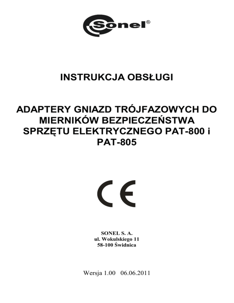 INSTRUKCJA OBSŁUGI ADAPTERY GNIAZD TRÓJFAZOWYCH DO MIERNIKÓW BEZPIECZEŃSTWA SPRZĘTU ELEKTRYCZNEGO PAT-800 i PAT-805 SONEL S. A. ul. Wokulskiego 11 58-100 Świdnica Wersja 1.00 06.06.2011 Instrukcja dotyczy adapterów stanowiących akcesoria pomiarowe do mierników bezpieczeństwa urządzeń elektrycznych PAT-800 i PAT-805. UWAGA: Adaptery przeznaczone są do pomiarów wykonywanych miernikami PAT-800/805. Nie zaleca się użycia ich w innych zastosowaniach. Adaptery gniazd przemysłowych 16A – WAADAPAT16F1 • • 32A – WAADAPAT32F1 Adaptery przeznaczone są do badań bezpieczeństwa urządzeń zasilanych z gniazd przemysłowych 16A i 32A o ile urządzenie badane nie pobiera prądu większego niż 16A. Adaptery umożliwiają wykonywanie wszystkich pomiarów dostępnych w przyrządach PAT800/805 na gnieździe sieciowym pomiarowym. UWAGA: Przy wykorzystaniu adaptera do pomiaru RPE należy liczyć się z zawyżeniem wyniku pomiaru o rezystancję adaptera. Adaptery gniazd trójfazowych Nieprzełączane 16A – WAADAPAT16P • 2 32A – WAADAPAT32P Adaptery te mają na stałe zwarte ze sobą linie L1, L2, L3 gniazda trójfazowego i połączone z linią L wtyku jednofazowego. INSTRUKCJA OBSŁUGI ADAPTERY PAT-800/805 wersja 1.00 Przełączane 16A – WAADAPAT16PR 32A – WAADAPAT32PR • W adapterach tych zastosowano przełącznik obrotowy umożliwiający połączenia jak na poniższym rysunku: • Adaptery gniazd trójfazowych przeznaczone są do badań bezpieczeństwa urządzeń zasilanych z gniazd trójfazowych 16A i 32A. • Adaptery można stosować do następujących pomiarów: o pomiar rezystancji przewodu ochronnego RPE (200mA, 10A, 25A), o pomiar rezystancji izolacji RISO (100V, 250V, 500V), o pomiar zastępczego prądu upływu ISUB, o pomiar dotykowego prądu upływu IT. • Adapterów - z wyjątkiem adaptera gniazd przemysłowych 16A - nie wolno stosować do pomiarów: o pomiar prądu upływu PE, o pomiar różnicowego prądu upływu IΔ, o pomiar mocy i poboru prądu, o pomiar automatyczny zawierający w/w pomiary. W tych przypadkach idea pomiaru zakłada zasilanie urządzenia badanego z gniazda sieciowego pomiarowego. W przypadku urządzeń trójfazowych jest to niemożliwe. Ponadto, jeżeli pobór prądu z gniazda pomiarowego przekroczy 16A nastąpi przepalenie wymiennych bezpieczników w przyrządzie PAT. UWAGA: Przy wykorzystaniu adaptera do pomiaru RPE należy liczyć się z zawyżeniem wyniku pomiaru o rezystancję adaptera. INSTRUKCJA OBSŁUGI ADAPTERY PAT-800/805 wersja 1.00 3 Pozostałe parametry adapterów: Imax = 16A Umax = 265V stopień ochrony obudowy IP40 Producent Producentem przyrządu prowadzącym serwis gwarancyjny i pogwarancyjny jest: SONEL S. A. ul. Wokulskiego 11 58-100 Świdnica tel. (0-74) 858 38 78 (Dział Handlowy) (0-74) 858 38 79 (Serwis) fax (0-74) 858 38 08 e-mail: [email protected] internet: www.sonel.pl Uwaga: Do prowadzenia napraw serwisowych upoważniony jest jedynie producent. 4 INSTRUKCJA OBSŁUGI ADAPTERY PAT-800/805 wersja 1.00