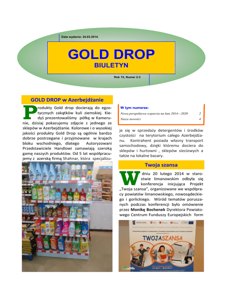 Data wydania: 24.03.2014. GOLD DROP BIULETYN Rok 15, Numer 2-3 GOLD DROP w Azerbejdżanie P rodukty Gold drop docierają do egzotycznych zakątków kuli ziemskiej. Kiedyś prezentowaliśmy półkę w Kamerunie, dzisiaj pokazujemy zdjęcie z jednego ze sklepów w Azerbejdżanie. Kolorowe i o wysokiej jakości produkty Gold Drop są ogólnie bardzo dobrze postrzegane i przyjmowane w krajach bloku wschodniego, dlatego Autoryzowani Przedstawiciele Handlowi zamawiają szeroką gamę naszych produktów. Od 5 lat współpracujemy z azerską firmą Shahnar, która specjalizu- W tym numerze: Nowa perspektywa wsparcia na lata 2014—2020 2 Nasze nowości 4 je się w sprzedaży detergentów i środków czystości na terytorium całego Azerbejdżanu. Kontrahent posiada własny transport samochodowy, dzięki któremu dociera do sklepów i hurtowni , sklepów sieciowych a także na lokalne bazary. W Twoja szansa dniu 20 lutego 2014 w starostwie limanowskim odbyła się konferencja inicjująca Projekt „Twoja szansa”, organizowane we współpracy powiatów limanowskiego, nowosądeckiego i gorlickiego. Wśród tematów poruszanych podczas konferencji było omówienie przez Monikę Bochenek Dyrektora Powiatowego Centrum Funduszy Europejskich form (Ciąg dalszy ze strony 1) wsparcia dla przedsiębiorców w nowej perspektywie 2014 – 2020. Twoja Szansa czyli projekt współfinansowany przez Unię Europejską w ramach Europejskiego Funduszu Społecznego Działanie 8.1 Rozwój pracowników i przedsiębiorstw w regionie Poddziałanie 8.1.2 Wsparcie procesów adaptacyjnych i modernizacyjnych w regionie kierowany jest do osób zwolnionych, przewidzianych do zwolnienia lub zagrożonych zwolnieniem z pracy z przyczyn dotyczących zakładu pracy, osób odchodzących z rolnictwa, które zwiększą dzięki niemu swoje możliwości pozostania na rynku pracy lub powrotu na rynek pracy oraz wsparcie pracodawców przechodzących procesy modernizacyjne i adaptacyjne. W ramach projektu można uzyskać: bezzwrotną dotację do 40.000 zł na podjęcie działalności gospodarczej dla osób zwolnionych z pracy z przyczyn pracodawcy w okresie nie dłuższym niż 6 m-cy przed przystąpieniem do projektu; szkolenia, poradnictwo zawodowe, pośrednictwo pracy, staże i praktyki zawodowe przygotowujące do podjęcia pracy w nowym zawodzie dla osób zwolnionych w okresie nie dłuższym niż 6 m-cy, przewidzianych do zwolnienia lub zagrożonych zwolnieniem z przyczyn dotyczących zakładu pracy; szkolenia przekwalifikowujące oraz wsparcie doradcze w zakresie wyboru nowego zawodu i zdobycia nowych umiejętności zawodowych skierowane do pracowników tych pracodawców, którzy przechodzą procesy restrukturyzacyjne oraz do osób od- chodzących z rolnictwa; szkolenia i doradztwo wspomagające przeprowadzenie procesu zmiany profilu działalności przedsiębiorstwa oraz możliwości pozyskania środków zewnętrznych na rozwój firmy, skierowane do przedsiębiorców i ich pracowników. Jako prelegenta zaproszono Prezesa Zarządu Stanisława Gągałę, który omówił różne aspekty przedsiębiorczości zaczynając od rysu historycznego tworzenia się podwalin przedsiębiorczości , poprzez definicję przedsiębiorcy i różnych form własności, omówienia ciekawych ustaw probiznesowych uchwalonych po 1989 roku, kończąc na barierach blokujących rozwój przedsiębiorczości takich jak, gąszcz przepisów prawnych i finansowych, wysokie koszty pracy, nierówne traktowanie podmiotów gospodarczych, zatory płatnicze. Nowa perspektywa wsparcia na lata 2014-2020 P rzedstawiciele firmy Gold Drop wzięli udział w panelu dyskusyjnym na temat „Szans rozwoju małych i średnich firm w oparciu o Fundusze Europejskie w latach 2014-2020 oraz możliwości wykorzystania środków unijnych przez lokalne samorządy”. Spotkanie zorganizowane przez Regionalne Stowarzyszenie Przedsiębiorców odbyło się w Limanowej w dniu 13 marca 2014r. pod patronatem Marszałka Województwa Małopolskiego Marka Sowy poświęcone było omówieniu tematu wsparcia przedStr. 2 GOLD DROP BIULETYN siębiorczości w ramach Małopolskiego Regionalnego Programu Operacyjnego na lata 2014 -2020 przez Małopolskie Centrum Przedsiębiorczości oraz Małopolską Agencję Rozwoju Regionalnego. Spotkanie otworzył Prezes Stanisław Gągała wprowadzając zgromadzonych w tematykę dyskusji: „Nie jest łatwo osiągnąć rynkowy sukces. By go osiągnąć niezbędne są narzędzia i umiejętności w posługiwaniu się nimi. To czego potrzebują nasze firmy, zwłaszcza małe i średnie, które dominują w powiecie limanowskim: potrzebują kapitału ( to jest baza w Polsce i na świecie też). Jedni go potrzebują, by rozpocząć działalność, inni by ją zdynamizować, by doinwestować firmę także w sferze innowacyjności. trzeba posiadać wiedzę, skąd ten kapitał pozyskać. kapitał bardzo ważny, ale równie ważne jest wykorzystanie już posiadanego potencjału i zasobów wiedzy oraz strategii rynkowej. Wiele naszych firm umiało sięgnąć po unijne pieniądze i je właściwie wykorzystać, by stać się na rynku znaczącymi graczami. W nowej perspektywie wsparcia na lata 2014-2020 będzie jeszcze więcej euro. To wielka szansa dla przedsiębiorców, dla samorządów lokalnych i dla gospodarki (kolejnej takiej szansy nie będzie). Albo je wykorzystamy mądrze, albo je po prostu zmarnujemy” – przekonywał prezes. Rafał Solecki Dyrektor MCP podkreślił, że małopolscy przedsiębiorcy mają do wykorzystania 600 mln euro, które będą przeznaczone na gospodarkę opartą na wiedzy – wsparcie działalności badawczo – rozwojowej przedsiębiorstw, aktywną gospodarczo Małopolskę – tworzenie i rozbudowa infrastruktury na rzecz rozwoju przedsiębiorczości, promocja gospodarcza i turystyczna regionu oraz otwarty rynek pracy – dostoso- wanie kompetencji kadr do regionalnej gospodarki. Z kolei Wiceprezes MARRu Stanisław Bisztyga przekonywał, że „Dla sp