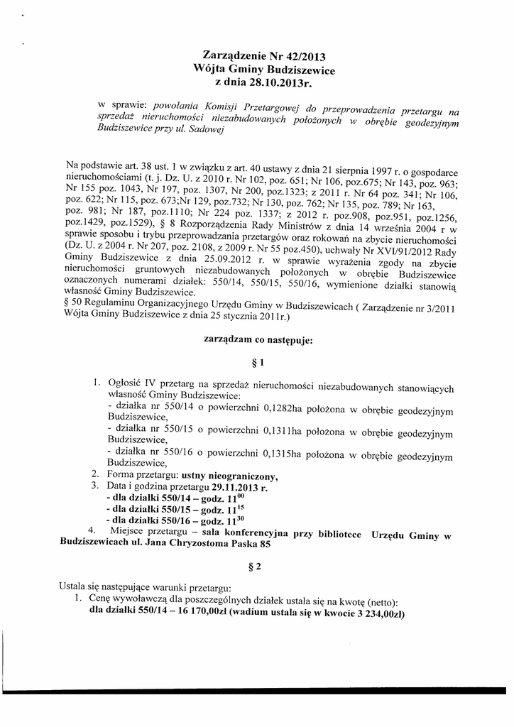 Zarzs|dzenie Nr 42/2013 Wojta Gminy Budziszewice z dnia 28.10.2013r. w sprawie: powolania Komisji Przetargowej do przeprowadzenia przetargu na sprzedaz nieruchomosci niezabudowanych polozonych w obre^bie geodezyjnym Budziszewice przy ul. Sadowej Na podstawie art. 38 ust. 1 w zwiqzku z art. 40 ustawy z dnia 21 sierpnia 1997 r. o gospodarce nieruchomosciami (t. j. Dz. U. z 2010 r. Nr 102, poz. 651; Nr 106, poz.675; Nr 143, poz. 963; Nr 155 poz. 1043, Nr 197, poz. 1307, Nr 200, poz.1323; z 2011 r. Nr 64 poz. 341; Nr 106, poz. 622; Nr 115, poz. 673;Nr 129, poz.732; Nr 130, poz. 762; Nr 135, poz. 789; Nr 163, poz. 981; Nr 187, poz. 1110; Nr 224 poz. 1337; z 2012 r. poz.908, poz.951, poz.1256, poz. 1429, poz. 1529), § 8 Rozporzaxlzenia Rady Ministrow z dnia 14 wrzesnia 2004 r w sprawie sposobu i trybu przeprowadzania przetargow oraz rokowan na zbycie nieruchomosci (Dz. U. z 2004 r. Nr 207, poz. 2108, z 2009 r. Nr 55 poz.450), uchwaly Nr XVI/91/2012 Rady Gminy Budziszewice z dnia 25.09.2012 r. w sprawie wyrazenia zgody na zbycie nieruchomosci gruntowych niezabudowanych polozonych w obr^bie Budziszewice oznaczonych numerami dzialek: 550/14, 550/15, 550/16, wymienione dzialki stanowia^ wlasnosc Gminy Budziszewice. § 50 Regulaminu Organizacyjnego Urz?du Gminy w Budziszewicach ( Zarza^dzenie nr 3/2011 Wqjta Gminy Budziszewice z dnia 25 stycznia 201 Ir.) zarzqdzam co nastepuje: §1 1. Oglosic IV przetarg na sprzedaz nieruchomosci niezabudowanych stanowia^cych wlasnosc Gminy Budziszewice: - dzialka nr 550/14 o powierzchni 0,1282ha polozona w obr?bie geodezyjnym Budziszewice, - dzialka nr 550/15 o powierzchni 0,1311 ha polozona w obr^bie geodezyjnym Budziszewice, - dzialka nr 550/16 o powierzchni 0,1315ha polozona w obr^bie geodezyjnym Budziszewice, 2. Forma przetargu: ustny nieograniczony, 3. Data i godzina przetargu 29.11.2013 r. - dla dzialki 550/14 - godz. 11°° - dla dzialki 550/15 - godz. II 15 - dla dzialki 550/16 - godz. II 30 4. Miejsce przetargu — sala konferencyjna przy bibliotece Urz^du Gminy w Budziszewicach ul. Jana Chryzostoma Paska 85 §2 Ustala si? nastejnya^ce warunki przetargu: 1. Cen? wywolawcza^ dla poszczegolnych dzialek ustala si? na kwot? (netto): dla dzialki 550/14 - 16 170,00zl (wadium ustala si£ w kwocie 3 234,00zl) dla dzialki 550/15-16 534,00zl (wadium ustala si£ w kwocie 3 306,80zl) dla dzialki 550/16-16 856,00zl (wadium ustala si£ w kwocie 3 371,20zl). 2.Warunkiem dopuszczenia do przetargu jest wplacenie wadium. 3. Wadium ustala si? w wysokosci nie przekraczajqpej 20% ceny wywolawczej. 4. Wadium nalezy wniesc: - w gotowce na rachunek bankowy najpozniej w dniu 28.11.2013 r. 5.Wadium wplacone przez oferenta, ktory przetarg wygral zostanie zaliczone na poczet ceny nabycia, zas pozostalym uczestmkom zostanie zwrocone nie pozniej niz przed uplywem trzech dni po zakonczeniu przetargu. 6. Wadium przepada na rzecz Gminy Budziszewice w przypadku gdy osoba, ktora przetarg wygrala uchyli si? od zawarcia umowy kupna - sprzedazy. 7. Zastrzega si? prawo odstapienia od przetargu bez podawania przyczyn. §3 Ogloszenie o przetargu z uwzgl?dnieniem postanowien niniejszego zarzajizenia oraz wymogow ustawy z dnia 21 sierpnia 1997r. o gospodarce nieruchomosciami (t. j. Dz. U. z 2010 r. Nr 102 poz. 651 ze zm.) i przepiso\v Rozporzqdzenia Rady Ministrdw z dnia 14 wrzesnia 2004 r. w sprawie sposobu i trybu przeprowadzania przetargow oraz rokowari na zbycie nieruchomosci (Dz. U. z 2004 r. Nr 207 poz. 2108 ze zm.) zostanie podane do publicznej wiadomosci najpozniej do dnia 26.8.2013 r. §4 1. Dla przeprowadzenia przetargu powoluje si? Komisj? Przetargow^. w skladzie: 1) Kotynia Zofia - Przewodniczqca 2) Jarecka Alina — Czlonek 3) Beata Kujawa — Czlonek 2. Komisja przeprowadzi przetarg w sposob okreslony w Rozporzaxlzeniu Rady Ministrow z dnia 14 wrzesnia 2004 r. w sprawie sposobu i trybu przeprowadzania przetargow oraz rokowan na zbycie nieruchomosci stanowia^cych wlasnosc Skarbu Panstwa lub wlasnosc jednostek samorza^du terytorialnego. §5 Zarzajizenie wchodzi w zycie z dniem podj?cia.