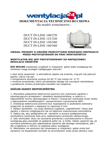 DOKUMENTACJA TECHNICZNO-RUCHOWA dla modeli wentylatorów : DUCT IN-LINE 100/270 DUCT IN-LINE 125/320 DUCT IN-LINE 150/560 DUCT IN-LINE 160/560 UWAGA: PROSIMY O UWAŻNE PRZECZYTANIE NINIEJSZEJ INSTRUKCJI PRZED PRZYSTĄPIENIEM DO PRAC MONTAŻOWYCH WENTYLATOR NIE JEST PRZYSTOSOWANY DO NAPIĘCIOWEJ REGULACJI OBORTÓW NIE WOLNO instalować urządzeń w miejscach, gdzie stale występują lub chwilowo mogą wystąpić następujące warunki: • zbyt duża zawartość w atmosferze olejów lub smarów, żrących lub palnych gazów, cieczy lub par. • temperatura otoczenia wyższa niż 60 °C lub niższa niż -5 °C. • możliwe przeszkody, które utrudniałyby dostęp lub usunięcie wentylatora. • gwałtowne zmiany przekrojów kanałów lub zwężenia. OGÓLNE ZASADY BEZPIECZEŃSTWA 1. Wszystkie połączenia elektryczne powinny być wykonane zgodnie z obowiązującymi przepisami i zasadami bezpieczeństwa, w oparciu o odpowiednie normy obowiązujące w Polsce i muszą być wykonane przez osoby z odpowiednimi kwalifikacjami i uprawnieniami (uprawnienia SEP). 2. Instalacja elektryczna powinna być wyposażona w podwójnie izolowany wyłącznik ze stykami o separacji co najmniej 3 mm. 3. Należy sprawdzić, czy prąd zasilania (napięcie, częstotliwość i faza) jest zgodny z danymi znajdującymi się na tabliczce znamionowej wentylatora. 4. Zaleca się, aby podłączenie do zacisków w puszce podłączeniowej wentylatora wykonane było przy zastosowaniu przewodu elastycznego. 5. Gdy wentylator służy do usuwania powietrza z pomieszczenia w którym występują gazy powstałe ze spalania paliw np. w kotle, należy upewnić się, że wymiana powietrza jest odpowiednia zarówno dla samego wentylatora, jak i dla urządzenia w którym to spalanie paliw występuje. 6. Wentylator nie powinien być stosowany w miejscach, gdzie może być narażony na bezpośredni kontakt ze strumieniem wody przez dłuższy czas. 7. W przypadku, gdy wentylator kanałowy jest używany do usuwania powietrza o dużej zawartości wilgoci, odpływ kondensatu powinien być zamontowany. Przewody powinny być nachylone lekko w dół w kierunku od wentylatora. 8. Urządzenie nie jest przeznaczone do użytku przez dzieci lub osoby niepełnosprawne bez odpowiedniego nadzoru ze strony opiekuna. INSTALACJA. Urządzenie przeznaczone jest do montażu jako wentylator kanałowy. Jeśli do montażu używane są przewody elastyczne to powinny one być w pełni rozciągnięte, aby uzyskać najlepsze rezultaty. Wentylator należy umiejscowić w najwyższym punkcie instalacji wentylacyjnej a kanały z obu jego końców powinny opadać lekko w dół w kierunku przeciwnym do tego punktu. Aby uzyskać dostęp do otworów montażowych, wykonaj następujące czynności: 1. Używając śrubokręta krzyżakowego, odchyl zaciski z tworzywa sztucznego przez odkręcenie dwóch śrub, jak pokazano na rysunku 1.wysuń korpus z zamontowanym silnikiem i wirnikiem, patrz rys. 2. 2. Wentylator można zamontować pod dowolnym kątem, korzystając z otworów montażowych Rys. 3,4,5,6. 3. Po odpowiednim zamocowaniu na stałe podstawy wentylatora, zamocuj z powrotem zespół silniko-wirnika, jak pokazano na rysunku 7.Zamknij ponownie czarne zaciski i umieść śruby na swoim miejscu, a następnie dokręć je, aby zablokować cały korpus, Rys. 8. PODŁĄCZENIE ELEKTRYCZNE. UWAGA: W CELU PRZEPROWADZENIA INSTALACJI, MONTAŻU LUB PRAC KONSERWACYJNYCH NALEŻY UPEWNIĆ SIĘ, ŻE URZĄDZENIE ORAZ EW. ELEMENT STERUJĄCY SĄ ODŁĄCZONE OD ŹRÓDŁA ZASILANIA. Wszystkie wentylatory DUCT IN-LINE posiadają podwójnie izolowaną obudowę. Modele te nie posiadają zacisku dla przewodu uziemiającego i nie mogą być uziemiane . 1. Odkręć śruby mocujące pokrywę puszki podłączeniowej i zdejmij ją, Rys. 9 2. Wykonaj odpowiednie podłączenie elektryczne zgodnie ze schematem (Rys. 10). 3. Sprawdź czy wszystkie połączenia zostały wykonane prawidłowo i upewnij się, że wszystkie przewody i zaciski są dobrze i należycie zamocowane. 4. Wpust dla kabli przyłączeniowych musi być wykonany przy użyciu dołączonego dławika. 5. Załóż z powrotem pokrywę puszki przyłączeniowej i przykręć ją. 6. Upewnij się, że wirnik obraca się prawidłowo i nie blokuje go żadna przeszkoda, Rys. 13 7. Użyj odpowiedniego zabezpieczenia elektrycznego (bezpiecznik) przed skutkami zwarć i przeciążeń w celu ochrony silnika i sieci zasilającej. W celu uzyskania biegu wysokiego należy podłączyć przewód do terminalu L2 (Rys. II) dla biegu niskiego podłącz przewód do terminalu L1 (Rys. I) Podłączenie wentylatora z przełącznikiem biegów np. P3 (Rys. III) UWAGA : Podłączenie pierwszego oraz drugiego biegu jednocześnie spowoduje spalenie wentylatora W CELU PRZEPROWADZENIA CZYSZCZENIA LUB INNYCH PRAC KONSERWACYJNYCH NALEŻY UPEWNIĆ SIĘ, ŻE URZĄDZENIE ORAZ EW. ELEMENT STERUJĄCY SĄ ODŁĄCZONE OD ŹRÓDŁA ZASILANIA. 1.Należy w miarę możliwości przeciwdziałać gromadzeniu się kurzu/osadów na wentylatorze, gdyż ogranicza to możliwość odprowadzania ciepła przez silnik, a tym samym może prowadzić do jego uszkodzenia. Osadzony kurz i brud na łopatkach powoduje utratę prawidłowego wyważenia wirnika. Powoduje to skrócenie bezawaryjnego czasu pracy urządzenia. Czyszczenie należy wykonywać za pomocą ogólnodostępnych środków czyszczących nie powodujących uszkodzeń mechanicznych czy zwarć instalacji elektrycznej ani nie powodujących odbarwień lakieru czy też przyśpieszonej korozji. Nie należy stosować żrących środków chemicznych, ani ostrych przedmiotów, czy szczotek. Przy czyszczeniu wirnika zaleca się szczególną ostrożność ze względu na ostre krawędzie łopatek oraz elementy wyważenia, które nie powinny być zdejmowane ani przemieszczane. GWARANCJA 1. Produkty marki Cata objęte są gwarancją producenta w okresie 24-miesięcy licząc od dnia sprzedaży. 2. Gwarancją objęte są ukryte wady produkcyjne wyrobów.
