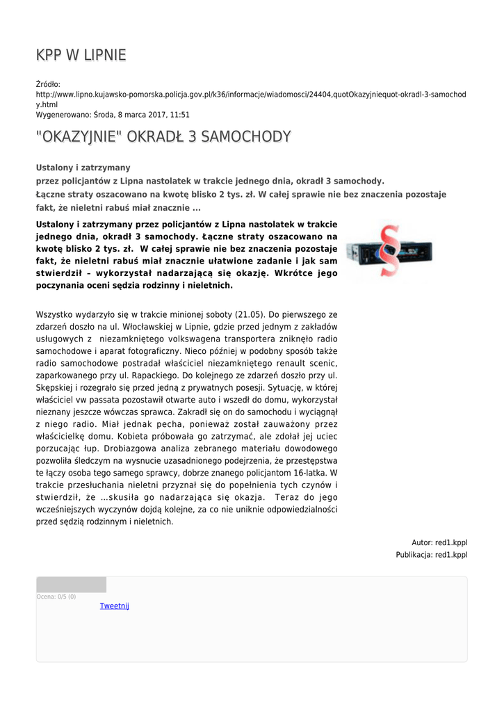 KPP W LIPNIE Źródło: http://www.lipno.kujawsko-pomorska.policja.gov.pl/k36/informacje/wiadomosci/24404,quotOkazyjniequot-okradl-3-samochod y.html Wygenerowano: Środa, 8 marca 2017, 11:51 "OKAZYJNIE" OKRADŁ 3 SAMOCHODY Ustalony i zatrzymany przez policjantów z Lipna nastolatek w trakcie jednego dnia, okradł 3 samochody. Łączne straty oszacowano na kwotę blisko 2 tys. zł. W całej sprawie nie bez znaczenia pozostaje fakt, że nieletni rabuś miał znacznie ... Ustalony i zatrzymany przez policjantów z Lipna nastolatek w trakcie jednego dnia, okradł 3 samochody. Łączne straty oszacowano na kwotę blisko 2 tys. zł. W całej sprawie nie bez znaczenia pozostaje fakt, że nieletni rabuś miał znacznie ułatwione zadanie i jak sam stwierdził – wykorzystał nadarzającą się okazję. Wkrótce jego poczynania oceni sędzia rodzinny i nieletnich. Wszystko wydarzyło się w trakcie minionej soboty (21.05). Do pierwszego ze zdarzeń doszło na ul. Włocławskiej w Lipnie, gdzie przed jednym z zakładów usługowych z niezamkniętego volkswagena transportera zniknęło radio samochodowe i aparat fotograficzny. Nieco później w podobny sposób także radio samochodowe postradał właściciel niezamkniętego renault scenic, zaparkowanego przy ul. Rapackiego. Do kolejnego ze zdarzeń doszło przy ul. Skępskiej i rozegrało się przed jedną z prywatnych posesji. Sytuację, w której właściciel vw passata pozostawił otwarte auto i wszedł do domu, wykorzystał nieznany jeszcze wówczas sprawca. Zakradł się on do samochodu i wyciągnął z niego radio. Miał jednak pecha, ponieważ został zauważony przez właścicielkę domu. Kobieta próbowała go zatrzymać, ale zdołał jej uciec porzucając łup. Drobiazgowa analiza zebranego materiału dowodowego pozwoliła śledczym na wysnucie uzasadnionego podejrzenia, że przestępstwa te łączy osoba tego samego sprawcy, dobrze znanego policjantom 16-latka. W trakcie przesłuchania nieletni przyznał się do popełnienia tych czynów i stwierdził, że …skusiła go nadarzająca się okazja. Teraz do jego wcześniejszych wyczynów dojdą kolejne, za co nie uniknie odpowiedzialności przed sędzią rodzinnym i nieletnich. Autor: red1.kppl Publikacja: red1.kppl Ocena: 0/5 (0) Tweetnij