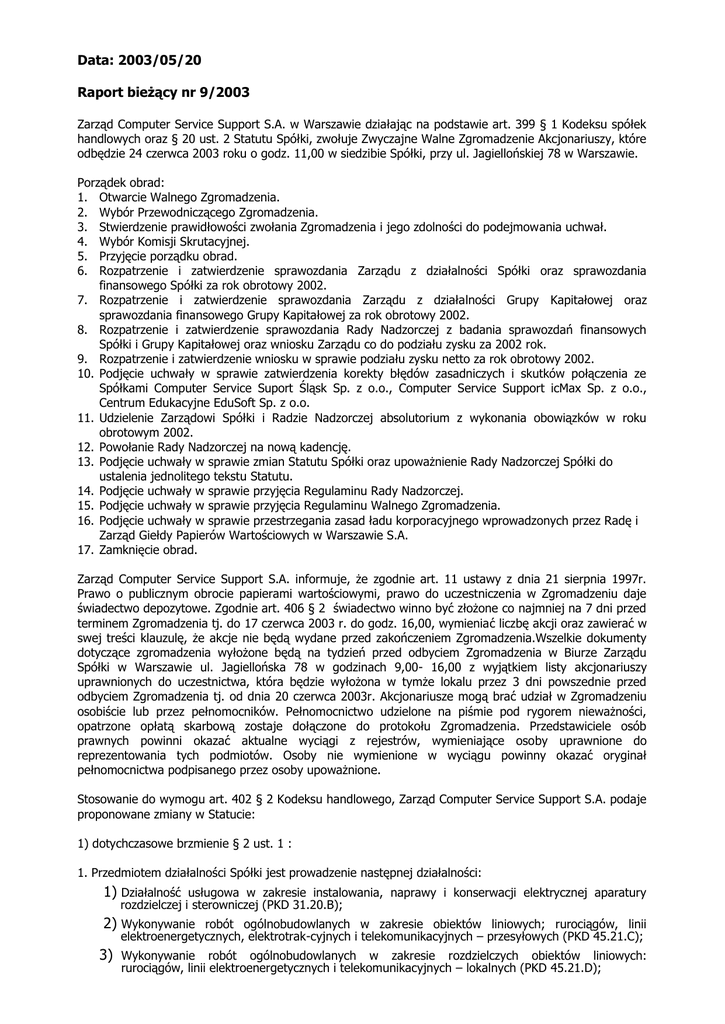 Data: 2003/05/20 Raport bieżący nr 9/2003 Zarząd Computer Service Support S.A. w Warszawie działając na podstawie art. 399 § 1 Kodeksu spółek handlowych oraz § 20 ust. 2 Statutu Spółki, zwołuje Zwyczajne Walne Zgromadzenie Akcjonariuszy, które odbędzie 24 czerwca 2003 roku o godz. 11,00 w siedzibie Spółki, przy ul. Jagiellońskiej 78 w Warszawie. Porządek obrad: 1. Otwarcie Walnego Zgromadzenia. 2. Wybór Przewodniczącego Zgromadzenia. 3. Stwierdzenie prawidłowości zwołania Zgromadzenia i jego zdolności do podejmowania uchwał. 4. Wybór Komisji Skrutacyjnej. 5. Przyjęcie porządku obrad. 6. Rozpatrzenie i zatwierdzenie sprawozdania Zarządu z działalności Spółki oraz sprawozdania finansowego Spółki za rok obrotowy 2002. 7. Rozpatrzenie i zatwierdzenie sprawozdania Zarządu z działalności Grupy Kapitałowej oraz sprawozdania finansowego Grupy Kapitałowej za rok obrotowy 2002. 8. Rozpatrzenie i zatwierdzenie sprawozdania Rady Nadzorczej z badania sprawozdań finansowych Spółki i Grupy Kapitałowej oraz wniosku Zarządu co do podziału zysku za 2002 rok. 9. Rozpatrzenie i zatwierdzenie wniosku w sprawie podziału zysku netto za rok obrotowy 2002. 10. Podjęcie uchwały w sprawie zatwierdzenia korekty błędów zasadniczych i skutków połączenia ze Spółkami Computer Service Suport Śląsk Sp. z o.o., Computer Service Support icMax Sp. z o.o., Centrum Edukacyjne EduSoft Sp. z o.o. 11. Udzielenie Zarządowi Spółki i Radzie Nadzorczej absolutorium z wykonania obowiązków w roku obrotowym 2002. 12. Powołanie Rady Nadzorczej na nową kadencję. 13. Podjęcie uchwały w sprawie zmian Statutu Spółki oraz upoważnienie Rady Nadzorczej Spółki do ustalenia jednolitego tekstu Statutu. 14. Podjęcie uchwały w sprawie przyjęcia Regulaminu Rady Nadzorczej. 15. Podjęcie uchwały w sprawie przyjęcia Regulaminu Walnego Zgromadzenia. 16. Podjęcie uchwały w sprawie przestrzegania zasad ładu korporacyjnego wprowadzonych przez Radę i Zarząd Giełdy Papierów Wartościowych w Warszawie S.A. 17. Zamknięcie obrad. Zarząd Computer Service Support S.A. informuje, że zgodnie art. 11 ustawy z dnia 21 sierpnia 1997r. Prawo o publicznym obrocie papierami wartościowymi, prawo do uczestniczenia w Zgromadzeniu daje świadectwo depozytowe. Zgodnie art. 406 § 2 świadectwo winno być złożone co najmniej na 7 dni przed terminem Zgromadzenia tj. do 17 czerwca 2003 r. do godz. 16,00, wymieniać liczbę akcji oraz zawierać w swej treści klauzulę, że akcje nie będą wydane przed zakończeniem Zgromadzenia.Wszelkie dokumenty dotyczące zgromadzenia wyłożone będą na tydzień przed odbyciem Zgromadzenia w Biurze Zarządu Spółki w Warszawie ul. Jagiellońska 78 w godzinach 9,00- 16,00 z wyjątkiem listy akcjonariuszy uprawnionych do uczestnictwa, która będzie wyłożona w tymże lokalu przez 3 dni powszednie przed odbyciem Zgromadzenia tj. od dnia 20 czerwca 2003r. Akcjonariusze mogą brać udział w Zgromadzeniu osobiście lub przez pełnomocników. Pełnomocnictwo udzielone na piśmie pod rygorem nieważności, opatrzone opłatą skarbową zostaje dołączone do protokołu Zgromadzenia. Przedstawiciele osób prawnych powinni okazać aktualne wyciągi z rejestrów, wymieniające osoby uprawnione do reprezentowania tych podmiotów. Osoby nie wymienione w wyciągu powinny okazać oryginał pełnomocnictwa podpisanego przez osoby upoważnione. Stosowanie do wymogu art. 402 § 2 Kodeksu handlowego, Zarząd Computer Service Support S.A. podaje proponowane zmiany w Statucie: 1) dotychczasowe brzmienie § 2 ust. 1 : 1. Przedmiotem działalności Spółki jest prowadzenie następnej działalności: 1) Działalność usługowa w zakresie instalowania, naprawy i konserwacji elektrycznej aparatury rozdzielczej i sterowniczej (PKD 31.20.B); 2) Wykonywanie robót ogólnobudowlanych w zakresie obiektów liniowych; rurociągów, linii elektroenergetycznych, elektrotrak-cyjnych i telekomunikacyjnych – przesyłowych (PKD 45.21.C); 3) Wykonywanie robót ogólnobudowlanych w zakresie rozdzielczych obiektów liniowych: rurociągów, linii elektroenergetycznych i telekomunikacyjnych – lokalnych (PKD 45.21.D); 4) Wykonywanie instalacji budowlanych (PKD 45.3); 5) Wykonywanie robót budowlanych wykończeniowych (PKD 45.4); 6) Towarowy transport drogowy pojazdami uniwersalnymi (PKD 60.24.B); 7) Przeładunek, magazynowanie i przechowywanie towarów (PKD: 63.1); 8) Magazynowanie i przechowywanie towarów w pozostałych składowiskach (PKD 63.12.C); 9) Działalność pozostałych agencji transportowych (PKD: 63.40.C); 10) Transmisja danych i teleinformatyka (PKD 64.20.C); 11) Pozostałe usługi telekomunikacyjne (PKD 64.20.G); 12) Wynajem maszyn i urządzeń biurowych (PKD 71.33.Z); 13) Informatyka (PKD 72); 14) Reklama (PKD 74.40.Z); 15) Pozaszkolne formy kształcenia gdzie indziej nie sklasyfikowane (PKD 80.42.Z). 16) Działalność rachunkowo – księgowa (PKD 74.12.Z); 17) Doradztwo w zakresie sprzętu komputerowego (PKD 72.10.Z); 18) Przetwarzanie danych (PKD 72.30.Z); 19) Działalność związana z bazami danych (PKD 72.40.Z); 20) Pozostała działalność związana z informatyką (PKD 72.60.Z). proponowane brzmienie § 2 ust. 1: 1. Przedmiotem działalności Spółki jest prowadzenie następnej działalności: 1) 2) 3) 4) 45.31.D. Wykonywanie pozostałych instalacji elektrycznych 45.31.D .Wykonywanie pozostałych robót budowlanych wykończeniowych 51.64.Z Sprzedaż hurtowa maszyn i urządzeń biurowych 52.48.A Sprzedaż detaliczna mebli, wyposażenia biurowego, komputerów oraz sprzętu telekomunikacyjnego 5) 60.24.B Towarowy transport drogowy pojazdami uniwersalnymi 6) 63.12.C Magazynowanie i przechowywanie towarów w pozostałych składowiskach 7) 64.20.C Transmisja danych i teleinformatyka 8) 64.20.G Pozostałe usługi telekomunikacyjne 9) 71.33.Z Wynajem maszyn i urządzeń biurowych 10) 72.10.Z Doradztwo w zakresie sprzętu komputerowego 11) 72.20.Z Działalność w za