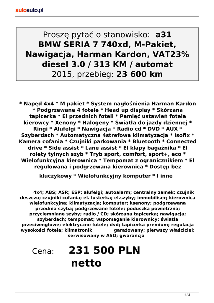 Proszę pytać o stanowisko: a31 BMW SERIA 7 740xd, M-Pakiet, Nawigacja, Harman Kardon, VAT23% diesel 3.0 / 313 KM / automat 2015, przebieg: 23 600 km * Napęd 4x4 * M pakiet * System nagłośnienia Harman Kardon * Podgrzewane 4 fotele * Head up display * Skórzana tapicerka * El przednich foteli * Pamięć ustawień fotela kierowcy * Xenony * Halogeny * Światła do jazdy dziennej * Ringi * Alufelgi * Nawigacja * Radio cd * DVD * AUX * Szyberdach * Automatyczna 4strefowa klimatyzacja * Isofix * Kamera cofania * Czujniki parkowania * Bluetooth * Connected drive * Side assist * Lane assist * El klapy bagażnika * El rolety tylnych szyb * Tryb sport, comfort, sport+, eco * Wielofunkcyjna kierownica * Tempomat z ogranicznikiem * El regulowana i podgrzewana kierownica * Dostęp bez kluczykowy * Wielofunkcyjny komputer * I inne 4x4; ABS; ASR; ESP; alufelgi; autoalarm; centralny zamek; czujnik deszczu; czujniki cofania; el. lusterka; el.szyby; immobiliser; kierownica wielofunkcyjna; klimatyzacja; komputer; ksenony; podgrzewana przednia szyba; podgrzewane fotele; poduszka powietrzna; przyciemniane szyby; radio / CD; skórzana tapicerka; nawigacja; szyberdach; tempomat; wspomaganie kierownicy; światła przeciwmgłowe; elektryczne fotele; dvd; tapicerka premium; regulacja wysokości fotela; klimatronik garażowany; pierwszy właściciel; serwisowany w ASO; gwarancja Cena: 231 500 PLN netto 1/2 Opiekun: Marcin Podemski 602-435-900 Jana Pawła II 69, Punkt A 2/2