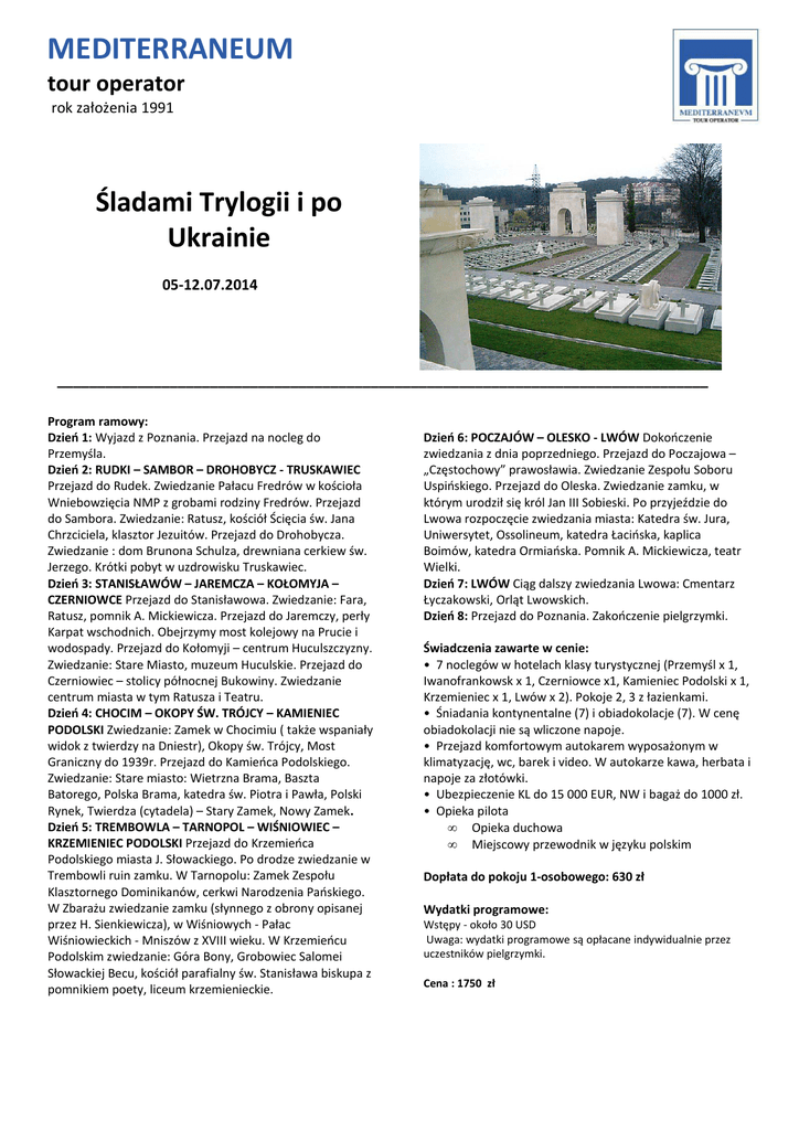 MEDITERRANEUM tour operator rok założenia 1991 Śladami Trylogii i po Ukrainie 05-12.07.2014 _________________________________________________________________________________ Program ramowy: Dzień 1: Wyjazd z Poznania. Przejazd na nocleg do Przemyśla. Dzień 2: RUDKI – SAMBOR – DROHOBYCZ - TRUSKAWIEC Przejazd do Rudek. Zwiedzanie Pałacu Fredrów w kościoła Wniebowzięcia NMP z grobami rodziny Fredrów. Przejazd do Sambora. Zwiedzanie: Ratusz, kościół Ścięcia św. Jana Chrzciciela, klasztor Jezuitów. Przejazd do Drohobycza. Zwiedzanie : dom Brunona Schulza, drewniana cerkiew św. Jerzego. Krótki pobyt w uzdrowisku Truskawiec. Dzień 3: STANISŁAWÓW – JAREMCZA – KOŁOMYJA – CZERNIOWCE Przejazd do Stanisławowa. Zwiedzanie: Fara, Ratusz, pomnik A. Mickiewicza. Przejazd do Jaremczy, perły Karpat wschodnich. Obejrzymy most kolejowy na Prucie i wodospady. Przejazd do Kołomyji – centrum Huculszczyzny. Zwiedzanie: Stare Miasto, muzeum Huculskie. Przejazd do Czerniowiec – stolicy północnej Bukowiny. Zwiedzanie centrum miasta w tym Ratusza i Teatru. Dzień 4: CHOCIM – OKOPY ŚW. TRÓJCY – KAMIENIEC PODOLSKI Zwiedzanie: Zamek w Chocimiu ( także wspaniały widok z twierdzy na Dniestr), Okopy św. Trójcy, Most Graniczny do 1939r. Przejazd do Kamieńca Podolskiego. Zwiedzanie: Stare miasto: Wietrzna Brama, Baszta Batorego, Polska Brama, katedra św. Piotra i Pawła, Polski Rynek, Twierdza (cytadela) – Stary Zamek, Nowy Zamek. Dzień 5: TREMBOWLA – TARNOPOL – WIŚNIOWIEC – KRZEMIENIEC PODOLSKI Przejazd do Krzemieńca Podolskiego miasta J. Słowackiego. Po drodze zwiedzanie w Trembowli ruin zamku. W Tarnopolu: Zamek Zespołu Klasztornego Dominikanów, cerkwi Narodzenia Pańskiego. W Zbarażu zwiedzanie zamku (słynnego z obrony opisanej przez H. Sienkiewicza), w Wiśniowych - Pałac Wiśniowieckich - Mniszów z XVIII wieku. W Krzemieńcu Podolskim zwiedzanie: Góra Bony, Grobowiec Salomei Słowackiej Becu, kościół parafialny św. Stanisława biskupa z pomnikiem poety, liceum krzemienieckie. Dzień 6: POCZAJÓW – OLESKO - LWÓW Dokończenie zwiedzania z dnia poprzedniego. Przejazd do Poczajowa – „Częstochowy” prawosławia. Zwiedzanie Zespołu Soboru Uspińskiego. Przejazd do Oleska. Zwiedzanie zamku, w którym urodził się król Jan III Sobieski. Po przyjeździe do Lwowa rozpoczęcie zwiedzania miasta: Katedra św. Jura, Uniwersytet, Ossolineum, katedra Łacińska, kaplica Boimów, katedra Ormiańska. Pomnik A. Mickiewicza, teatr Wielki. Dzień 7: LWÓW Ciąg dalszy zwiedzania Lwowa: Cmentarz Łyczakowski, Orląt Lwowskich. Dzień 8: Przejazd do Poznania. Zakończenie pielgrzymki. Świadczenia zawarte w cenie: • 7 noclegów w hotelach klasy turystycznej (Przemyśl x 1, Iwanofrankowsk x 1, Czerniowce x1, Kamieniec Podolski x 1, Krzemieniec x 1, Lwów x 2). Pokoje 2, 3 z łazienkami. • Śniadania kontynentalne (7) i obiadokolacje (7). W cenę obiadokolacji nie są wliczone napoje. • Przejazd komfortowym autokarem wyposażonym w klimatyzację, wc, barek i video. W autokarze kawa, herbata i napoje za złotówki. • Ubezpieczenie KL do 15 000 EUR, NW i bagaż do 1000 zł. • Opieka pilota • Opieka duchowa • Miejscowy przewodnik w języku polskim Dopłata do pokoju 1-osobowego: 630 zł Wydatki programowe: Wstępy - około 30 USD Uwaga: wydatki programowe są opłacane indywidualnie przez uczestników pielgrzymki. Cena : 1750 zł