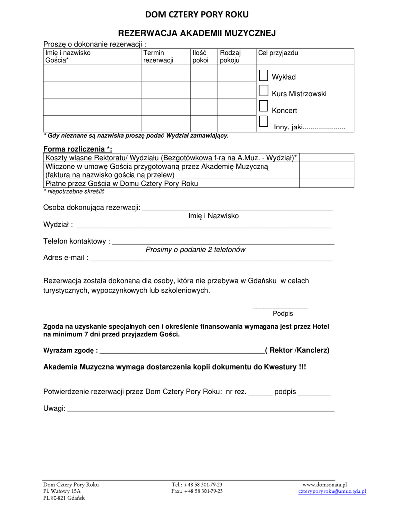 DOM CZTERY PORY ROKU REZERWACJA AKADEMII MUZYCZNEJ Proszę o dokonanie rezerwacji : Imię i nazwisko Gościa* Termin rezerwacji Ilość pokoi Rodzaj pokoju Cel przyjazdu Wykład Kurs Mistrzowski Koncert Inny, jaki..................... * Gdy nieznane są nazwiska proszę podać Wydział zamawiający. Forma rozliczenia *: Koszty własne Rektoratu/ Wydziału (Bezgotówkowa f-ra na A.Muz. - Wydział)* Wliczone w umowę Gościa przygotowaną przez Akademię Muzyczną (faktura na nazwisko gościa na przelew) Płatne przez Gościa w Domu Cztery Pory Roku * niepotrzebne skreślić Osoba dokonująca rezerwacji: _______________________________________________ Imię i Nazwisko Wydział : _______________________________________________________________ Telefon kontaktowy : _______________________________________________________ Prosimy o podanie 2 telefonów Adres e-mail : ____________________________________________________________ Rezerwacja została dokonana dla osoby, która nie przebywa w Gdańsku w celach turystycznych, wypoczynkowych lub szkoleniowych. _______________ Podpis Zgoda na uzyskanie specjalnych cen i określenie finansowania wymagana jest przez Hotel na minimum 7 dni przed przyjazdem Gości. Wyrażam zgodę : _________________________________________( Rektor /Kanclerz) Akademia Muzyczna wymaga dostarczenia kopii dokumentu do Kwestury !!! Potwierdzenie rezerwacji przez Dom Cztery Pory Roku: nr rez. ______ podpis ________ Uwagi: __________________________________________________________________ Dom Cztery Pory Roku Pl. Wałowy 15A PL 80-821 Gdańsk Tel.: +48 58 301-79-23 Fax.: +48 58 301-79-23 www.domsonata.pl [email protected]