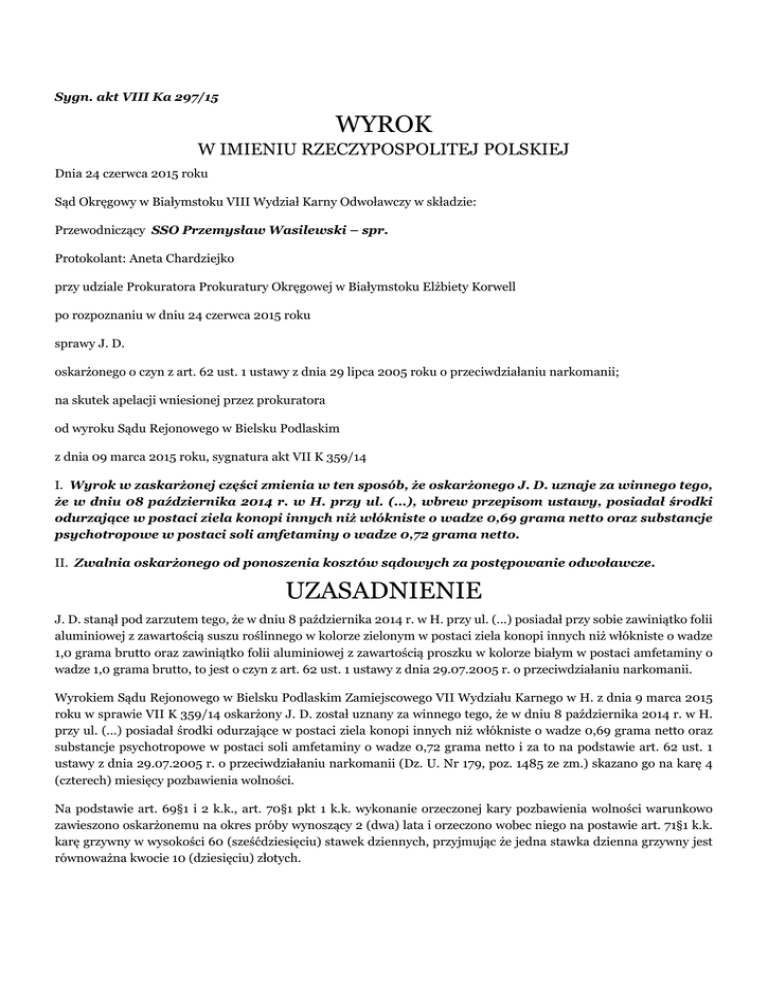 Sygn. akt VIII Ka 297/15 WYROK W IMIENIU RZECZYPOSPOLITEJ POLSKIEJ Dnia 24 czerwca 2015 roku Sąd Okręgowy w Białymstoku VIII Wydział Karny Odwoławczy w składzie: Przewodniczący SSO Przemysław Wasilewski – spr. Protokolant: Aneta Chardziejko przy udziale Prokuratora Prokuratury Okręgowej w Białymstoku Elżbiety Korwell po rozpoznaniu w dniu 24 czerwca 2015 roku sprawy J. D. oskarżonego o czyn z art. 62 ust. 1 ustawy z dnia 29 lipca 2005 roku o przeciwdziałaniu narkomanii; na skutek apelacji wniesionej przez prokuratora od wyroku Sądu Rejonowego w Bielsku Podlaskim z dnia 09 marca 2015 roku, sygnatura akt VII K 359/14 I. Wyrok w zaskarżonej części zmienia w ten sposób, że oskarżonego J. D. uznaje za winnego tego, że w dniu 08 października 2014 r. w H. przy ul. (...), wbrew przepisom ustawy, posiadał środki odurzające w postaci ziela konopi innych niż włókniste o wadze 0,69 grama netto oraz substancje psychotropowe w postaci soli amfetaminy o wadze 0,72 grama netto. II. Zwalnia oskarżonego od ponoszenia kosztów sądowych za postępowanie odwoławcze. UZASADNIENIE J. D. stanął pod zarzutem tego, że w dniu 8 października 2014 r. w H. przy ul. (...) posiadał przy sobie zawiniątko folii aluminiowej z zawartością suszu roślinnego w kolorze zielonym w postaci ziela konopi innych niż włókniste o wadze 1,0 grama brutto oraz zawiniątko folii aluminiowej z zawartością proszku w kolorze białym w postaci amfetaminy o wadze 1,0 grama brutto, to jest o czyn z art. 62 ust. 1 ustawy z dnia 29.07.2005 r. o przeciwdziałaniu narkomanii. Wyrokiem Sądu Rejonowego w Bielsku Podlaskim Zamiejscowego VII Wydziału Karnego w H. z dnia 9 marca 2015 roku w sprawie VII K 359/14 oskarżony J. D. został uznany za winnego tego, że w dniu 8 października 2014 r. w H. przy ul. (...) posiadał środki odurzające w postaci ziela konopi innych niż włókniste o wadze 0,69 grama netto oraz substancje psychotropowe w postaci soli amfetaminy o wadze 0,72 grama netto i za to na podstawie art. 62 ust. 1 ustawy z dnia 29.07.2005 r. o przeciwdziałaniu narkomanii (Dz. U. Nr 179, poz. 1485 ze zm.) skazano go na karę 4 (czterech) miesięcy pozbawienia wolności. Na podstawie art. 69§1 i 2 k.k., art. 70§1 pkt 1 k.k. wykonanie orzeczonej kary pozbawienia wolności warunkowo zawieszono oskarżonemu na okres próby wynoszący 2 (dwa) lata i orzeczono wobec niego na postawie art. 71§1 k.k. karę grzywny w wysokości 60 (sześćdziesięciu) stawek dziennych, przyjmując że jedna stawka dzienna grzywny jest równoważna kwocie 10 (dziesięciu) złotych. Na podstawie art. 63§1 k.k. na poczet orzeczonej kary grzywny zaliczono oskarżonemu okres rzeczywistego pozbawienia wolności w sprawie w dniach od 8.10.2014 r. do 10.10.2014 r. przyjmując, że jeden dzień pozbawienia wolności równa się dwóm dziennym stawkom grzywny. Na podstawie art. 70 ust. 2 ustawy z dnia 29.07.2005 r. o przeciwdziałaniu narkomanii orzeczono przepadek dowodów rzeczowych szczegółowo opisanych pod pozycją (...) w wykazie dowodów rzeczowych nr (...)(k. 39) przechowywanych w magazynie (...) Komendy Wojewódzkiej Policji w B. i zarządzono ich zniszczenie. Jednocześnie zasądzono od oskarżonego na rzecz Skarbu Państwa kwotę 180,00 (stu osiemdziesięciu) złotych tytułem opłaty i obciążono go pozostałymi kosztami sądowymi w kwocie 412,96 (czterystu dwunastu złotych dziewięćdziesięciu sześciu groszy) złotych. Na zasadzie art. 425§1 i 2 k.p.k., art. 444 k.p.k. apelację od powyższego orzeczenia wniósł prokurator zaskarżając wyrok w całości na niekorzyść oskarżonego. W oparciu o art. 427§2 k.p.k. i art. 438 pkt. 2 k.p.k. zarzucił powyższemu wyrokowi obrazę przepisów postępowania mającą wpływ na treść wyroku, a mianowicie art. 413§2 k.p.k., poprzez zaniechanie wskazania w opisie przypisanego oskarżonemu czynu, wszystkich wynikających z art. 62 ust. 1 ustawy z dnia 29 lipca 2005 r. o przeciwdziałaniu narkomanii, znamion przestępstwa, którego winnym uznano J. D.. Wskazując na powyższe zarzuty prokurator wniósł o zmianę zaskarżonego wyroku poprzez wskazanie w opisie czynu, którego winnym uznano J. D., iż posiadał on środki odurzające „wbrew przepisom ustawy”. Sąd Okręgowy zważył, co następuje: Apelacja prokuratora jest zasadna i zasługuje na uwzględnienie. Sąd Okręgowy w wyniku przeprowadzonej kontroli odwoławczej nie dopatrzył się w zaskarżonym wyroku żadnego błędu w ustaleniach faktycznych. Stan faktyczny został ustalony prawidłowo w oparciu o całokształt ujawnionych dowodów, a w wyniku ich wszechstronnej analizy Sąd Rejonowy wywiódł logiczny i trafny wniosek, co do braku wątpliwości w zakresie winy oskarżonego w zakresie przypisanego mu przestępstwa oraz okoliczności jego popełnienia. Należy przy tym podkreślić, iż w uzasadnieniu orzeczenia Sąd Rejonowy szczegółowo wskazał, które fakty i okoliczności uznał za udowodnione oraz na jakich dowodach oparł swe przekonania. Sąd Rejonowy skrupulatnie odniósł się do wyjaśnień oskarżonego oraz pozostałego materiału dowodowego zgromadzonego w aktach sprawy, a także ocenił wymieniony materiał dowodowy zgodnie z doświadczeniem życiowym i zasadami logicznego rozumowania. Dokonując analizy opisu przypisanego oskarżonemu czynu, zgodzić się należy ze skarżącym, że nie ujęto w nim okoliczności, że ujawnione substancje J. D. posiadał wbrew przepisom ustawy, co jednak wynikało bezspornie ze zgromadzonego w sprawie materiału dowodowego. J. D. nie był w stanie wylegitymować się stosownym zezwoleniem, które legalizowałoby posiadanie znalezionych przy nim substancji. Powyższe sygnalizował również Sąd I instancji w uzasadnieniu swojego wyroku. Z normatywnej treści art. 413§2 pkt 1 k.p.k. wynika obowiązek Sądu dokładnego określenia przypisanego oskarżonemu czynu w wyroku skazującym. Zgodnie z dyspozycją art. 62 ust. 1 ustawy z dnia 29 lipca 20