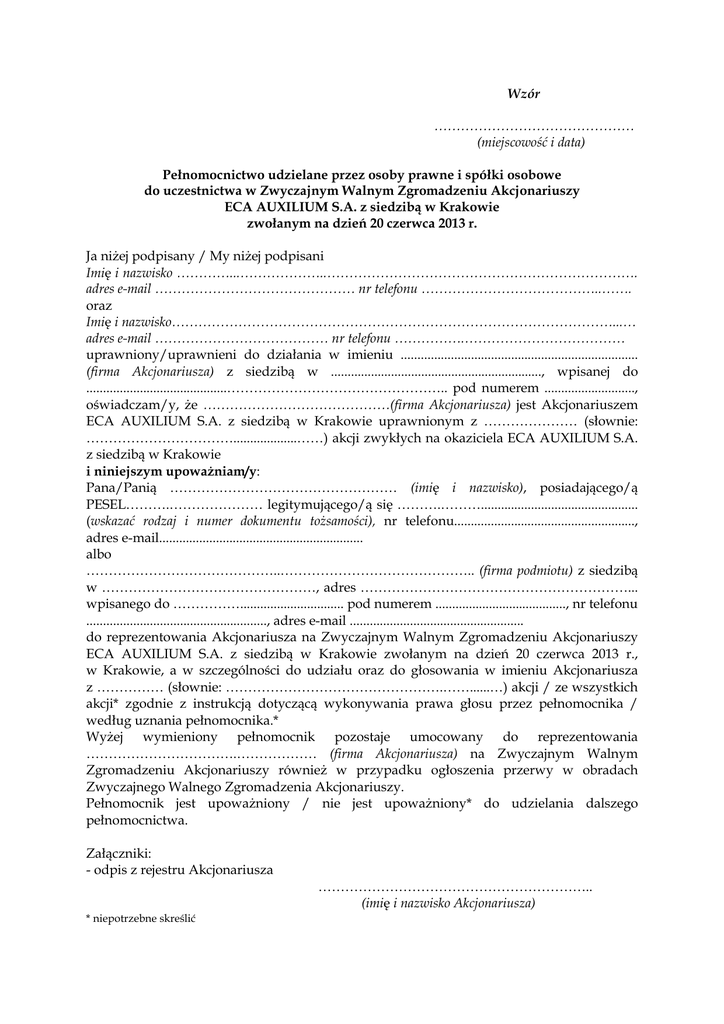 Wzór ……………………………………… (miejscowość i data) Pełnomocnictwo udzielane przez osoby prawne i spółki osobowe do uczestnictwa w Zwyczajnym Walnym Zgromadzeniu Akcjonariuszy ECA AUXILIUM S.A. z siedzibą w Krakowie zwołanym na dzień 20 czerwca 2013 r. Ja niżej podpisany / My niżej podpisani Imię i nazwisko …………...………………..……………………………………………………………. adres e-mail ……………………………………… nr telefonu …………………………………..……. oraz Imię i nazwisko………………………………………………………………………………………...… adres e-mail ………………………………… nr telefonu …………….……………………………… uprawniony/uprawnieni do działania w imieniu ....................................................................... (firma Akcjonariusza) z siedzibą w ..............................................................., wpisanej do ..........................................………………………………………….. pod numerem ..........................., oświadczam/y, że ……………………………………(firma Akcjonariusza) jest Akcjonariuszem ECA AUXILIUM S.A. z siedzibą w Krakowie uprawnionym z ………………… (słownie: ……………………………...................……) akcji zwykłych na okaziciela ECA AUXILIUM S.A. z siedzibą w Krakowie i niniejszym upoważniam/y: Pana/Panią …………………………………………… (imię i nazwisko), posiadającego/ą PESEL……….………………… legitymującego/ą się ……….………............................................... (wskazać rodzaj i numer dokumentu tożsamości), nr telefonu......................................................, adres e-mail............................................................. albo ……………………………………..…………………………………….. (firma podmiotu) z siedzibą w …………………………………………, adres ……………………………………………………... wpisanego do ……………............................... pod numerem ......................................., nr telefonu ......................................................, adres e-mail .................................................... do reprezentowania Akcjonariusza na Zwyczajnym Walnym Zgromadzeniu Akcjonariuszy ECA AUXILIUM S.A. z siedzibą w Krakowie zwołanym na dzień 20 czerwca 2013 r., w Krakowie, a w szczególności do udziału oraz do głosowania w imieniu Akcjonariusza z …………… (słownie: ………………………………………….……......…) akcji / ze wszystkich akcji* zgodnie z instrukcją dotyczącą wykonywania prawa głosu przez pełnomocnika / według uznania pełnomocnika.* Wyżej wymieniony pełnomocnik pozostaje umocowany do reprezentowania …………………………….……………… (firma Akcjonariusza) na Zwyczajnym Walnym Zgromadzeniu Akcjonariuszy również w przypadku ogłoszenia przerwy w obradach Zwyczajnego Walnego Zgromadzenia Akcjonariuszy. Pełnomocnik jest upoważniony / nie jest upoważniony* do udzielania dalszego pełnomocnictwa. Załączniki: - odpis z rejestru Akcjonariusza …………………………………………………….. (imię i nazwisko Akcjonariusza) * niepotrzebne skreślić