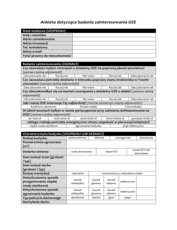 Ankieta dotycząca badania zainteresowania OZE Dane osobowe (UZUPEŁNIJ) Imię i nazwisko Adres zameldowania Adres inwestycji Tel. kontaktowy Adres e-mail Tytuł prawny do nieruchomości Badanie zainteresowania (ZAZNACZ) Czy zauważasz wpływ rozwiązań z dziedziny OZE na poprawę jakości powietrza? (zaznacz jedną odpowiedź) Zdecydowanie nie Raczej nie Nie wiem Raczej tak Zdecydowanie tak Czy zauważasz potrzebę działania w kierunku poprawy stanu środowiska w Twoim otoczeniu? (zaznacz jedną odpowiedź) Zdecydowanie nie Raczej nie Nie wiem Raczej tak Zdecydowanie tak Czy zdecydowałbyś się na montaż rozwiązania z dziedziny OZE u siebie? (zaznacz jedną odpowiedź) Zdecydowanie nie Raczej nie Nie wiem Raczej tak Zdecydowanie tak Jaki rodzaj OZE interesuje Cię najbardziej? (można zaznaczyć więcej odpowiedzi) Kolektory słoneczne Pompa ciepła Fotowoltaika W jakich kosztach byłbyś w stanie partycypować przy założeniu dofinansowania na OZE? (zaznacz jedną odpowiedź) do 1000 zł 1000-3000 zł 3000-6000 zł 6000-10000 zł powyżej 10000 zł Jakiego rodzaju potrzeby energetyczne chcesz zaspokoić w pierwszej kolejności? ciepła woda użytkowa ogrzewanie budynku prąd elektryczny Charakterystyka budynku (UZUPEŁNIJ LUB ZAZNACZ) jednorodzinny bliźniak Rodzaj budynku Powierzchnia ogrzewana [m2] Stolarka okienna Stan izolacji ścian [grubość i typ] Stan izolacji dachu [grubość i typ] Rodzaj wentylacji Dotychczasowy sposób przygotowania ciepłej wody użytkowej Dotychczasowy sposób ogrzewania budynku Typ pokrycia dachowego Nachylenie dachu stare drewniane szeregowiec nowe PCV lub drewniane stare PCV naturalna mieszkanie mechaniczna z odzyskiem ciepła kocioł stałopalny kocioł gazowy kocioł olejowy elektryczne kocioł stałopalny kocioł gazowy kocioł olejowy elektryczne dachówka blacha gont papa Dostępna powierzchnia na gruncie lub dachu Informacje dodatkowe (UZUPEŁNIJ LUB ZAZNACZ) TAK Dostęp do internetu Ilość osób stale użytkujących budynek Zużycie energii elektrycznej za rok ubiegły [kWh] Zużycie wody za rok ubiegły [m3] Rodzaj i zużycie opału w roku ubiegłym [t lub m3 lub kWh] NIE Zgodnie z Ustawą z dnia 29. 08. 1997 roku o ochronie danych osobowych (tekst jednolity: Dz. U. z 2002 r. Nr 101, poz. 926 ze zm.) oświadczam, że: • wyrażam zgodę na przetwarzanie moich danych osobowych, do celów związanych z uruchomieniem oraz realizacją projektu współfinansowanego ze środków dotacyjnych w zakresie czynności dotyczących budowy mikroinstalacji prosumenckich wykorzystujących odnawialne źródła energii w zakresie związanym ze wszystkimi czynnościami, operacjami i pracami niezbędnymi do przygotowania, uruchomienia, wdrożenia, realizacji i rozliczenia projektu, • jestem świadomy/a przysługującego mi prawa uaktualniania, uzupełniania, usunięcia danych ze zbioru oraz możliwości wglądu do nich. Oświadczam ponadto, że moje dane osobowe udostępniam dobrowolnie. ……………………………………… miejscowość i data ……………………………………… czytelny podpis