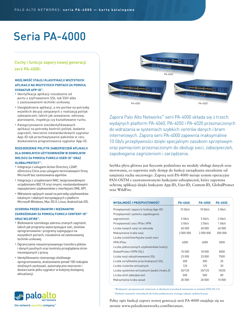 P A L O A L T O N E T W O R K S : s e r i a PA - 4 0 0 0 — k a r t a k a t a l o g o w a Seria PA-4000 Cechy i funkcje zapory nowej generacji serii PA-4000: PA-4060 Możliwość stałej klasyfikacji wszystkich aplikacji na wszystkich portach za pomocą sygnatur App-ID™. • Identyfikacja aplikacji niezależnie od portu z szyfrowaniem SSL lub SSH albo z zastosowaniem techniki unikowej. aplikacji, a nie portów na potrzeby wszelkich decyzji związanych z realizacją polityk zabezpieczeń, takich jak zezwalanie, odmowa, planowanie, inspekcja czy kształtowanie ruchu. PA-4050 PA-4020 • Uwzględnianie • Kategoryzowanie niezidentyfikowanych aplikacji na potrzeby kontroli polityk, badanie zagrożeń, tworzenie niestandardowych sygnatur App‑ID lub przechwytywanie pakietów w celu doskonalenia programowania sygnatur App-ID. Rozszerzenie polityk zabezpieczeń aplikacji dla dowolnych użytkowników w dowolnym miejscu za pomocą funkcji User-ID™ oraz GlobalProtect™. • Integracja z usługami Active Directory, LDAP, eDirectory Citrix oraz usługami terminalowymi firmy Microsoft bez zastosowania agentów. • Integracja z urządzeniami NAC, bezprzewodowymi urządzeniami 802.1X oraz innymi, niestandardowymi repozytoriami użytkowników z interfejsem XML API. • Wdrażanie spójnych zasad na potrzeby użytkowników lokalnych i zdalnych korzystających z platform Microsoft Windows, Mac OS X, Linux, Android lub iOS. Zapora Palo Alto Networks™ serii PA-4000 składa się z trzech wydajnych platform PA-4060, PA-4050 i PA-4020 przeznaczonych do wdrażania w systemach szybkich centrów danych i bram internetowych. Zapora serii PA-4000 zapewnia maksymalnie 10 Gb/s przepływności dzięki specjalnym zasobom sprzętowym oraz pamięciom przeznaczonym do obsługi sieci, zabezpieczeń, zapobiegania zagrożeniom i zarządzania. Szybka płyta główna jest fizycznie podzielona na moduły obsługi danych oraz sterowania, co zapewnia stały dostęp do funkcji zarządzania niezależnie od natężenia ruchu sieciowego. Zaporą serii PA-4000 steruje system operacyjny PAN-OSTM z zaawansowanymi funkcjami zabezpieczeń, który zapewnia ochronę aplikacji dzięki funkcjom App-ID, User-ID, Content-ID, GlobalProtect oraz WildFire. Wydajność i przepustowość1PA-4060PA-4050PA-4020 Ochrona przed znanymi i nieznanymi Przepływność zapory (z funkcją App-ID) zagrożeniami za pomocą funkcji Content-ID™ Przepływność systemu zapobiegania oraz WildFire™. • Blokowanie szerokiego zakresu znanych zagrożeń, takich jak programy wykorzystujące luki, złośliwe oprogramowanie i programy szpiegujące na wszystkich portach, niezależnie od zastosowanej techniki unikowej. • Ograniczanie nieautoryzowanego transferu plików i danych poufnych oraz kontrola przeglądania stron niezwiązanych z pracą. • Identyfikowanie nieznanego złośliwego oprogramowania, analizowanie ponad 100 rodzajów złośliwych zachowań, automatyczne tworzenie i dostarczanie pliku sygnatur w kolejnej dostępnej aktualizacji. 10 Gb/s 10 Gb/s 2 Gb/s zagrożeniom 5 Gb/s 5 Gb/s 2 Gb/s Przepływność sieci IPSec VPN 2 Gb/s 2 Gb/s 1 Gb/s Liczba nowych sesji na sekundę 60 000 60 000 60 000 2 000 000 2 000 000 500 000 4000 4000 2000 Maksymalna liczba sesji Liczba tuneli/interfejsów tuneli sieci VPN IPSec Liczba jednoczesnych użytkowników funkcji GlobalProtect (VPN SSL) 10 000 10 000 5000 Liczba sesji odszyfrowywania SSL 23 000 23 000 7500 Liczba certyfikatów przychodzących SSL 300 300 25 Liczba routerów wirtualnych 125 125 20 25/125 25/125 10/20 Liczba systemów wirtualnych (podst./maks.2) Liczba stref zabezpieczeń 500 500 80 Maksymalna liczba zasad 20 000 20 000 10 000 1 Wydajność i przepustowość zmierzone w idealnych warunkach testowania w systemie PAN-OS 5.0. 2 Dodanie systemów wirtualnych do liczby podstawowej wymaga zakupu osobnej licencji. Pełny opis funkcji zapory nowej generacji serii PA-4000 znajduje się na stronie www.paloaltonetworks.com/literature. P A L O A L T O N E T W O R K S : s e r i a PA - 4 0 0 0 — k a r t a k a t a l o g o w a Dane techniczne sprzętu Porty we-wy Średni czas między awariami (MTBF) •PA-4060: (4) gniazda 10-gigabitowe XFP, (4) gigabitowe porty optyczne SFP •PA-4050, PA-4020: (16) gniazd 10/100/1000, (8) gigabitowych portów optycznych SFP •7,18 roku Maks. początkowy prąd rozruchowy •50 A przy 230 V AC; 30 A przy 120 V AC Administracyjne porty we-wy Montaż w szafie (wymiary) •(2) porty o wysokiej dostępności 10/100/1000, (1) port do zarządzania pozapasmowego 10/100/1000, (1) port konsoli DB9 •standardowa szafa 1U, 19 cali (8,9 cm wys. x 41,9 cm gł. x 44,5 cm szer.) Pojemność dysków Masa (samo urządzenie/w opakowaniu transportowym) •dysk twardy 160 GB •15 kg/18,1 kg Zasilanie (średni/maksymalny pobór mocy) Bezpieczeństwo •nadmiarowy 400 W AC (175 W/200 W) •UL, CUL, CB Maks. BTU/h Interferencja elektromagnetyczna (EMI) •682 •FCC klasa A, CE klasa A, VCCI klasa A, TUV Napięcie wejściowe (częstotliwość wejściowa) Certyfikaty •100–240 V AC (50–60 Hz) •FIPS 140 Level 2, Common Criteria EAL2, ICSA, UCAPL Max current consumption Środowisko •2,5 A przy 100 V AC •Temperatura pracy: od 0 do 50°C •Temperatura podczas przechowywania: od -20 do 70°C Urządzenia sieciowe Tryby interfejsu: Wirtualne sieci LAN (VLAN) •L2, L3, Tap, połączenie wirtualne (tryb transparentny) •Liczba znaczników 802.1q sieci VLAN na urządzenie/interfejs: 4094/4094 •Maks. liczba interfejsów: 4096 (PA-4060, PA-4050), 2048 (PA-4020) •Zagregowane interfejsy (802.3ad) Routing •Tryby: OSPF, RIP, BGP, adres statyczny •Rozmiar tablicy przekazywania (liczba wpisów na urządzenie/VR): 20 000/20 000 (PA-4060, PA-4050), 10 000/10 000 (PA-4020) •Routing oparty na politykach •Protokół PPPoE (Point-to-Point Protocol over Ethernet) •Duże ramki: maks. wielkość ramki 9210 bajtów •Multicasting: PIM-SM, PIM-SSM, IGMP v1, v2 i v3 Wysoka dostępność •Try