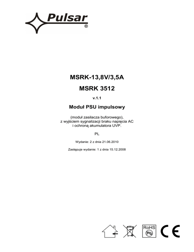 MSRK-13,8V/3,5A MSRK 3512 v.1.1 Moduł PSU impulsowy (moduł zasilacza buforowego), z wyjściem sygnalizacji braku napięcia AC i ochroną akumulatora UVP. PL Wydanie: 2 z dnia 21.06.2010 Zastępuje wydanie: 1 z dnia 15.12.2008 Cechy zasilacza: • • • • • • • • bezprzerwowe zasilanie 13,8V DC kontrola ładowania i konserwacji akumulatora ochrona akumulatora przed nadmiernym rozładowaniem (UVP) zabezpieczenie wyjścia BAT przed zwarciem i odwrotnym podłączeniem możliwość wybrania prądu ładowania funkcja START manualnego załączenia akumulatora kontrola stanu bezpiecznika wyjścia AUX sygnalizacja optyczna LED • • • wyjście BS sygnalizacji zaniku sieci 230V AC wyjście AW awarii zasilacza wyzwalane przez: • zwarcie wyjścia (SCP) • przeciążenie wyjścia (OLP) • awaria przetwornicy DC/DC zabezpieczenia: • przeciwzwarciowe SCP • przeciążeniowe OLP • termiczne OHP • przepięciowe SPIS TREŚCI: 1. Opis techniczny 1.1. Opis ogólny 1.2. Schemat blokowy 1.3. Opis elementów i złącz modułu zasilacza 1.4. Parametry techniczne 2. Instalacja 2.1. Wymagania 2.2. Procedura instalacji 3. Sygnalizacja pracy modułu zasilacza 3.1. Sygnalizacja optyczna 3.2. Wyjście techniczne 4. Obsługa oraz eksploatacja 4.1. Przeciążenia lub zwarcie wyjścia modułu zasilacza 4.2. Praca bateryjna 4.3. Konserwacja 1. Opis techniczny. 1.1. Opis ogólny. Moduł zasilacza buforowego przeznaczony jest do nieprzerwanego zasilania urządzeń systemów alarmowych wymagających stabilizowanego napięcia 12V/DC (+/-15%). Moduł zasilacza dostarcza napięcia U= 11,0V÷13,8 V DC o wydajności prądowej całkowitej Imax=3,5A. W przypadku zaniku napięcia sieciowego następuje natychmiastowe przełączenie na zasilanie akumulatorowe. 2 1.2. Schemat blokowy (rys.1). Rys.1. Schemat blokowy modułu zasilacza. 1.3. Opis elementów i złącz modułu zasilacza (rys.2, tab.1, tab.2). Tabela 1. Nr [rys.2] [1] [2] [3] [4] [5] [6] [7] [8] Opis elementu START przycisk (uruchomienie modułu zasilacza z akumulatora) JP-B, zworka- konfiguracja funkcji ochrony akumulatora UVP • JP-B = funkcja ochrony (odłączenia) akumulatora wyłączona • JP-B = funkcja ochrony (odłączenia) akumulatora włączona (odłączenie U<10V) Opis: zworka założona zworka zdjęta P1 potencjometr, regulacja napięcia F1 bezpiecznik w obwodzie akumulatora WYJŚCIA złącze (Tab.2) Złącze wyjścia dodatkowej sygnalizacji optycznej AC, LB, AUX sygnalizacja optyczna pracy modułu zasilacza J1, zworka- konfiguracja prądu ładowania akumulatora • J1= IBAT = 0,25 A • J1= IBAT = 0,70 A Opis: zworka założona zworka zdjęta 3 Tabela 2. [5] ~AC~ +BAT -BAT +AUX -AUX BS AW Opis wyjść modułu zasilacza Wejście zasilania AC (18 V÷ 22 V AC, patrz dobór transformatora) Wyjście zasilania DC akumulatora +BAT= czerwony, -BAT=czarny Wyjście zasilania DC +AUX= +U, -AUX=GND wyjście techniczne braku AC – typu OC poziom hi-Z = stan: zasilanie AC poziom L = stan: awaria zasilania AC wyjście techniczne stanu pracy zasilacza – typu OC poziom L = stan: praca poprawna poziom hi-Z = stan: awaria, przeciążenie Rys.2. Widok modułu zasilacza. 1.4. Parametry techniczne: - parametry elektryczne (tab.3) - parametry mechaniczne (tab.4) 4 Tabela 3. Napięcie zasilania Transformator Moc modułu zasilacza P Napięcie wyjściowe Czas narastania, opadania i podtrzymania napięcia wyjściowego Zakres nastawy napięcia Zakres regulacji napięcia Napięcie tętnienia Prąd wyjściowy Pobór prądu przez układy modułu zasilacza Prąd ładowania akumulatora Zabezpieczenie przed zwarciem SCP Zabezpieczenie przed przeciążeniem OLP Zabezpieczenie przed zwarciem w obwodzie akumulatora SCP Zabezpieczenie akumulatora przed nadmiernym rozładowaniem UVP Wyjścia techniczne - BS wyjście sygnalizujące awarię zasilania sieciowego - AW wyjście techniczne stanu pracy zasilacza Sygnalizacja optyczna - AC dioda sygnalizująca stan zasilania AC - LB dioda sygnalizująca proces ładowania akumulatora - AUX dioda sygnalizująca stan zasilania DC na wyjściu modułu zasilacza Bezpiecznik F1 Warunki pracy Tabela 4. Wymiary Mocowanie Złącza Wyjście akumulatora BAT Waga netto/brutto AC: 18 V÷ 22 V, 50Hz, 4,3A max. DC: 20 V÷ 30 V 80VA (Np. AWT 250, AWT 868) 49W 11,0 V÷13,8 V DC – praca buforowa 10,0 V÷13,8 V DC – praca bateryjna 20ms/50ms/10ms @ Izn., Uac=min. 11,0 V÷15,0 V ± 1% 60mV p-p max. 3,5 A max. 17 mA max. – praca bateryjna 250mA / 700mA (±5%) zależnie od stanu zworki J1 200% ÷ 250% mocy modułu zasilacza - ograniczenie prądu i/lub uszkodzenie bezpiecznika topikowego w obwodzie akumulatora (wymaga wymiany wkładki topikowej) 110% ÷ 150% (@25ºC÷65ºC) mocy modułu zasilacza ograniczenie prądu poprzez bezpiecznik powracalny PTC, ponowne uruchomienie ręczne (odłączenie obwodu wyjściowego DC) 5A- ograniczenie prądu, bezpiecznik topikowy F (awaria wymaga wymiany wkładki topikowej) U<10,0 V (± 5%) – odłączenie (-BAT) akumulatora - typ OC, 50mA max. Stan normalny: poziom hi-Z, awaria: poziom L (0V), opóźnienie 20s. - typ OC, 50mA max. stan normalny: poziom L (0V), awaria: poziom H (hi-Z) (powrót automatyczny po wznowieniu prawidłowej pracy) - czerwona, stan normalny świeci światłem ciągłym - czerwona, świeci światłem o intensywności zależnej od prądu ładowania akumulatora - zielona, stan normalny świeci światłem ciągłym F 5A II klasa środowiskowa, -10°C ÷40°C, należy zapewnić przepływ powietrza wokół modułu zasilacza w celu konwekcyjnego chłodzenia 87 x 55 x 93 (WxHxD) Kołki montażowe x 4 (PCB fi=4,2 mm) Ф0,41÷1,63 (AWG 26-14) Konektory 6,3F-2,5 0,16kg/0,21kg 2. Instalacja. 2.1 Wymagania. Moduł zasilacza buforowego przeznaczony jest do montażu przez wykwalifikowanego instalatora, posiadającego odpowiednie (wymagane i konieczne dla danego kraju) zezwolenia i uprawnienia do przyłączania (ingerencji) w instalacje 230V/AC oraz instalacje niskonapięciowe. Urządzenie powinno b