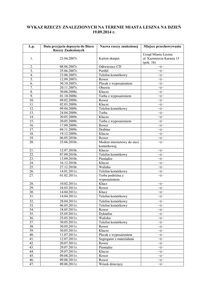 WYKAZ RZECZY ZNALEZIONYCH NA TERENIE MIASTA LESZNA NA DZIEŃ 19.09.2014 r. L.p. Data przyjęcia depozytu do Biura Rzeczy Znalezionych 1. 23.04.2007r. Karton skarpet 2. 3. 4. 5. 6. 7. 8. 9. 10. 11. 12. 13. 14. 15. 16. 17. 18. 19. 20. 08.06.2007r. 25.06.2007r. 23.08.2007r. 12.09.2007r. 30.10.2007r. 20.11.2007r. 30.06.2008r. 01.10.2008r. 09.02.2009r. 02.03.2009r. 09.04.2009r. 24.04.2009r. 20.05.2009r. 20.05.2009r. 17.09.2009r. 04.11.2009r. 19.12.2009r. 06.05.2010r. 25.06.2010r. 21. 22. 23. 24. 25. 26. 27. 12.07.2010r. 07.09.2010r. 13.09.2010r. 16.12.2010r. 27.12.2010r. 14.01.2011r. 01.02.2011r. 28. 29. 30. 31. 32. 33. 34. 35. 36. 37. 38. 39. 40. 41. 42. 43. 44. 45. 46. 47. 10.02.2011r. 24.03.2011r. 14.04.2011r. 14.04.2011r. 28.04.2011r. 06.05.2011r. 18.05.2011r. 25.05.2011r. 25.05.2011r. 30.05.2011r. 30.05.2011r. 30.05.2011r. 11.07.2011r. 12.07.2011r. 20.07.2011r. 29.07.2011r. 29.07.2011r. 09.08.2011r. 09.08.2011r. 09.08.2011r. Odtwarzacz CD Portfel Telefon komórkowy Rower Plecak z wyposażeniem Obuwie Klucze Torba z wyposażeniem Rower Klucze Telefon komórkowy Torba Klucze Torba z wyposażeniem Rower Drabina Klucze Rower Modem internetowy do sieci komórkowej Klucze Telefon komórkowy Pieniądze Klucze Walizka Telefon komórkowy Torba podróżna z wyposażeniem Klucz Rower Klucz Telefon komórkowy Telefon komórkowy Telefon komórkowy Rower Dyktafon Walizka Telefon komórkowy Rower Klucze Plecak z wyposażeniem Segregator z materiałami Rower Pieniądze Klucze Rower Rower Wózek dziecięcy Nazwa rzeczy znalezionej Miejsce przechowywania Urząd Miasta Leszna ul. Kazimierza Karasia 15 (pok. 1b) −׀׀− −׀׀− −׀׀− −׀׀− −׀׀− −׀׀− −׀׀− −׀׀− −׀׀− −׀׀− −׀׀− −׀׀− −׀׀− −׀׀− −׀׀− −׀׀− −׀׀− −׀׀− −׀׀− −׀׀− −׀׀− −׀׀− −׀׀− −׀׀− −׀׀− −׀׀− −׀׀− −׀׀− −׀׀− −׀׀− −׀׀− −׀׀− −׀׀− −׀׀− −׀׀− −׀׀− −׀׀− −׀׀− −׀׀− −׀׀− −׀׀− −׀׀− −׀׀− −׀׀− −׀׀− −׀׀− 48. 49. 50. 51. 52. 53. 54. 55. 56. 57. 58. 59. 60. 61. 62. 63. 64 65. 66. 67. 68. 69. 70. 71. 72. 73. 74. 75. 76. 77. 78. 79. 80. 81. 82. 83. 84. 85. 86. 87. 88. 89. 90. 91. 92. 93. 94. 95. 96. 97. 98. 99. 100. 101. 102. 103. 104. 105. 19.08.2011r. 30.08.2011r. 09.02.2012r. 27.03.2012r. 30.03.2012r. 04.05.2012r. 22.06.2012r. 28.06.2012r. 20.07.2012r. 26.07.2012r. 14.08.2012r. 16.08.2012r. 07.09.2012r. 11.09.2012r. 18.09.2012r. 18.10.2012r. 19.10.2012r. 22.10.2012r. 22.10.2012r. 16.11.2012r. 11.12.2012r. 18.12.2012r. 31.12.2012r. 31.12.2012r. 08.01.2013r. 08.01.2013r. 16.01.2013r. 18.01.2013r. 30.01.2013r. 13.02.2013r. 18.02.2013r. 11.04.2013r. 17.04.2013r. 10.05.2013r. 10.05.2013r. 10.06.2013r. 16.07.2013r. 20.08.2013r. 21.08.2013r. 05.09.2013r. 06.09.2013r. 29.10.2013r. 04.11.2013r. 18.11.2013r. 31.12.2013r. 16.01.2014r. 21.01.2014r. 28.01.2014r. 06.02.2014r. 17.02.2014r. 21.02.2014r. 28.02.2014r. 05.03.2014r. 31.03.2014r. 03.04.2014r. 17.04.2014r. 08.05.2014r. 13.05.2014r. Rower Klucze Portfel + klucz Klucz Zegarek Rower Klucz Rower Portfel Rower Pieniądze Telefon komórkowy Tablica rejestracyjna Klucz Telefon komórkowy Klucz Okulary Telefon komórkowy Rower Spacerówka dziecięca Rower Pieniądze Portfel Klucze Kosiarka Telefon komórkowy Torebka Portfel + dokumenty Rower Klucze Telefon komórkowy Torby z wyposażeniem Pieniądze Rower Telefon komórkowy Klucze Walizka z wyposażeniem Rower Urządzenie GPS Telefon komórkowy Rower Telefon komórkowy Obrączka Klucze Klucze Telefon komórkowy Glukometr Karta bankomatowa Klucz Telefon komórkowy Telefon komórkowy Rower Kurtka Telefon komórkowy Telefon komórkowy Portfel + klucze Telefon komórkowy Portfel + pieniądze −׀׀− −׀׀− −׀׀− −׀׀− −׀׀− −׀׀− −׀׀− −׀׀− −׀׀− −׀׀− −׀׀− −׀׀− −׀׀− −׀׀− −׀׀− −׀׀− −׀׀− −׀׀− −׀׀− −׀׀− −׀׀− −׀׀− −׀׀− −׀׀− −׀׀− −׀׀− −׀׀− −׀׀− −׀׀− −׀׀− −׀׀− −׀׀− −׀׀− −׀׀− −׀׀− −׀׀− −׀׀− −׀׀− −׀׀− −׀׀− −׀׀− −׀׀− −׀׀− −׀׀− −׀׀− −׀׀− −׀׀− −׀׀− −׀׀− −׀׀− −׀׀− −׀׀− −׀׀− −׀׀− −׀׀− −׀׀− −׀׀− −׀׀− 106. 107. 108. 109. 110. 111. 112. 113. 22.05.2014r. 26.05.2014r. 28.05.2014r. 30.07.2014r. 04.08.2014r. 02.09.2014r. 16.09.2014r. 19.09.2014r. Rower Portfel + pieniądze Klucze Rower Klucze Telefon Klucze Klucze −׀׀− −׀׀− −׀׀− −׀׀− −׀׀− −׀׀− −׀׀− −׀׀−