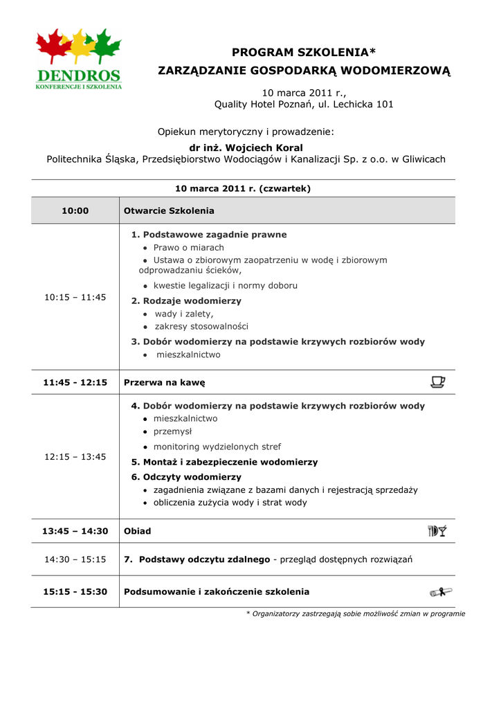 PROGRAM SZKOLENIA* ZARZĄDZANIE GOSPODARKĄ WODOMIERZOWĄ 10 marca 2011 r., Quality Hotel Poznań, ul. Lechicka 101 Opiekun merytoryczny i prowadzenie: dr inŜ. Wojciech Koral Politechnika Śląska, Przedsiębiorstwo Wodociągów i Kanalizacji Sp. z o.o. w Gliwicach 10 marca 2011 r. (czwartek) 10:00 Otwarcie Szkolenia 1. Podstawowe zagadnie prawne • Prawo o miarach • Ustawa o zbiorowym zaopatrzeniu w wodę i zbiorowym odprowadzaniu ścieków, • kwestie legalizacji i normy doboru 10:15 – 11:45 2. Rodzaje wodomierzy • wady i zalety, • zakresy stosowalności 3. Dobór wodomierzy na podstawie krzywych rozbiorów wody • 11:45 - 12:15 mieszkalnictwo Przerwa na kawę 4. Dobór wodomierzy na podstawie krzywych rozbiorów wody • mieszkalnictwo • przemysł • monitoring wydzielonych stref 12:15 – 13:45 5. MontaŜ i zabezpieczenie wodomierzy 6. Odczyty wodomierzy • zagadnienia związane z bazami danych i rejestracją sprzedaŜy • obliczenia zuŜycia wody i strat wody 13:45 – 14:30 Obiad 14:30 – 15:15 7. Podstawy odczytu zdalnego - przegląd dostępnych rozwiązań 15:15 - 15:30 Podsumowanie i zakończenie szkolenia * Organizatorzy zastrzegają sobie moŜliwość zmian w programie