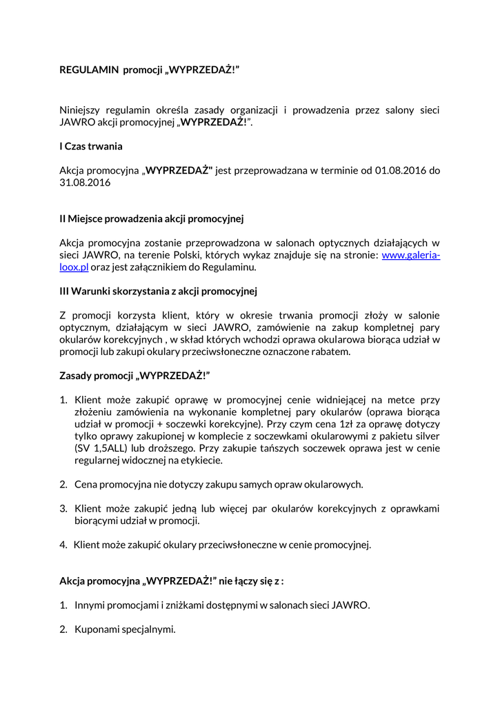 REGULAMIN promocji „WYPRZEDAŻ!” Niniejszy regulamin określa zasady organizacji i prowadzenia przez salony sieci JAWRO akcji promocyjnej „WYPRZEDAŻ!”. I Czas trwania Akcja promocyjna „WYPRZEDAŻ" jest przeprowadzana w terminie od 01.08.2016 do 31.08.2016 II Miejsce prowadzenia akcji promocyjnej Akcja promocyjna zostanie przeprowadzona w salonach optycznych działających w sieci JAWRO, na terenie Polski, których wykaz znajduje się na stronie: www.galerialoox.pl oraz jest załącznikiem do Regulaminu. III Warunki skorzystania z akcji promocyjnej Z promocji korzysta klient, który w okresie trwania promocji złoży w salonie optycznym, działającym w sieci JAWRO, zamówienie na zakup kompletnej pary okularów korekcyjnych , w skład których wchodzi oprawa okularowa biorąca udział w promocji lub zakupi okulary przeciwsłoneczne oznaczone rabatem. Zasady promocji „WYPRZEDAŻ!” 1. Klient może zakupić oprawę w promocyjnej cenie widniejącej na metce przy złożeniu zamówienia na wykonanie kompletnej pary okularów (oprawa biorąca udział w promocji + soczewki korekcyjne). Przy czym cena 1zł za oprawę dotyczy tylko oprawy zakupionej w komplecie z soczewkami okularowymi z pakietu silver (SV 1,5ALL) lub droższego. Przy zakupie tańszych soczewek oprawa jest w cenie regularnej widocznej na etykiecie. 2. Cena promocyjna nie dotyczy zakupu samych opraw okularowych. 3. Klient może zakupić jedną lub więcej par okularów korekcyjnych z oprawkami biorącymi udział w promocji. 4. Klient może zakupić okulary przeciwsłoneczne w cenie promocyjnej. Akcja promocyjna „WYPRZEDAŻ!” nie łączy się z : 1. Innymi promocjami i zniżkami dostępnymi w salonach sieci JAWRO. 2. Kuponami specjalnymi. 3. Kartami klienta. Postanowienia końcowe 1. Informacje dotyczące akcji promocyjnej są dostępne w salonach sieci JAWRO oraz na stronie: www.galeria-loox.pl 2. Organizator zastrzega sobie prawo zmiany niniejszego Regulaminu w czasie trwania akcji. Wszelkie zmiany w niniejszym regulaminie wymagają zachowania formy pisemnej, pod rygorem nieważności i będą obowiązywały po upływie 2 dni od dnia ich ogłoszenia na stronie: www.galeria-loox.pl OSTATNIE ZMIANY WPROWADZONO DNIA: 27.07.2016 Załącznik nr 1 „WYPRZEDAŻ!” - lista salonów biorących udział w promocji. SALONY Loox Galeria Optyki 1 BEŁCHATÓW GALERIA OLIMPIA 2 GORZÓW WIELKOPOLSKI 3 KALISZ CH NOVA PARK 4 KALISZ LOOX GALERIA OPTYKI Ul. Kolejowa 6, 97-400 Bełchatów Ul. Przemysłowa 2, 66-400 Gorzów Wielkopolski Ul. Górnośląska 82, 62-800 Kalisz Ul. Legionów 2, 62-800 Kalisz 5 KRAKÓW CH M1 Al. Pokoju 67, 31-580 Kraków 6 ŁOMŻA GALERIA VENEDA 7 OLSZTYN CH VIKTOR 8 OPOLE CH KAROLINKA 9 OSTRÓW WIELKOPOLSKI 1 POZNAŃ 0 1 POZNAŃ 1 1 POZNAŃ 2 1 WARSZAWA 3 1 WROCŁAW 4 1 ZABRZE 5 GALERIA OSTROVIA Ul. Zawadzka 38, 18-400 Łomża Al. Piłsudskiego 50, 10-416 Olsztyn Ul. Wrocławska 152/154, 45837 Opole Ul. Kaliska 120, 63-400 Ostrów Wielkopolski Ul. Promienista 160, 60-142 Poznań Ul. Bukowska 156, 60-198 Poznań Ul. Szwajcarska 14, 61-285 Poznań Ul. Głębocka 15, 03-287 Warszawa Ul. Hallera 52, 50-984 Wrocław Ul. Plutonowego Szkubacza 1, 41-800 Zabrze GALERIA AMBER CH PROMIENISTA KING CROSS MARCELIN CH M1 ATRIUM TARGÓWEK CH BOREK CH M1