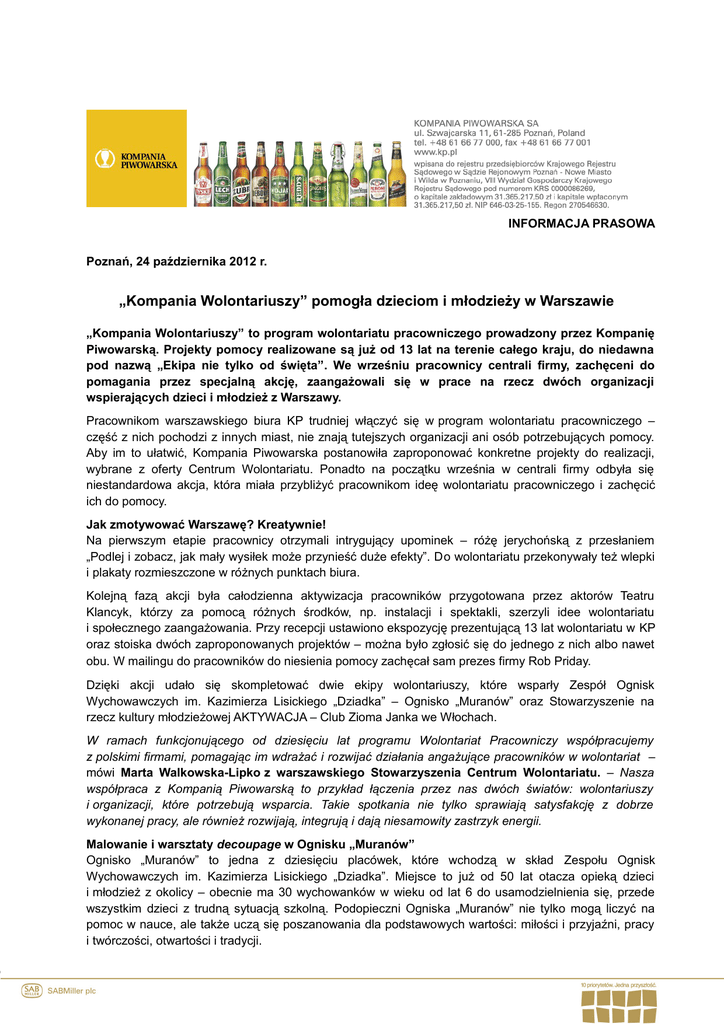 INFORMACJA PRASOWA Poznań, 24 października 2012 r. „Kompania Wolontariuszy” pomogła dzieciom i młodzieży w Warszawie „Kompania Wolontariuszy” to program wolontariatu pracowniczego prowadzony przez Kompanię Piwowarską. Projekty pomocy realizowane są już od 13 lat na terenie całego kraju, do niedawna pod nazwą „Ekipa nie tylko od święta”. We wrześniu pracownicy centrali firmy, zachęceni do pomagania przez specjalną akcję, zaangażowali się w prace na rzecz dwóch organizacji wspierających dzieci i młodzież z Warszawy. Pracownikom warszawskiego biura KP trudniej włączyć się w program wolontariatu pracowniczego – część z nich pochodzi z innych miast, nie znają tutejszych organizacji ani osób potrzebujących pomocy. Aby im to ułatwić, Kompania Piwowarska postanowiła zaproponować konkretne projekty do realizacji, wybrane z oferty Centrum Wolontariatu. Ponadto na początku września w centrali firmy odbyła się niestandardowa akcja, która miała przybliżyć pracownikom ideę wolontariatu pracowniczego i zachęcić ich do pomocy. Jak zmotywować Warszawę? Kreatywnie! Na pierwszym etapie pracownicy otrzymali intrygujący upominek – różę jerychońską z przesłaniem „Podlej i zobacz, jak mały wysiłek może przynieść duże efekty”. Do wolontariatu przekonywały też wlepki i plakaty rozmieszczone w różnych punktach biura. Kolejną fazą akcji była całodzienna aktywizacja pracowników przygotowana przez aktorów Teatru Klancyk, którzy za pomocą różnych środków, np. instalacji i spektakli, szerzyli idee wolontariatu i społecznego zaangażowania. Przy recepcji ustawiono ekspozycję prezentującą 13 lat wolontariatu w KP oraz stoiska dwóch zaproponowanych projektów – można było zgłosić się do jednego z nich albo nawet obu. W mailingu do pracowników do niesienia pomocy zachęcał sam prezes firmy Rob Priday. Dzięki akcji udało się skompletować dwie ekipy wolontariuszy, które wsparły Zespół Ognisk Wychowawczych im. Kazimierza Lisickiego „Dziadka” – Ognisko „Muranów” oraz Stowarzyszenie na rzecz kultury młodzieżowej AKTYWACJA – Club Zioma Janka we Włochach. W ramach funkcjonującego od dziesięciu lat programu Wolontariat Pracowniczy współpracujemy z polskimi firmami, pomagając im wdrażać i rozwijać działania angażujące pracowników w wolontariat – mówi Marta Walkowska-Lipko z warszawskiego Stowarzyszenia Centrum Wolontariatu. – Nasza współpraca z Kompanią Piwowarską to przykład łączenia przez nas dwóch światów: wolontariuszy i organizacji, które potrzebują wsparcia. Takie spotkania nie tylko sprawiają satysfakcję z dobrze wykonanej pracy, ale również rozwijają, integrują i dają niesamowity zastrzyk energii. Malowanie i warsztaty decoupage w Ognisku „Muranów” Ognisko „Muranów” to jedna z dziesięciu placówek, które wchodzą w skład Zespołu Ognisk Wychowawczych im. Kazimierza Lisickiego „Dziadka”. Miejsce to już od 50 lat otacza opieką dzieci i młodzież z okolicy – obecnie ma 30 wychowanków w wieku od lat 6 do usamodzielnienia się, przede wszystkim dzieci z trudną sytuacją szkolną. Podopieczni Ogniska „Muranów” nie tylko mogą liczyć na pomoc w nauce, ale także uczą się poszanowania dla podstawowych wartości: miłości i przyjaźni, pracy i twórczości, otwartości i tradycji. 15 września wolontariusze KP przy wsparciu pracowników ogniska przeprowadzili szybką modernizację siedziby placówki. Już wcześniej ekipa remontowa zdemontowała wysłużoną szafę w kuchni i pomalowała sufity. W sobotnie przedpołudnie, po krótkim spotkaniu organizacyjnym, uczestnicy akcji podzielili się na zespoły złożone z pracowników KP oraz pracowników lub wychowanków Ogniska. Jedna ekipa pomalowała jadalnię, druga świetlicę. Dodatkowo wolontariusze odnowili kuchnię i przedsionek oraz umyli okna. Przez cały czas można było wzmocnić się w „kawiarence”, oferującej napoje i domowe wypieki. Wolontariat daje bardzo dużo osobistej frajdy, kiedy widzi się radość ludzi, którym pomagasz. Przy okazji poznałem wiele ciekawych osób z KP, dzięki którym udało się z sukcesem zakończyć projekt. Czuję niedosyt… i rozglądam się za kolejnym działaniem – śmieje się Szymon Grzechulski, młodszy manager ds. zarządzania marką w Kompanii Piwowarskiej. – Polecam wszystkim takie akcje, gdyż, cytując słowa Stanisława Soyki, „… życie nie po to, by bezczynnie trwać, i aby żyć, siebie samego trzeba dać”. Na zakończenie tego dnia wolontariusze i kilka młodszych wychowanek placówki mieli okazję odkryć własne talenty plastyczne, wykonując ceramiczne podkładki i ozdobne szklaneczki podczas warsztatów decoupage. W podziękowaniu za pracę przedstawiciele Kompanii Piwowarskiej otrzymali dyplomy i symboliczne ceramiczne serduszka, przygotowane przez dzieci z Ogniska „Stara Prochowania”. Porządki i street art w Clubie Zioma Janka Club Zioma Janka to młodzieżowy klub środowiskowy na warszawskich Włochach, prowadzony przez AKTYWACJĘ – stowarzyszenie kulturalnych pasjonatów i praktyków pracy z młodymi ludźmi. Tutaj dzieci i młodzież mogą spędza wolny czas i twórczo rozwijać swoje zainteresowania. W ciągu roku szkolnego w klubie odbywają się zajęcia teatralne, taneczne (break dance, street dance), artystyczne (tworzenie muzyki hip hop oraz street art), nauka jazdy na monocyklu i konsultacje pedagoga. W ostatni weekend września w Clubie Zioma Janka pojawiła się ekipa wolontariuszy KP. Dzień rozpoczął się od prezentacji wszystkich uczestników prac, bowiem przedstawiciele Kompanii Piwowarskiej mieli pracować ramię w ramię z pracownikami i podopiecznymi klubu. Dzięki połączonym wysiłkom udało się wykonać wszystko, co zaplanowano na tę pracowitą sobotę: wymieniono wykładziny, pomalowano ściany i kraty okienne oraz wysprzątano cały klub. Oprócz tego w jednej z sal