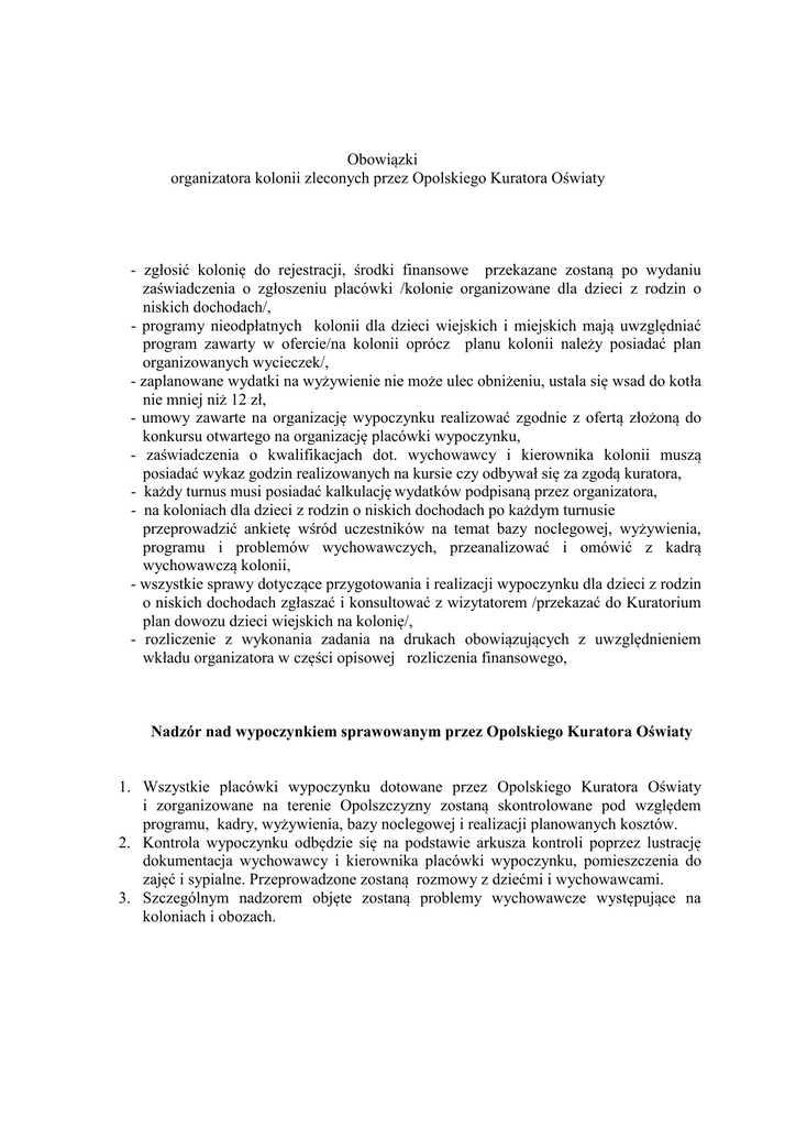 Obowiązki organizatora kolonii zleconych przez Opolskiego Kuratora Oświaty - zgłosić kolonię do rejestracji, środki finansowe przekazane zostaną po wydaniu zaświadczenia o zgłoszeniu placówki /kolonie organizowane dla dzieci z rodzin o niskich dochodach/, - programy nieodpłatnych kolonii dla dzieci wiejskich i miejskich mają uwzględniać program zawarty w ofercie/na kolonii oprócz planu kolonii należy posiadać plan organizowanych wycieczek/, - zaplanowane wydatki na wyżywienie nie może ulec obniżeniu, ustala się wsad do kotła nie mniej niż 12 zł, - umowy zawarte na organizację wypoczynku realizować zgodnie z ofertą złożoną do konkursu otwartego na organizację placówki wypoczynku, - zaświadczenia o kwalifikacjach dot. wychowawcy i kierownika kolonii muszą posiadać wykaz godzin realizowanych na kursie czy odbywał się za zgodą kuratora, - każdy turnus musi posiadać kalkulację wydatków podpisaną przez organizatora, - na koloniach dla dzieci z rodzin o niskich dochodach po każdym turnusie przeprowadzić ankietę wśród uczestników na temat bazy noclegowej, wyżywienia, programu i problemów wychowawczych, przeanalizować i omówić z kadrą wychowawczą kolonii, - wszystkie sprawy dotyczące przygotowania i realizacji wypoczynku dla dzieci z rodzin o niskich dochodach zgłaszać i konsultować z wizytatorem /przekazać do Kuratorium plan dowozu dzieci wiejskich na kolonię/, - rozliczenie z wykonania zadania na drukach obowiązujących z uwzględnieniem wkładu organizatora w części opisowej rozliczenia finansowego, Nadzór nad wypoczynkiem sprawowanym przez Opolskiego Kuratora Oświaty 1. Wszystkie placówki wypoczynku dotowane przez Opolskiego Kuratora Oświaty i zorganizowane na terenie Opolszczyzny zostaną skontrolowane pod względem programu, kadry, wyżywienia, bazy noclegowej i realizacji planowanych kosztów. 2. Kontrola wypoczynku odbędzie się na podstawie arkusza kontroli poprzez lustrację dokumentacja wychowawcy i kierownika placówki wypoczynku, pomieszczenia do zajęć i sypialne. Przeprowadzone zostaną rozmowy z dziećmi i wychowawcami. 3. Szczególnym nadzorem objęte zostaną problemy wychowawcze występujące na koloniach i obozach.