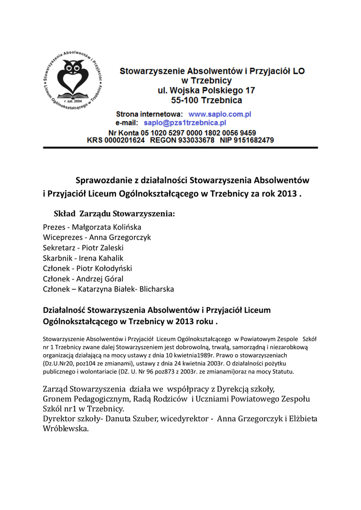 Sprawozdanie z działalności Stowarzyszenia Absolwentów i Przyjaciół Liceum Ogólnokształcącego w Trzebnicy za rok 2013 . Skład Zarządu Stowarzyszenia: Prezes - Małgorzata Kolińska Wiceprezes - Anna Grzegorczyk Sekretarz - Piotr Zaleski Skarbnik - Irena Kahalik Członek - Piotr Kołodyński Członek - Andrzej Góral Członek – Katarzyna Białek- Blicharska Działalność Stowarzyszenia Absolwentów i Przyjaciół Liceum Ogólnokształcącego w Trzebnicy w 2013 roku . Stowarzyszenie Absolwentów i Przyjaciół Liceum Ogólnokształcącego w Powiatowym Zespole Szkół nr 1 Trzebnicy zwane dalej Stowarzyszeniem jest dobrowolną, trwałą, samorządną i niezarobkową organizacją działającą na mocy ustawy z dnia 10 kwietnia1989r. Prawo o stowarzyszeniach (Dz.U.Nr20, poz104 ze zmianami), ustawy z dnia 24 kwietnia 2003r. O działalności pożytku publicznego i wolontariacie (DZ. U. Nr 96 poz873 z 2003r. ze zmianami)oraz na mocy Statutu. Zarząd Stowarzyszenia działa we współpracy z Dyrekcją szkoły, Gronem Pedagogicznym, Radą Rodziców i Uczniami Powiatowego Zespołu Szkól nr1 w Trzebnicy. Dyrektor szkoły- Danuta Szuber, wicedyrektor - Anna Grzegorczyk i Elżbieta Wróblewska. Działalność na rzecz uczniów i środowiska - współpraca z dyr. PZS nr1, gronem pedagogicznym i uczniami -1 stycznia -30 czerwca- zrealizowano projekt ,,Otwarci na Edukację” współfinansowany ze Środków Europejskiego Funduszu Społecznego w ramach POKL, Priorytet IX, Rozwój wykształcenia i kompetencji w regionach. Działalność 9,5 ,, Oddolne inicjatywy edukacyjne na obszarach wiejskich”. Lider- Stowarzyszenie Absolwentów i Przyjaciół LO w Trzebnicy. Partner- PZS nr1 w Trzebnicy. Projekt obejmował bezpłatne szkolenia- dla 100 osób-młodzieży i dorosłych z Gmin :Trzebnica, Oborniki Śląskie i Prusice, -12 stycznia odbył się IV Otwarty Charytatywny Bal Karnawałowy w Hotelu Trzebnica dla mieszkańców, przyjaciół, sympatyków i absolwentów LO- 94 osoby- - uczniowie pod kierunkiem nauczycieli przygotowali kotyliony , -dochód z zabawy przeznaczono na stypendia i bieżącą działalność na rzecz uczniów PZS nr 1 i absolwentów szkoły; - 29 stycznia-w obecności przedstawicieli szkoły, Rady Rodziców i Zarządu przekazano do dyspozycji uczniów i nauczycieli zakupioną w całości ze środków SAPLO Tablicę interaktywną ESPIRT PLUS 80, wraz z oprzyrządowaniem ( projektor oraz uchwyt ścienny do projektora). Tablicę oznaczono plakietką z logo Stowarzyszenia. Drugą tablicę interaktywną wraz z oprzyrządowaniem otrzymała szkoła w ramach realizowanego projektu,, Otwarci na Edukację” -8 lutego - w Domu Wczasowym w Trzebnicy( dawny Internat LO)odbyło się kolejne, II Spotkanie z poezją, w którym uczestniczyło ponad 30 osób. Spotkanie prowadziła absolwentka LO- poetka Danuta Kamińska -23 kwietnia prezes Zarządu uczestniczyła w Radzie Pedagogicznej klas III LO celem wyłonienia stypendysty, Stypendium ,,Primus Inter Pares” Honorowego Prezesa SAPLO dyrektora Władysława Zięby; -26 kwietnia zostało wręczone Stypendium Primus Inter Pares wraz z medalem SAPLO; - 14 czerwca odbyło się Zwyczajne Walne Zgromadzenie Członków SAPLO. Zarząd uzyskał Absolutorium za rok 2012.; - 14 czerwca wśród złożonych przez uczniów i ich wychowawców podań Zarząd dokonał wyboru Stypendysty,, Talent”. Stypendium zostało wręczone w czasie inauguracji roku szkolnego 2013/2014; -21 czerwca odbył się ,,II Wieczór świętojański” na wyspie w Lesie Bukowym w Trzebnicy. W otwartym spotkaniu udział wzięli absolwenci szkoły i mieszkańcy, ponad 100 osób. Młodzież szkolna przygotowała dekoracje- wianki, młodsi absolwenci pomagali przy obsłudze imprezy- catering; - 28 czerwca w czasie zakończenia roku szkolnego LO i Gimnazjum wręczono uczniom wytypowanym przez Radę Pedagogiczną i zatwierdzonym przez Zarząd Stypendia i medale SAPLO.- ,,Primus Inter Pares” – Gimnazjum, Stypendia naukowe LO i Gimnazjum; - 2 września na apelu inaugurującym nowy rok szkolny2013/2014 wręczono medal SAPLO i Stypendium Talent - 27września na prośbę uczniów i ich rodziców podjęto uchwałę o organizacji dodatkowych, odpłatnych zajęć pozalekcyjnych dla młodzieży PZS nr1 –fizyka- 1 grupa, wychowanie fizyczne-2 grupy, język angielski-1 grupa. W zajęciach uczestniczyło 53 uczniów; -2 października w PZS nr1 w Trzebnicy odbyło się spotkanie przedstawicieli Zarządu z : Samorządem Uczniowskim w sprawie pomocy Zarządu przy usprawnieniu radiowęzła szkolnego, Szkolnym Kołem Wolontariatu w sprawie organizacji Spotkania Przedświątecznego, a następnie z rodzicami uczniów chcących skorzystać z dodatkowych odpłatnych zajęć pozalekcyjnych; - 22 października prezes Zarządu wzięła udział w III Powiatowym Forum Organizacji Pozarządowych; -6 listopada w PZS nr1 w Trzebnicy odbyło się kolejne spotkanie przedstawicieli Zarządu z rodzicami uczniów chcących skorzystać z dodatkowych odpłatnych zajęć pozalekcyjnych w nowo powołanych na prośbę uczniów i ich rodziców grupach przedmiotowych; język angielski- 1 grupa, chemia -1 grupa. W zajęciach uczestniczyło 19 uczniów. Łącznie w zajęciach uczestniczyło 93 uczniów - 27 listopada udzielono pomocy finansowej uczniowi w szczególnie trudnej sytuacji rodzinnej i materialnej ( na podstawie podania złożonego przez wychowawczynię ucznia); -13 grudnia odbyło się V Otwarte Spotkanie Przedświąteczne dedykowane Wolontariuszom Szkolnego Kola Wolontariatu z kiermaszem wyrobów rękodzielniczych uczniów i absolwentów LO. Przed południem dla młodzieży, po południu dla dorosłych mieszkańców wraz z częścią artystyczną w wykonaniu uczniów; Wspieranie uzdolnionej młodzieży PZS nr1 : -zorganizowane zostały odpłatne zajęcia dodatkowe dla młodzieży, zgodnie z zapotrzebowaniem zgłoszonym przez uczniów i ich rodziców. –przyznano stypendia dla młodzieży LO i gimnazjum Wrę