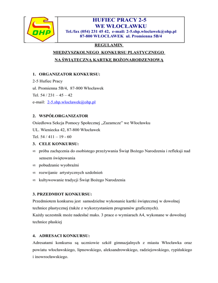 HUFIEC PRACY 2-5 WE WŁOCŁAWKU Tel./fax (054) 231 45 42, e-mail: [email protected] 87-800 WŁOCŁAWEK ul. Promienna 5B/4 REGULAMIN MIĘDZYSZKOLNEGO KONKURSU PLASTYCZNEGO NA ŚWIĄTECZNĄ KARTKĘ BOŻONARODZENIOWĄ 1. ORGANIZATOR KONKURSU: 2-5 Hufiec Pracy ul. Promienna 5B/4, 87-800 Włocławek Tel. 54 / 231 – 45 – 42 e-mail: [email protected] 2. WSPÓŁORGANIZATOR Osiedlowa Sekcja Pomocy Społecznej „Zazamcze” we Włocławku UL. Wieniecka 42, 87-800 Włocławek Tel. 54 / 411 – 19 - 60 3. CELE KONKURSU: • próba zachęcenia do osobistego przeżywania Świąt Bożego Narodzenia i refleksji nad sensem świętowania • pobudzanie wyobraźni • rozwijanie artystycznych uzdolnień • kultywowanie tradycji Świąt Bożego Narodzenia 3. PRZEDMIOT KONKURSU: Przedmiotem konkursu jest samodzielne wykonanie kartki świątecznej w dowolnej technice plastycznej (także z wykorzystaniem programów graficznych). Każdy uczestnik może nadesłać maks. 3 prace o wymiarach A4, wykonane w dowolnej technice płaskiej 4. ADRESACI KONKURSU: Adresatami konkursu są uczniowie szkół gimnazjalnych z miasta Włocławka oraz powiatu włocławskiego, lipnowskiego, aleksandrowskiego, radziejowskiego, rypińskiego i inowrocławskiego. W konkursie może wziąć udział wielu uczniów z danej szkoły. Każdy uczeń ma prawo przesłać maksymalnie 3 prace konkursowe. 5. WARUNKI UCZESTNICTWA: §1. Warunkiem uczestnictwa w konkursie jest: 1. Przesłanie lub osobiste dostarczenie wykonanej pracy najpóźniej do dnia 15 grudnia 2014 r. na adres: 2-5 Hufiec Pracy ul. Promienna 5b/4 , 87-800 Włocławek 2. Dostarczenie wraz z pracą konkursową oświadczenia rodziców/opiekunów o akceptacji regulaminu i wyrażeniu zgody na publikowanie danych osobowych ucznia (uczestnika konkursu) oraz jego wyników w konkursie ( w przypadku uczestników pełnoletnich oświadczenie uczestnika). §2. Wszystkie prace winny być opatrzone opisem zawierającym następujące dane: 1. Nazwa, adres szkoły, klasa 2. Imię i nazwisko ucznia 3. Imię i nazwisko nauczyciela, opiekuna sprawującego opiekę nad uczestnikiem §3. 1. Każdy uczeń uczeń/uczestnik może przesłać na konkurs maksymalnie 3 prace konkursowe. 2. Prace przesłane na konkurs muszą być wykonane we wskazanym formacie i formie. Inne prace nie spełniające warunków konkursu nie będą brane pod uwagę przez komisję konkursową. 3. Nadesłane prace przechodzą na własność organizatora. 4. Organizator zastrzega sobie prawo do bezpłatnej prezentacji i publikacji prac. 5. Uczestnik konkursu wyraża zgodę na wykorzystanie swojego wizerunku i danych osobowych w środkach masowego przekazu i publikacjach wraz z informacją o konkursie. 6. Nadesłanie prac jest jednoznaczne z uznaniem regulaminu. 7. Komisja zastrzega sobie prawo do zmiany regulaminu konkursu. 6. KOMISJA KONKURSOWA I OCENA PRAC: 1. Ocenę prac oraz rozstrzygniecie konkursu przeprowadzi Komisja Konkursowa powołana przez Organizatora. 2. Do zadań Komisji konkursowej należy w szczególności: 1) Czuwanie nad prawidłowym przebiegiem Konkursu, tj. dotrzymanie terminu dostarczenia prac konkursowych i ich zabezpieczenie 2) Ustalenie zwycięzców 3) Interpretacja niniejszego regulaminu 4) Rozstrzyganie sposób związanych z Konkursem 7. KRYTERIA OCENY PRAC KONKURSOWYCH: Kryteria oceny prac: 1) zgodność tematu pracy z tematem konkursu, 2) wartość artystyczna pracy 3) oryginalność podejścia do tematu, kreatywność autora 4) trafność i pomysłowość w interpretacji tematu 5) samodzielność 6) estetyka wykonania 8. ROZSTRZYGNIĘCIE KONKURSU. Rozstrzygniecie konkursu, prezentacja najciekawszych prac oraz wręczenie nagród odbędzie się podczas imprezy świątecznej „Najpiękniejsza choinka w mieście”, która odbędzie się na terenie Osiedlowej Sekcji Pomocy Społecznej „Zazamcze” we Włocławku, przy ul. Wienieckiej w dniu 19.12.2014 r o godz. 15.00 Szczegółowe informacje zostaną przekazane telefonicznie do szkół, oraz zamieszczone na portalach internetowych miasta Włocławka. 9. NAGRODY 1) Laureaci zostaną uhonorowani cennymi nagrodami rzeczowymi i dyplomami podczas imprezy finałowej. 2) Decyzję o ilości oraz rodzaju nagród i wyróżnień dla laureatów konkursu podejmą organizatorzy. 3) Decyzje Komisji oceniającej będą ostateczne. 10. POSTANOWIENIA KOŃCOWE. §1. 1) Udział w konkursie jest jednoznaczny z przeniesieniem praw autorskich do pracy dostarczonej Organizatorowi Konkursu na wszystkich polach eksploatacji, które są znane w chwili przystąpienia do konkursu – ustawa z dnia 4 lutego 1994 roku o prawie autorskim i prawach pokrewnych (Dz.U.2006.90.631 j.t. z późń.zm). 2) Uczestnik Konkursu wyraża zgodę na gromadzenie i przetwarzanie przez organizatora danych osobowych na potrzeby konkursu – ustawa z 29 sierpnia 1997r. o ochronie danych osobowych (Dz.U.2002.101.926 j.t. z późn.zm.). 3) Prace zgłoszone do Konkursu nie będą zwracane uczestnikowi. §2. Regulamin konkursu wraz z załącznikami dostępny jest na stronie internetowej: http://www.Q4.pl/ 1) Regulamin wraz z załącznikami może zostać przesłany również na adres e-mail uczestnika lub szkoły po uprzednim zgłoszeniu zapotrzebowania na adres e-mail Organizatora - e-mail: [email protected] 11. KALENDARIUM KONKURSU: 1) Termin nadsyłania prac do organizatora – 15.12.2014r. (decyduje data wpływu prac do Organizatora) . 2) Impreza finałowa – rozstrzygnięcie konkursu, ogłoszenie i uhonorowanie laureatów – 19.12.2014r.