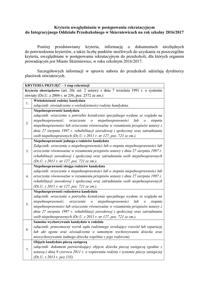 Kryteria uwzględnianie w postępowaniu rekrutacyjnym do Integracyjnego Oddziału Przedszkolnego w Skierniewicach na rok szkolny 2016/2017 Poniżej przedstawiamy kryteria, informację o dokumentach niezbędnych do potwierdzenia kryteriów, a także liczbę punktów możliwych do uzyskania za poszczególne kryteria, uwzględniane w postępowaniu rekrutacyjnym do przedszkoli, dla których organem prowadzącym jest Miasto Skierniewice, w roku szkolnym 2016/2017. Szczegółowych informacji w sprawie naboru do przedszkoli udzielają dyrektorzy placówek oświatowych. KRYTERIA PRZYJĘĆ – 1 etap rekrutacji Kryteria obowiązkowe (art. 20c ust. 2 ustawy z dnia 7 września 1991 r. o systemie oświaty (Dz.U. z 2004 r. nr 256, poz. 2572 ze zm.) 1. Wielodzietność rodziny kandydata załącznik: oświadczenie o wielodzietności rodziny kandydata. Niepełnosprawność kandydata 2. załącznik: orzeczenie o potrzebie kształcenia specjalnego wydane ze względu na niepełnosprawność, orzeczenie o niepełnosprawności lub o stopniu niepełnosprawności lub orzeczenie równoważne w rozumieniu przepisów ustawy z dnia 27 sierpnia 1997 r. rehabilitacji zawodowej i społecznej oraz zatrudnianiu osób niepełnosprawnych (Dz.U. z 2011 r. nr 127, poz. 721 ze zm.). Niepełnosprawność jednego z rodziców kandydata 3. Załącznik: orzeczenie o niepełnosprawności lub o stopniu niepełnosprawności lub orzeczenie równoważne w rozumieniu przepisów ustawy z dnia 27 sierpnia 1997 r. rehabilitacji zawodowej i społecznej oraz zatrudnianiu osób niepełnosprawnych (Dz.U. z 2011 r. nr 127, poz. 721 ze zm.). Niepełnosprawność obojga rodziców kandydata 4. załącznik: orzeczenie o niepełnosprawności lub o stopniu niepełnosprawności lub orzeczenie równoważne w rozumieniu przepisów ustawy z dnia 27 sierpnia 1997 r. rehabilitacji zawodowej i społecznej oraz zatrudnianiu osób niepełnosprawnych (Dz.U. z 2011 r. nr 127, poz. 721 ze zm.). Niepełnosprawność rodzeństwa kandydata 5. załącznik: orzeczenie o potrzebie kształcenia specjalnego wydane ze względu na niepełnosprawność, orzeczenie o niepełnosprawności lub o stopniu niepełnosprawności lub orzeczenie równoważne w rozumieniu przepisów ustawy z dnia 27 sierpnia 1997 r. rehabilitacji zawodowej i społecznej oraz zatrudnianiu osób niepełnosprawnych (Dz.U. z 2011 r. nr 127, poz. 721 ze zm.). Samotne wychowywanie kandydata w rodzinie 6. załącznik: prawomocny wyrok sądu rodzinnego orzekający rozwód lub separację lub akt zgonu oraz oświadczenie o samotnym wychowywaniu dziecka oraz niewychowywaniu żadnego dziecka wspólnie z jego rodzicem). Objęcie kandydata pieczą zastępczą 7. załącznik: dokument potwierdzający objęcie dziecka pieczą zastępczą zgodnie z ustawą z dnia 9 czerwca 2011 r. o wspieraniu rodziny i systemie pieczy zastępczej (Dz.U. z 2013 r. poz.135). KRYTERIA DODATKOWE – 2 etap rekrutacji (Zarządzeniu Nr 22.2016 Prezydenta Miasta Skierniewice z dnia 27 stycznia 2016 r. w sprawie harmonogramu czynności w postępowaniu rekrutacyjnym oraz postępowaniu uzupełniającym do przedszkoli, dla których organem prowadzącym jest Miasto Skierniewice, na rok szkolny 2016/2017) Lp. nazwa kryterium 1 2 3 4 5 Dzieci, którym gmina zobowiązana jest zapewnić na mocy odrębnych przepisów miejsce realizacji prawa do korzystania z wychowania przedszkolnego Dzieci, których rodzeństwo (w roku szkolnym, którego dotyczy nabór) będzie uczęszczać do tego samego przedszkola / oddziału przedszkolnego w szkole podstawowej Dzieci, których obydwoje rodzice / opiekunowie prawni pracują lub prowadzą działalność gospodarczą lub pobierają naukę w systemie dziennym Dzieci, które (w roku poprzedzającym rok szkolny, którego dotyczy nabór) uczęszczały do żłobka Kryterium dochodowe, w stosunku procentowym do kwoty, o której mowa w art. 5 ust. 1 ustawy z dnia 28 listopada 2003 r. o świadczeniach rodzinnych: 19,999% i mniej 20% - 39,999% 40% - 59,999% 60% - 79,999% 80% - 100% powyżej 100% liczba punktów dokumenty niezbędne do potwierdzania kryteriów 51 pkt oświadczenie rodzica / opiekuna prawnego kandydata 25 pkt oświadczenie rodzica / opiekuna prawnego kandydata 14 pkt oświadczenie rodzica / opiekuna prawnego kandydata 5 pkt oświadczenie rodzica / opiekuna prawnego kandydata od 0 – 5 pkt 5 pkt 4 pkt 3 pkt 2 pkt 1 pkt 0 pkt oświadczenie rodzica / opiekuna prawnego kandydata Podstawa prawna: Rozporządzeniem Ministra Edukacji Narodowej z dnia 2 listopada 2015 r. w sprawie sposobu przeliczania na punkty poszczególnych kryteriów uwzględnianych w postępowaniu rekrutacyjnym, składu i szczegółowych zadań komisji rekrutacyjnej, szczegółowego trybu i terminów przeprowadzania postępowania rekrutacyjnego oraz postępowania uzupełniającego.