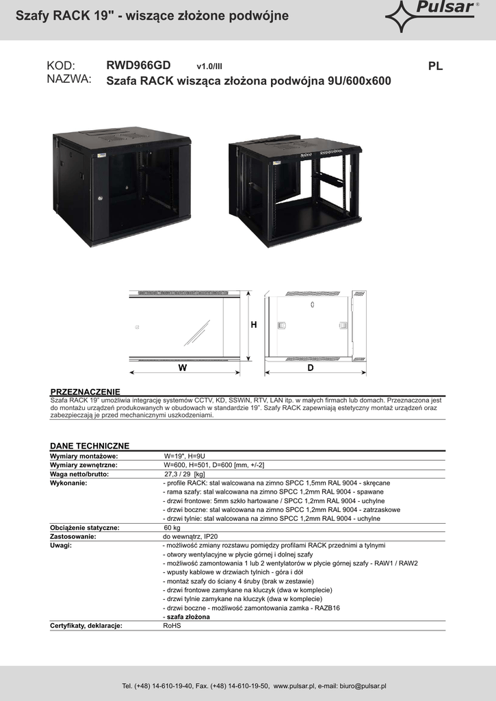 Szafy RACK 19" - wiszące złożone podwójne KOD: NAZWA: Pulsar RWD966GD v1.0/III Szafa RACK wisząca złożona podwójna 9U/600x600 PL PRZEZNACZENIE Szafa RACK 19” umożliwia integrację systemów CCTV, KD, SSWiN, RTV, LAN itp. w małych firmach lub domach. Przeznaczona jest do montażu urządzeń produkowanych w obudowach w standardzie 19”. Szafy RACK zapewniają estetyczny montaż urządzeń oraz zabezpieczają je przed mechanicznymi uszkodzeniami. DANE TECHNICZNE Wymiary montażowe: Wymiary zewnętrzne: Waga netto/brutto: Wykonanie: Obciążenie statyczne: Zastosowanie: Uwagi: Certyfikaty, deklaracje: W=19", H=9U W=600, H=501, D=600 [mm, +/-2] 27,3 / 29 [kg] - profile RACK: stal walcowana na zimno SPCC 1,5mm RAL 9004 - skręcane - rama szafy: stal walcowana na zimno SPCC 1,2mm RAL 9004 - spawane - drzwi frontowe: 5mm szkło hartowane / SPCC 1,2mm RAL 9004 - uchylne - drzwi boczne: stal walcowana na zimno SPCC 1,2mm RAL 9004 - zatrzaskowe - drzwi tylnie: stal walcowana na zimno SPCC 1,2mm RAL 9004 - uchylne 60 kg do wewnątrz, IP20 - możliwość zmiany rozstawu pomiędzy profilami RACK przednimi a tylnymi - otwory wentylacyjne w płycie górnej i dolnej szafy - możliwość zamontowania 1 lub 2 wentylatorów w płycie górnej szafy - RAW1 / RAW2 - wpusty kablowe w drzwiach tylnich - góra i dół - montaż szafy do ściany 4 śruby (brak w zestawie) - drzwi frontowe zamykane na kluczyk (dwa w komplecie) - drzwi tylnie zamykane na kluczyk (dwa w komplecie) - drzwi boczne - możliwość zamontowania zamka - RAZB16 - szafa złożona RoHS Tel. (+48) 14-610-19-40, Fax. (+48) 14-610-19-50, www.pulsar.pl, e-mail: [email protected] ®
