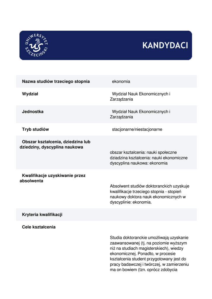 Nazwa studiów trzeciego stopnia ekonomia Wydział Wydział Nauk Ekonomicznych i Zarządzania Jednostka Wydział Nauk Ekonomicznych i Zarządzania Tryb studiów stacjonarne/niestacjonarne Obszar kształcenia, dziedzina lub dziedziny, dyscyplina naukowa obszar kształcenia: nauki społeczne dziadzina kształcenia: nauki ekonomiczne dyscyplina naukowa: ekonomia Kwalifikacje uzyskiwanie przez absolwenta Absolwent studiów doktoranckich uzyskuje kwalifikacje trzeciego stopnia - stopień naukowy doktora nauk ekonomicznych w dyscyplinie: ekonomia. Kryteria kwalifikacji Cele kształcenia Studia doktoranckie umożliwają uzyskanie zaawansowanej (tj. na poziomie wyższym niż na studiach magisterskiech), wiedzy ekonomicznej. Ponadto, w procesie kształcenia student przygotowany jest do pracy badawczej i twórczej, w zamierzeniu ma on bowiem (tzn. oprócz zdobycia zaawansowanej wiedzy) przygotować rozprawę doktorską. Możliwości zatrudnienia Absolwent studiów doktoranckich uzyskuje kwalifikacje trzeciego stopnia - stopień naukowy doktora nauk ekonomicznych w dyscyplinie: ekonomia. Wymagania wstępne oraz kryteria kwalifikacji Rekrutacja na studia doktoranckie (stacjonarne, niestacjonarne) odbywa się w drodze konkursu. Podstawą kwalifikacji jest liczba uzyskanych punktów przyznawanych według schematu: Lp. 1 Kryteria kwalifikacji Studia stacjonarne: ocena na dyplomie ukońc dziedzinie nauk ekonomicznych – jednolitych ma studiów I i II stopnia, z oceną co najmnie Studia niestacjonarne: ocena na dyplomie uko - jednolitych magisterskich albo studiów I i II sto najmniej dobrą. Zasady punktacji: Ocena dobra – 12 pkt Ocena dobra plus – 16 pkt 2 3 4 5 6 7 Ocena bardzo dobra – 20 pkt Średnia ocen z przebiegu studiów będzie przelic zgodnie z następującą zasadą: kandydat uzyska 3,0 i 1 pkt za każdą pełną 0,1 części całkowit studiów powyżej 3,0. Ocena projektu badawczego dotyczącego pla doktorskiej (do 10 stron), rozmowa kwali Udokumentowana znajomość języka o Udokumentowana praca w kołach nau Udokumentowane publikacje nauko Udokumentowany udział w konferencjach 8 Laureaci Diamentowego Grantu, ukończen podyplomowych MBA Łącznie Przeliczanie liczby uzyskanych punktów na ocenę: 0– 50 pkt – ocena niedostateczna 51 – 60 pkt – ocena dostateczna 61 – 70 pkt – ocena dostateczna plus 71 – 80 pkt – ocena dobra 81 – 90 pkt – ocena dobra plus 91 – 100 pkt – ocena bardzo dobra Do podjęcia studiów doktoranckich i realizacji projektu badawczego pod kierunkiem opiekuna naukowego może zostać wybrany kandydat, który uzyskał w postępowaniu rekrutacyjnym więcej niż połowę maksymalnej liczby punktów. Przyjęcia na studia trzeciego stopnia odbywać się będą w ramach uchwalonego przez Senat Uniwersytetu Szczecińskiego limitu miejsc. Decyzję o przyjęciu na studia trzeciego stopnia podejmuje wydziałowa komisja rekrutacyjna. Oddecyzjiwydziałowejkomisjirekrutacyjnej służy odwołanie do rektora w terminie 14 dni od daty doręczenia decyzji. Podstawą odwołania może być jedynie naruszenie warunków i trybu rekrutacji na studia trzeciego stopnia w roku akademickim 2015/2016. Decyzja rektora jest ostateczna. Czas trwania studiów <p>8 semestrów</p> Terminy <p>Materiał w przygotowaniu</p> Opłaty Materiał w przygotowaniu Kontakt Masz pytania? [email protected] Biuro ds. Rekrutacji tel.: +48 91 444 10 29, +48 91 444 10 31, +48 91 444 11 60 Powered by TCPDF (www.tcpdf.org)