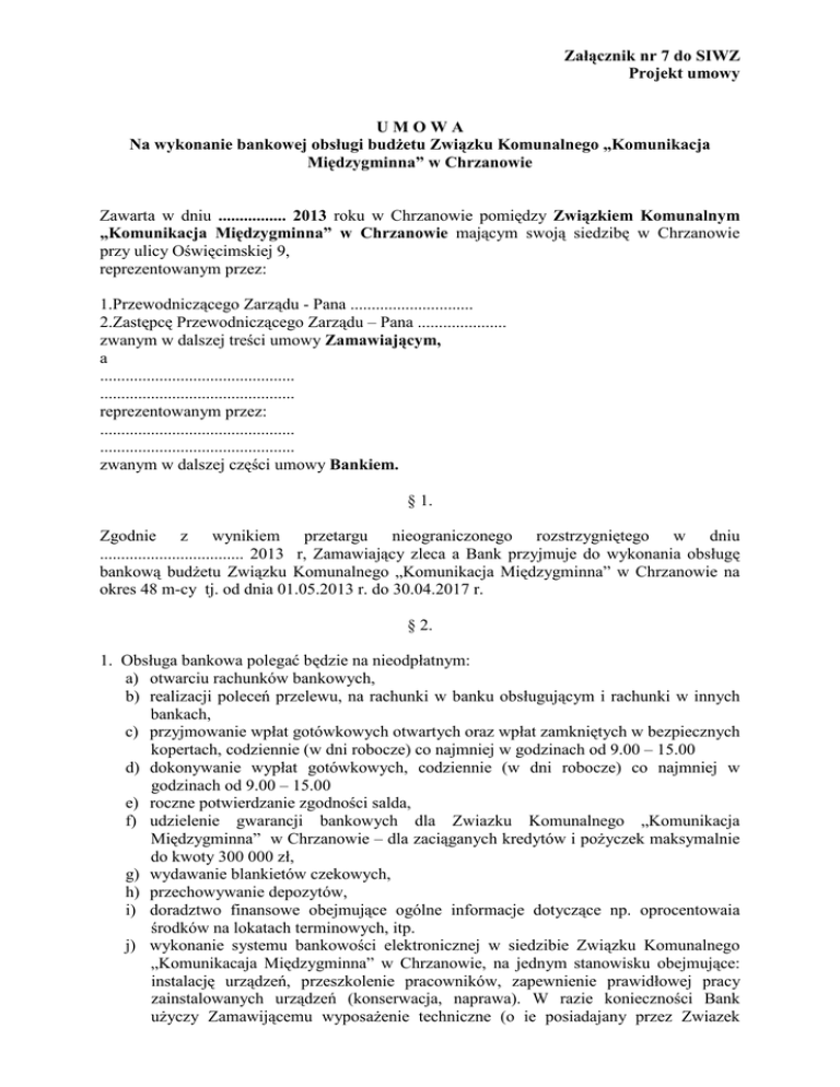 Załącznik nr 7 do SIWZ Projekt umowy UMOWA Na wykonanie bankowej obsługi budżetu Związku Komunalnego „Komunikacja Międzygminna” w Chrzanowie Zawarta w dniu ................ 2013 roku w Chrzanowie pomiędzy Związkiem Komunalnym „Komunikacja Międzygminna” w Chrzanowie mającym swoją siedzibę w Chrzanowie przy ulicy Oświęcimskiej 9, reprezentowanym przez: 1.Przewodniczącego Zarządu - Pana ............................. 2.Zastępcę Przewodniczącego Zarządu – Pana ..................... zwanym w dalszej treści umowy Zamawiającym, a .............................................. .............................................. reprezentowanym przez: .............................................. .............................................. zwanym w dalszej części umowy Bankiem. § 1. Zgodnie z wynikiem przetargu nieograniczonego rozstrzygniętego w dniu .................................. 2013 r, Zamawiający zleca a Bank przyjmuje do wykonania obsługę bankową budżetu Związku Komunalnego „Komunikacja Międzygminna” w Chrzanowie na okres 48 m-cy tj. od dnia 01.05.2013 r. do 30.04.2017 r. § 2. 1. Obsługa bankowa polegać będzie na nieodpłatnym: a) otwarciu rachunków bankowych, b) realizacji poleceń przelewu, na rachunki w banku obsługującym i rachunki w innych bankach, c) przyjmowanie wpłat gotówkowych otwartych oraz wpłat zamkniętych w bezpiecznych kopertach, codziennie (w dni robocze) co najmniej w godzinach od 9.00 – 15.00 d) dokonywanie wypłat gotówkowych, codziennie (w dni robocze) co najmniej w godzinach od 9.00 – 15.00 e) roczne potwierdzanie zgodności salda, f) udzielenie gwarancji bankowych dla Zwiazku Komunalnego „Komunikacja Międzygminna” w Chrzanowie – dla zaciąganych kredytów i pożyczek maksymalnie do kwoty 300 000 zł, g) wydawanie blankietów czekowych, h) przechowywanie depozytów, i) doradztwo finansowe obejmujące ogólne informacje dotyczące np. oprocentowaia środków na lokatach terminowych, itp. j) wykonanie systemu bankowości elektronicznej w siedzibie Związku Komunalnego „Komunikacaja Międzygminna” w Chrzanowie, na jednym stanowisku obejmujące: instalację urządzeń, przeszkolenie pracowników, zapewnienie prawidłowej pracy zainstalowanych urządzeń (konserwacja, naprawa). W razie konieczności Bank użyczy Zamawijącemu wyposażenie techniczne (o ie posiadajany przez Zwiazek system nie będzie współpracował z systemem wykonawcy.) Dostarczone oprogramowanie będzie kompatybilne z oprogramowaniem finansowo-księgowym Zamawiającego. k) automatycznym lokowaniu środkow pieniężnych na lokatach overnight. znajdujących się na rachunkach na koniec dnia - ostatnia operacja danego dnia, bez dodatkowych opłat, na podstawie pisemnego odrębnego wniosku Zamawiającego. 2. Pozycje nie ujęte w umowie, a występujące w taryfie opłat Banku nie będą podlegały dodatkowym opłatom. 3. Pozostałe usługi bankowe wykonywane w ramach zamówienia: a) umieszczanie wolnych środków na lokatach krótkoterminowych (w tym również typu overnight). Oprocentowanie środków oparte będzie na stawce WIBID dla 1miesięcznych złotowych depozytów międzybankowych wyliczonej jako średnia z miesiąca poprzedzającego okres obrachunkowy, pomniejszone o marżę banku w wysokości ....... Marża banku winna być podana w % i stała w okresie obowiązywania umowy. Oprocentowanie na lokatach O/N będzie dopisywane po zakończeniu lokaty i naliczane wg zmiennej stopy procentowej. b) możliwość zaciągania kredytów krótkoterminowych w rachunku bieżącym do kwoty 300 000 zł, oprocentowanie kredytu w rachunku bieżącym oparte będzie na stawce WIBOR dla 1 miesięcznych złotowych depozytów międzybankowych wyliczanych jako średnia z miesiąca poprzedzającego okres obrachunkowy, powiększonej o stałą marżę banku w wysokości...... % podanej w ofercie. c) oprocentowanie środków pieniężnych gromadzonych na rachunkach bankowych oparte będzie na stawce WIBID dla 1- miesięcznych złotowych depozytów międzybankowych wyliczonej jako średnia z miesiąca poprzedzającego okres obrachunkowy, Oprocentowanie dopisywane pomniejszone o marżę banku w wysokości.......... będzie w okresach miesięcznych w ostatnim dniu. Marża banku winna być podana w % i stała w okresie obowiązywania umowy. § 3. Dodatkowo Bank zobowiązuje się nieodpłatnie w terminie od 01.05.2013 r. do uruchomienia w centrum miasta Chrzanowa punktu kasowego, który zapewni pełną obsługę budżetu Zamawiającego oraz wskaże stanowisko, na którym pracownicy Zamawiającego będą obsługiwani poza kolejnością. § 4. 1. Bank realizuje wyłącznie dyspozycje pieniężne z rachunku Zamawiającego, podpisane przez osoby upoważnione wymienione w kartach wzorów podpisów będących integralną częścią niniejszej umowy. 2. Strony uzgadniają, że wyciągi z rachunku bankowego z ustaleniem salda będą wydawane przez Bank wyłącznie osobom wymienionym w kartach wzorów podpisów oraz innym osobom upoważnionym pisemnie. §5 Rozliczenia pomiędzy Zamawiającym a Bankiem dokonywane będą w złotych polskich. §6 1. Za prowadzenie rachunków Zamawiającego (podstawowego i pomocniczych) Bank będzie pobierał ryczałt w wysokości : ............................... zł. (słownie: .........................................................................................................00 /100 zł) miesięcznie. 2. Określone w pkt 1 wynagrodzenie ryczałtowe za wykonywanie usług oraz marże i prowizje określone w § 2 pkt 3 będą stałe przez cały czas trwania umowy. 3. Maksymalną wartość nominalną zobowiązania należną do zapłaty, zgodnie z art. 44 ustawy z dnia 27.08.2009 roku o Finansach publicznych roku (Dz.U z 2009 Nr 157 poz.1240 ze zm.) za wykonanie czynności określonej w pkt. 1 ustala się na kwotę .................................... zł . 4. Zamawiający upoważnia Bank do pobierania wymienionych ryczałtów w formi