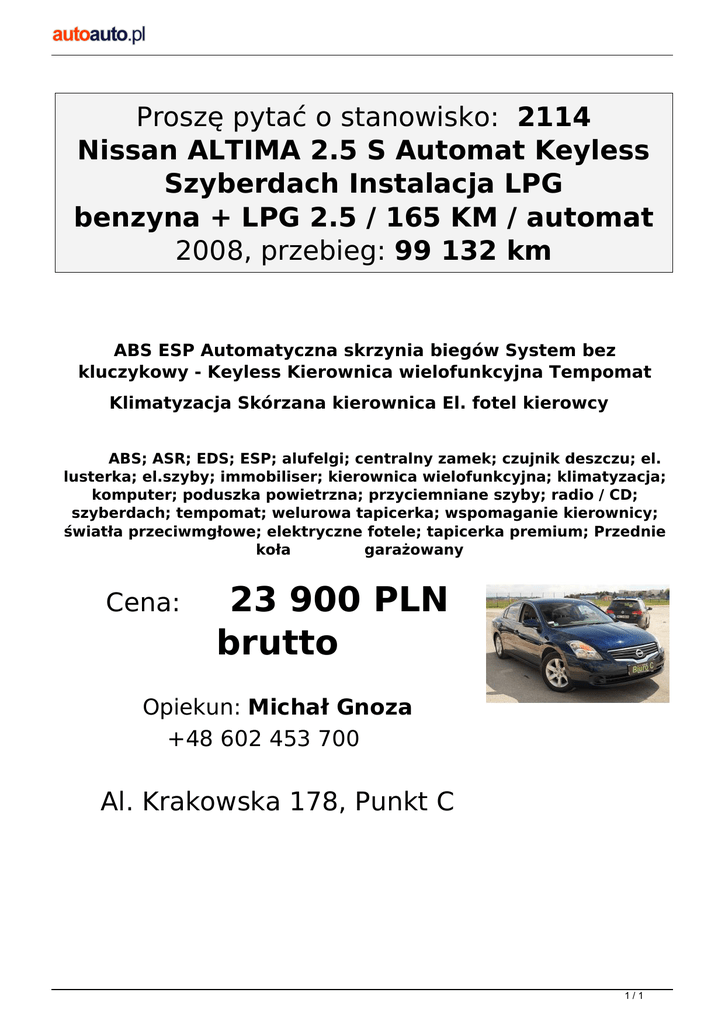 Proszę pytać o stanowisko: 2114 Nissan ALTIMA 2.5 S Automat Keyless Szyberdach Instalacja LPG benzyna + LPG 2.5 / 165 KM / automat 2008, przebieg: 99 132 km ABS ESP Automatyczna skrzynia biegów System bez kluczykowy - Keyless Kierownica wielofunkcyjna Tempomat Klimatyzacja Skórzana kierownica El. fotel kierowcy ABS; ASR; EDS; ESP; alufelgi; centralny zamek; czujnik deszczu; el. lusterka; el.szyby; immobiliser; kierownica wielofunkcyjna; klimatyzacja; komputer; poduszka powietrzna; przyciemniane szyby; radio / CD; szyberdach; tempomat; welurowa tapicerka; wspomaganie kierownicy; światła przeciwmgłowe; elektryczne fotele; tapicerka premium; Przednie koła garażowany Cena: 23 900 PLN brutto Opiekun: Michał Gnoza +48 602 453 700 Al. Krakowska 178, Punkt C 1/1