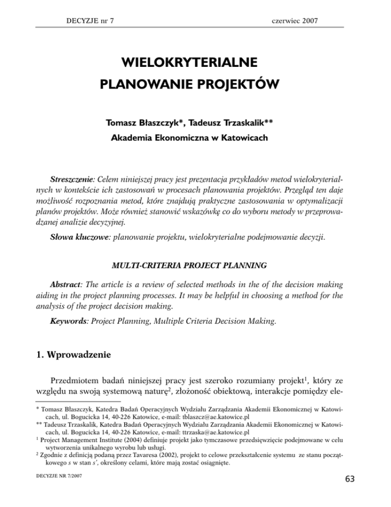 DECYZJE nr 7 czerwiec 2007 WIELOKRYTERIALNE PLANOWANIE PROJEKTÓW Tomasz B³aszczyk*, Tadeusz Trzaskalik** Akademia Ekonomiczna w Katowicach Streszczenie: Celem niniejszej pracy jest prezentacja przykładów metod wielokryterialnych w kontekście ich zastosowań w procesach planowania projektów. Przegląd ten daje możliwość rozpoznania metod, które znajdują praktyczne zastosowania w optymalizacji planów projektów. Może również stanowić wskazówkę co do wyboru metody w przeprowadzanej analizie decyzyjnej. Słowa kluczowe: planowanie projektu, wielokryterialne podejmowanie decyzji. MULTI-CRITERIA PROJECT PLANNING Abstract: The article is a review of selected methods in the of the decision making aiding in the project planning processes. It may be helpful in choosing a method for the analysis of the project decision making. Keywords: Project Planning, Multiple Criteria Decision Making. 1. Wprowadzenie Przedmiotem badań niniejszej pracy jest szeroko rozumiany projekt1, który ze względu na swoją systemową naturę2, złożoność obiektową, interakcje pomiędzy ele* Tomasz Błaszczyk, Katedra Badań Operacyjnych Wydziału Zarządzania Akademii Ekonomicznej w Katowicach, ul. Bogucicka 14, 40-226 Katowice, e-mail: [email protected] ** Tadeusz Trzaskalik, Katedra Badań Operacyjnych Wydziału Zarządzania Akademii Ekonomicznej w Katowicach, ul. Bogucicka 14, 40-226 Katowice, e-mail: [email protected] 1 Project Management Institute (2004) definiuje projekt jako tymczasowe przedsięwzięcie podejmowane w celu wytworzenia unikalnego wyrobu lub usługi. 2 Zgodnie z definicją podaną przez Tavaresa (2002), projekt to celowe przekształcenie systemu ze stanu początkowego s w stan s’, określony celami, które mają zostać osiągnięte. DECYZJE NR 7/2007 63 WIELOKRYTERIALNE PLANOWANIE PROJEKTÓW mentami wewnątrz oraz na zewnątrz systemu, podlega wielokryterialnej ocenie przez decydentów reprezentujących odmienne stanowiska i różne preferencje. Szczególną uwagę zwrócono na ocenę planu projektu przez decydentów, którzy dążą do jego pomyślnego zakończenia. „Pomyślność” nie jest jednakże kryterium samym w sobie, jest jedynie sformułowaniem agregującym oczekiwania dotyczące osiągnięcia celów w warunkach ograniczających ich realizację w praktyce. Oczekiwania te, zgłaszane niejednokrotnie przez wielu uczestników procesów planowania projektów, mogą stanowić kryteria decyzyjne, brane pod uwagę przy wyborze środka, za pomocą którego cele decydentów mają zostać osiągnięte lub rozwiązania, które będą w postaci projektu realizowane. Celem pracy jest przedstawienie stanu badań nad zastosowaniem wielokryterialnych metod oceny projektów oraz wskazanie, na podstawie przeglądu literatury, możliwości zastosowań istniejących narzędzi w szerokim zakresie problemów występujących podczas planowania projektów. W drugim rozdziale pracy omówiono procesy planowania projektów w kontekście ich definicji oraz umiejscowienia w cyklu życia projektu. Rozdział trzeci obejmuje omówienie zagadnienia wielokryterialności w projektach, wraz z opisem przykładowych kryteriów, stosowanych do oceny różnego rodzaju przedsięwzięć. W czwartym rozdziale pracy znajduje się ogólna charakterystyka metod wielokryterialnych przywołanych następnie w przykładach stanowiących literaturowy przegląd dotychczasowych ich zastosowań w planowaniu projektów. Przykłady te, przedstawione w rozdziale piątym, podzielono na cztery następujące grupy: • klasa projektów inżynieryjnych, dla których uwzględniano aspekty techniczne lub technologiczne, • klasa projektów informatycznych, wyróżnione ze względu na specyfikę branży, • klasa projektów infrastrukturalnych, która obejmuje również projekty realizowane w sferze inżynieryjno-informatycznej, w których nie uwzględniano jednakże aspektów technicznych ani technologicznych, • klasa projektów inwestycyjnych, obejmująca pozostałe analizowane przypadki, niezaliczone do klas poprzednich. Pracę kończy podsumowanie (rozdział szósty) obejmujące dyskusję nad klasami problemów decyzyjnych, w których przytoczone metody znajdują zastosowanie oraz wykaz wykorzystanej literatury. 64 DECYZJE NR 7/2007 Tomasz Błaszczyk, Tadeusz Trzaskalik 2. Planowanie projektu Niepewność i ryzyko, którymi w różnym stopniu obarczone są wszystkie prognozy i założenia dotyczące stanu systemu i jego otoczenia w przyszłości, powodują konieczność badania wrażliwości systemu i planowania zabezpieczeń w razie wystąpienia warunków niekorzystnych. Praktyczne doświadczenia dowodzą, że koszty reakcji na zaistniałe w fazie realizacji zagrożenia projektu i poniesione straty są zazwyczaj niewspółmiernie wyższe od dodatkowych nakładów, które należałoby ponieść, aby planując projekt zapobiec im lub znacznie zmniejszyć prawdopodobieństwo ich wystąpienia. Stąd też to właśnie w fazie planowania projektu kładzie się szczególny nacisk na dogłębność i kompleksowość analiz decyzyjnych. Według wytycznych Project Management Institute (2004) planowanie projektu obejmuje następujące procesy: opracowywanie planu projektu, planowanie i dopracowywanie planu zakresu, identyfikację działań, określenie ich kolejności oraz szacowanie czasu trwania dla potrzeb opracowania harmonogramu, planowanie zasobów, szacowanie i budżetowanie kosztów, planowanie jakości, planowanie organizacyjne i pozyskiwanie personelu, planowanie komunikacji, planowanie zarządzania ryzykiem, identyfikację ryzyka, ich ilościową oraz jakościową analizę, a także planowanie reakcji na ryzyko, planowanie zamówień oraz zapytań. 3. Kryteria wykorzystywane w ocenie projektów W praktyce zarządzania projektami ocena prospektywna zajmuje szczególne miejsce – jest narzędziem niezbędnym w procesach planowania zarówno na poziomie operacyjnym, taktycznym oraz strategicznym. Innymi słowy, ocena a