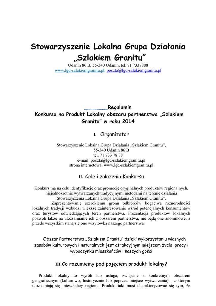 Stowarzyszenie Lokalna Grupa Działania „Szlakiem Granitu” Udanin 86 B, 55-340 Udanin, tel. 71 7337888 www.lgd-szlakiemgranitu.pl; [email protected] Regulamin Konkursu na Produkt Lokalny obszaru partnerstwa „Szlakiem Granitu” w roku 2014 I. Organizator Stowarzyszenie Lokalna Grupa Działania „Szlakiem Granitu”, 55-340 Udanin 86 B tel. 71 733 78 88 e-mail: [email protected] strona internetowa: www.lgd-szlakiemgranitu.pl II. Cele i założenia Konkursu Konkurs ma na celu identyfikację oraz promocję oryginalnych produktów regionalnych, niejednokrotnie wytwarzanych tradycyjnymi metodami na terenie działania Stowarzyszenia Lokalna Grupa Działania „Szlakiem Granitu”. Zaprezentowanie szerokiemu gronu odbiorców bogactwa różnorodności lokalnych tradycji wzbudzi większe zainteresowanie wśród potencjalnych konsumentów oraz turystów odwiedzających teren partnerstwa. Prezentacja produktów lokalnych pozwoli także na utożsamianie ich z obszarem partnerstwa, nie będą one anonimowe, a przede wszystkim staną się one wizytówką naszego partnerstwa. Obszar Partnerstwa „Szlakiem Granitu” dzięki wykorzystaniu własnych zasobów kulturowych i naturalnych jest atrakcyjnym miejscem życia, pracy i wypoczynku mieszkańców i naszych gości III. Co rozumiemy pod pojęciem produkt lokalny? Produkt lokalny to wyrób lub usługa, związane z konkretnym obszarem geograficznym (kulturowo, historycznie lub poprzez miejsce wytwarzania), z którym utożsamiają się mieszkańcy regionu. Produkt taki musi charakteryzować się tym, że wytwarzany jest w sposób nie masowy, przyjazny dla środowiska, z surowców lokalnie dostępnych. Produktem lokalnym mogą być produkty spożywcze oraz inne wytwory, takie jak np. rękodzieło artystyczne, imprezy organizowane cyklicznie, usługi agroturystyczne i inne. W ostatnich latach coraz więcej osób postrzega produkty lokalne/regionalne jako atrakcję i uświadamia sobie, że wyjątkowe wyroby związane z kulturą i tradycją poszczególnych regionów Polski, trzeba chronić. IV. Zasady udziału w Konkursie 1. Konkurs ma charakter otwarty. Skierowany jest do osób indywidualnych, amatorów i profesjonalistów, grup formalnych i nieformalnych (np. koła gospodyń wiejskich, stowarzyszenia, rady sołeckie), podmiotów prowadzących działalność na terenie działania LGD „Szlakiem Granitu” (gminy: Dobromierz, Kostomłoty, Jaworzyna Śląska, Strzegom, Świdnica, Żarów i Udanin). 2. Do konkursu mogą być zgłoszone produkty spełniające warunki podanej w niniejszym Regulaminie definicji produktu lokalnego. 3. Warunkiem uczestnictwa w konkursie jest przesłanie na adres Organizatora poprawnie wypełnionych Kart Zgłoszenia Wystawcy wraz z Oświadczeniem do dnia 10 sierpnia 2014 r. 4. Wzory Kart Zgłoszenia Wystawcy wraz z Oświadczeniem do poszczególnych kategorii są udostępnione do pobrania na stronie internetowej Stowarzyszenia i w siedzibie Organizatora. 5. Do Karty Zgłoszenia Wystawcy można dołączyć: a) kopie certyfikatów, wyróżnień, nagród itp. otrzymanych w innych konkursach, b) materiały promocyjne c) zdjęcia na CD do ewentualnego wykorzystania do publikacji o produkcie lokalnym d) zdjęcia w formie papierowej, max. 3 szt. 6. Produkty będą oceniane w następujących kategoriach: 1) Produkty spożywcze: domowe wyroby kulinarne, potrawy tradycyjne, oparte na produktach lokalnych pochodzenia zwierzęcego i roślinnego, domowe wypieki oraz potrawy z runa leśnego; 2) Wyrób lub usługa, związana z obszarem „Granitowego Szlaku” (kulturowo, historycznie lub poprzez miejsce wytwarzania), 3) Napoje regionalne: bezalkoholowe i alkoholowe; 7. Każdy uczestnik Konkursu może zgłosić jeden produkt w każdej kategorii. 8. Wystawcy będą mieć możliwość sprzedaży swoich produktów. V. Miejsce i czas Konkursu 1. Konkurs zostanie rozstrzygnięty w czasie Dożynek 2014 organizowanych na terenie partnerstwa VI. Kryteria oceny 2 1. Komisja Konkursowa powołana przez Organizatora oceni zaprezentowane produkty kulinarne, w dwóch etapach według następujących kryteriów: 1) pierwsze wrażenie (wygląd, estetyka, prezentacja produktu, opakowanie itp.); 2) opis produktu, usługi (wykorzystanie lokalnych surowców, metoda wytworzenia, związek z regionem, historia itp.); 3) doznania smakowe, zapachowe ; 4) cechy charakterystyczne, które wyróżniają produkt spośród innych (np. wyjątkowa jakość, dobra renoma, atrakcyjność, nazwa związana z regionem oraz inne wynikające ze specyfiki obszaru); 5) spełnienie wymogów określonych regulaminem i tematyką konkursu. 2. Ocena w I etapie odbędzie się na podstawie danych zawartych w formularzu zgłoszeniowym (kryterium 5). 3. Ocena w II etapie odbędzie się bezpośrednio na stoisku prezentującym zgłoszony produkt. 4. W obu etapach członkowie Komisji Konkursowej przyznają punkty od 1 do 5. Ich suma decyduje o zajętym miejscu w Konkursie. W przypadku równej ilości punktów decyduje dodatkowy punkt za aranżację stoiska, na którym eksponowano produkt Werdykt Komisji Konkursowej jest niepodważalny i ostateczny. VII. Nagrody 1. Nagrody rzeczowe (drobny sprzęt AGD) dla trzech pierwszych miejsc w poszczególnych kategoriach. 2. Dopuszcza się jedno wyróżnienie w każdej kategorii. Nagrodą będzie dyplom. 3. Pozostali uczestnicy otrzymają dyplom uczestnictwa w konkursie, . 4. Nagrodzone produkty będą bezpłatnie promowane przez LGD poprzez: a) zamieszczenie informacji na stronie internetowej LGD oraz w lokalnej prasie, b) certyfikat „LGD „Szlakiem Granitu – PRODUKT LOKALNY” do oznakowania zwycięskich produktów . c) wszczęcie procedury wpisania produktu na listę prowadzoną przez UMWD d) wszczęcie procedury wpisania na listę prowadzoną przez MRiRW Postanowienia końcowe VIII. 1. Organizator konkursu zastrzega sobie prawo do zmiany w zapisach niniejszego regulaminu oraz do wykorzystania danych osobowych osób biorących udział w konkursie. 2