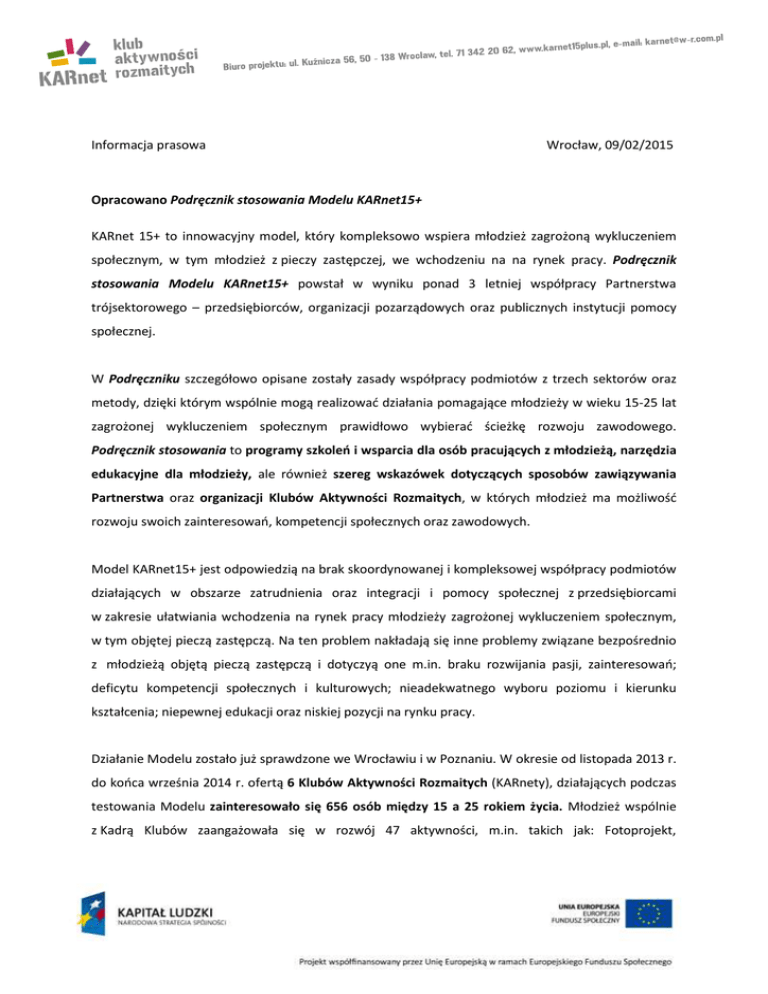 Informacja prasowa Wrocław, 09/02/2015 Opracowano Podręcznik stosowania Modelu KARnet15+ KARnet 15+ to innowacyjny model, który kompleksowo wspiera młodzież zagrożoną wykluczeniem społecznym, w tym młodzież z pieczy zastępczej, we wchodzeniu na na rynek pracy. Podręcznik stosowania Modelu KARnet15+ powstał w wyniku ponad 3 letniej współpracy Partnerstwa trójsektorowego – przedsiębiorców, organizacji pozarządowych oraz publicznych instytucji pomocy społecznej. W Podręczniku szczegółowo opisane zostały zasady współpracy podmiotów z trzech sektorów oraz metody, dzięki którym wspólnie mogą realizować działania pomagające młodzieży w wieku 15-25 lat zagrożonej wykluczeniem społecznym prawidłowo wybierać ścieżkę rozwoju zawodowego. Podręcznik stosowania to programy szkoleń i wsparcia dla osób pracujących z młodzieżą, narzędzia edukacyjne dla młodzieży, ale również szereg wskazówek dotyczących sposobów zawiązywania Partnerstwa oraz organizacji Klubów Aktywności Rozmaitych, w których młodzież ma możliwość rozwoju swoich zainteresowań, kompetencji społecznych oraz zawodowych. Model KARnet15+ jest odpowiedzią na brak skoordynowanej i kompleksowej współpracy podmiotów działających w obszarze zatrudnienia oraz integracji i pomocy społecznej z przedsiębiorcami w zakresie ułatwiania wchodzenia na rynek pracy młodzieży zagrożonej wykluczeniem społecznym, w tym objętej pieczą zastępczą. Na ten problem nakładają się inne problemy związane bezpośrednio z młodzieżą objętą pieczą zastępczą i dotyczyą one m.in. braku rozwijania pasji, zainteresowań; deficytu kompetencji społecznych i kulturowych; nieadekwatnego wyboru poziomu i kierunku kształcenia; niepewnej edukacji oraz niskiej pozycji na rynku pracy. Działanie Modelu zostało już sprawdzone we Wrocławiu i w Poznaniu. W okresie od listopada 2013 r. do końca września 2014 r. ofertą 6 Klubów Aktywności Rozmaitych (KARnety), działających podczas testowania Modelu zainteresowało się 656 osób między 15 a 25 rokiem życia. Młodzież wspólnie z Kadrą Klubów zaangażowała się w rozwój 47 aktywności, m.in. takich jak: Fotoprojekt, Informacja prasowa Wrocław, 09/02/2015 Okołomuzycznik, Klub Filmowy, Zdrowy Styl Życia, Kuchenne Przygody. Uczestnicy wysoko oceniali przede wszystkim formę organizacji aktywności oraz fakt, że mieli bezpośredni wpływ na rodzaj podejmowanych w Klubie działań. Model KARnet15+ poprzez zaproponowane metody i techniki pracy z młodzieżą w pełni realizuje zasadnicze cele związane z pobudzaniem rozwoju pasji i zainteresowań młodzieży uczestniczącej w zajęciach oraz założenia pracy systemowej skoncentrowanej na zasobach. Podręcznik stosowania Modelu KARnet15+ jest dostępny w wersji elektronicznej na stronie projektu: www.karnet15plus.pl/produkt-finalny-model-karnet15/. W tym miejscu można się również zapoznać ze szczegółowymi wnioskami z okresu testowania Modelu i Klubów Aktywności Rozmaitych. Inicjatorem i Liderem Partnerstwa realizującego projekt „KARnet 15+ – model współpracy trójsektorowej” jest Wrocławska Rewitalizacja Spółka z ograniczoną odpowiedzialnością. Partnerami na terenie Wrocławia są: Gmina Wrocław – Miejski Ośrodek Pomocy Społecznej we Wrocławiu, Wrocławska Pracownia Psychoedukacji i Terapii „PLUS” Polskiego Towarzystwa Psychologicznego oraz ATTESTOR SC Ewa Kuzilek-Sekścińska, Ewa Suchożebrska. Partnerami projektu na terenie Poznania są: firma: PL.Architekci, Fundacja Aktywności Lokalnej oraz Gmina Poznań – Miejski Ośrodek Pomocy Rodzinie w Poznaniu. Kontakt dla prasy: Karolina Serewiś Projekt „KARnet15+ − model współpracy trójsektorowej” www.karnet15plus.pl www.facebook.com/KaRnet15plus tel.: +48 71 342 20 62 fax.: +48 71 341 04 50 e-mail: [email protected] Wrocławska Rewitalizacja Spółka z ograniczoną odpowiedzialnością ul. Kuźnicza 56 50-138 Wrocław Projekt współfinansowany ze środków Unii Europejskiej w ramach Europejskiego Funduszu Społecznego, Priorytet I Zatrudnienie i integracja społeczna, Działanie 1.2 – Wsparcie systemowe instytucji pomocy i integracji społecznej”.
