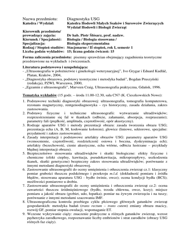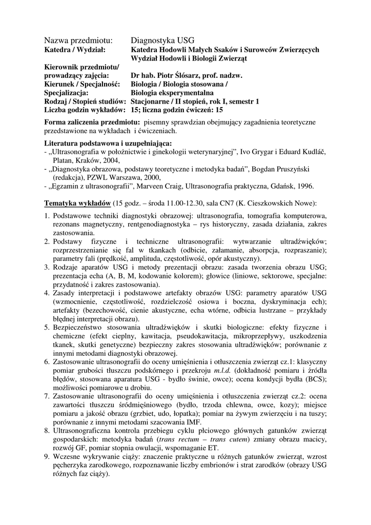 Nazwa przedmiotu: Diagnostyka USG Katedra / Wydział: Katedra Hodowli Małych Ssaków i Surowców Zwierzęcych Wydział Hodowli i Biologii Zwierząt Kierownik przedmiotu/ prowadzący zajęcia: Kierunek / Specjalność: Specjalizacja: Rodzaj / Stopień studiów: Liczba godzin wykładów: Dr hab. Piotr Ślósarz, prof. nadzw. Biologia / Biologia stosowana / Biologia eksperymentalna Stacjonarne / II stopień, rok I, semestr 1 15; liczna godzin ćwiczeń: 15 Forma zaliczenia przedmiotu: pisemny sprawdzian obejmujący zagadnienia teoretyczne przedstawione na wykładach i ćwiczeniach. Literatura podstawowa i uzupełniająca: - „Ultrasonografia w położnictwie i ginekologii weterynaryjnej”, Ivo Grygar i Eduard Kudláč, Platan, Kraków, 2004, - „Diagnostyka obrazowa, podstawy teoretyczne i metodyka badań”, Bogdan Pruszyński (redakcja), PZWL Warszawa, 2000, - „Egzamin z ultrasonografii”, Marveen Craig, Ultrasonografia praktyczna, Gdańsk, 1996. Tematyka wykładów (15 godz. – środa 11.00-12.30, sala CN7 (K. Cieszkowskich Nowe): 1. Podstawowe techniki diagnostyki obrazowej: ultrasonografia, tomografia komputerowa, rezonans magnetyczny, rentgenodiagnostyka – rys historyczny, zasada działania, zakres zastosowania. 2. Podstawy fizyczne i techniczne ultrasonografii: wytwarzanie ultradźwięków; rozprzestrzenianie się fal w tkankach (odbicie, załamanie, absorpcja, rozpraszanie); parametry fali (prędkość, amplituda, częstotliwość, opór akustyczny). 3. Rodzaje aparatów USG i metody prezentacji obrazu: zasada tworzenia obrazu USG; prezentacja echa (A, B, M, kodowanie kolorem); głowice (liniowe, sektorowe, specjalne: przydatność i zakres zastosowania). 4. Zasady interpretacji i podstawowe artefakty obrazów USG: parametry aparatów USG (wzmocnienie, częstotliwość, rozdzielczość osiowa i boczna, dyskryminacja ech); artefakty (bezechowość, cienie akustyczne, echa wtórne, odbicia lustrzane – przykłady błędnej interpretacji obrazu). 5. Bezpieczeństwo stosowania ultradźwięków i skutki biologiczne: efekty fizyczne i chemiczne (efekt cieplny, kawitacja, pseudokawitacja, mikroprzepływy, uszkodzenia tkanek, skutki genetyczne) bezpieczny zakres stosowania ultradźwięków; porównanie z innymi metodami diagnostyki obrazowej. 6. Zastosowanie ultrasonografii do oceny umięśnienia i otłuszczenia zwierząt cz.1: klasyczny pomiar grubości tłuszczu podskórnego i przekroju m.l.d. (dokładność pomiaru i źródła błędów, stosowana aparatura USG - bydło świnie, owce); ocena kondycji bydła (BCS); możliwości pomiarowe u drobiu. 7. Zastosowanie ultrasonografii do oceny umięśnienia i otłuszczenia zwierząt cz.2: ocena zawartości tłuszczu śródmięśniowego (bydło, trzoda chlewna, owce, kozy); miejsce pomiaru a jakość obrazu (grzbiet, udo, łopatka); pomiar na żywym zwierzęciu i na tuszy; porównanie z innymi metodami szacowania IMF. 8. Ultrasonograficzna kontrola przebiegu cyklu płciowego głównych gatunków zwierząt gospodarskich: metodyka badań (trans rectum – trans cutem) zmiany obrazu macicy, rozwój GF, pomiar stopnia owulacji, wspomaganie ET. 9. Wczesne wykrywanie ciąży: znaczenie praktyczne u różnych gatunków zwierząt, wzrost pęcherzyka zarodkowego, rozpoznawanie liczby embrionów i strat zarodków (obrazy USG różnych faz ciąży). 10. Rozpoznawanie płci i wieku płodów: pomiar rytmu bicia serca; pomiar CRL; pomiary (kości długich, wielkości czaszki, narządów wewnętrznych płodu); szacowanie wieku ciążowego; prognozowanie masy urodzeniowej. 11. Zastosowanie ultrasonografii do badania morfologii wymienia (bydło, owce, kozy): metodyka badań gruczołu mlekowego; pomiary zatoki mlekonośnej; prognozowanie wydajności mleka; wykorzystanie USG w selekcji (budowa wymienia i wydajność mleka). 12. Zastosowanie ultrasonografii do badania morfologii kanału strzykowego (bydło, owce, kozy): metodyka badań (ultrasonografia bezdotykowa); interpretacja obrazu; możliwości pomiarowe (ściana strzyka i kanał strzykowy – związek z jakością higieniczną mleka); wpływ doju na morfologię strzyka – możliwości badawcze. 13. Zasady komputerowej analizy obrazu: budowa obrazu; rodzaje obrazów (binarne, monochromatyczne, kolorowe); formaty graficzne; siatka kwadratowa i heksagonalna (wady i zalety z punktu widzenia analizy obrazu); oprogramowanie do analizy obrazu. 14. Podstawowe przekształcenia obrazu: przekształcenia geometryczne; operacje punktowe, filtracja, binaryzacja, gamma modulacja, przekształcenia morfologiczne (erozja, dylatacja, szkieletyzacja); przykłady zastosowań praktycznych do interpretacji obrazu USG. 15. Zasady i metody pomiarów komputerowych: liczebność elementów; pomiary liniowe (długość, obwód, pole powierzchni, pomiary USG-3D); źródła błędów pomiarowych; podstawy analizy obrazu metodą sztucznych sieci neuronowych (przykłady zastosowań). Tematyka ćwiczeń (15 godz. – ze względu na specyfikę zajęć, terminy ćwiczeń będą na bieżąco uzgadniane z prowadzącym. ćwiczenia w Złotnikach rozpoczynają się o godz. 9.15): 1. Ultrasonograficzna kontrola cyklu płciowego i wczesna diagnostyka ciąży: ultrasonografia trans rectum i trans cutem; rozpoznawanie GF i CL; pomiar stopnia owulacji; rozpoznawanie wczesnej ciąży i liczby zarodków/płodów, – (zajęcia praktyczne 4 godz. – Stacja Doświadczalna Złotniki: owce i kozy do 60 dnia ciąży). 2. Rozpoznawanie zaawansowanej ciąży: pomiary płodów (CRL, kości długich, narządów wewnętrznych); pulsacja pępowiny, rytm bicia serca (M-mode); rozpoznawanie płci płodów. – (zajęcia praktyczne 4 godz. – Stacja Doświadczalna Złotniki: owce i kozy do 100-120 dnia ciąży). 3. Przyżyciowa ocena umięśnienia i otłuszczenia oraz diagnostyka gruczołu mlekowego: pozyskiwanie obrazów przekroju mięśnia najdłuższego grzbietu i mięśni uda, pomiary liniowe przekroju mięśnia i grubości tłuszczu; analiza IMF. Po