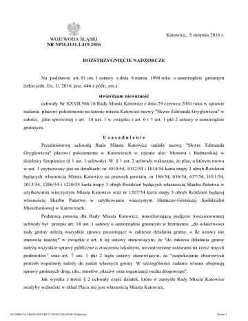 Katowice, 5 sierpnia 2016 r. WOJEWODA ŚLĄSKI NR NPII.4131.1.419.2016 ROZSTRZYGNIĘCIE NADZORCZE Na podstawie art. 91 ust. 1 ustawy z dnia 8 marca 1990 roku o samorządzie gminnym (tekst jedn. Dz. U. 2016, poz. 446 z późn. zm.) stwierdzam nieważność uchwały Nr XXVII/566/16 Rady Miasta Katowice z dnia 29 czerwca 2016 roku w sprawie nadania placowi położonemu na terenie miasta Katowice nazwy "Skwer Edmunda Gryglewicza" w całości, jako sprzecznej z art. 18 ust. 1 w związku z art. 6 i 7 ust. 1 pkt 2 ustawy o samorządzie gminnym. Uzasadnienie Przedmiotową uchwałą Rada Miasta Katowice nadała nazwę "Skwer Edmunda Gryglewicza" placowi położonemu w Katowicach w rejonie ulic: Morawa i Bednarskiej w dzielnicy Szopienice (§ 1 ust. 1 uchwały). W § 1 ust. 2 uchwały wskazano, że plac, o którym mowa w ust. 1 usytuowany jest na działkach: nr 1010/54, 1012/54 i 1014/54 karta mapy 3 obręb Roździeń będących własnością Miasta Katowice na prawach powiatu, nr 186/54, 636/54, 637/54, 1011/54, 1013/54, 1206/54 i 1210/54 karta mapy 3 obręb Roździeń będących własnością Skarbu Państwa w użytkowaniu wieczystym Miasta Katowice oraz nr 1207/54 karta mapy 3 obręb Roździeń będącej własnością Skarbu Państwa w użytkowaniu wieczystym Hutniczo-Górniczej Spółdzielni Mieszkaniowej w Katowicach. Podstawą prawną dla Rady Miasta Katowice, umożliwiającą podjęcie kwesionowanej uchwały był przepis art. 18 ust. 1 ustawy o samorządzie gminnym w brzmieniu: „do właściwości rady gminy należą wszystkie sprawy pozostające w zakresie działania gminy, o ile ustawy nie stanowią inaczej" w związku z art. 6 tej ustawy stanowiącym, że "do zakresu działania gminy należą wszystkie sprawy publiczne o znaczeniu lokalnym, niezastrzeżone ustawami na rzecz innych podmiotów” oraz art. 7 ust. 1 pkt 2 tejże ustawy stanowiącym, że "zaspokojanie zbiorowych potrzeb wspólnoty należy do zadań własnych gminy. W szczególności zadania własne obejmują sprawy gminnych dróg, ulic, mostów, placów oraz organizacji ruchu drogowego". Jak wynika z treści § 2 uchwały część działek, które w zamyśle Rady Miasta Katowice miałyby wchodzić w skład Placu nie jest własnością Miasta Katowice. Id: FBB61A12-BE88-42FD-BF75-DC6CC8BA9F8B. Podpisany Strona 1 Należy wskazać, że przepis art. 18 ust. 2 pkt 13 ustawy o samorządzie gminnym umożliwia wprawdzie radzie gminy podejmowanie uchwał w sprawie nazw ulic lub placów, lecz jest to możliwe jedynie w przypadku, gdy posiadają one status dróg publicznych lub są drogami wewnętrznymi w rozumieniu ustawy o drogach publicznych. Uchwała podjęta na podstawie art. 18 ust. 2 pkt 13 ustawy o samorządzie gminnym posiada walor aktu prawa miejscowego. Jak stwierdza Wojewódzki Sąd Administracyjny w wyroku z dnia 20 stycznia 2016 roku (sygn. akt IV SA/Po 531/15, LEX 1977382) "Nazwa ulicy jest także elementem realizacji praw i obowiązków publicznych, a takie prawa i obowiązki muszą mieć podstawę normatywną powszechnie obowiązującą. Ustawa o samorządzie gminnym w art. 18 ust. 2 pkt 13 daje radzie podstawę do podejmowania uchwał o nadaniu nazwy ulicy i choć trudno ją uznać za pełną to jest to podstawa wyraźnie określona, uprawniająca do ich podejmowania organ stanowiący i to na zasadzie wyłączności, zamieszczona w przepisach samej ustawy ustrojowej. W sytuacji, gdy nie ma szczególnej podstawy prawnej do podjęcia aktu prawa miejscowego, taką podstawę należy uznać za umocowaną w przepisie art. 40 ust. 1 ustawy o samorządzie gminnym. Warunkiem koniecznym realizacji kompetencji nadawania nazw ulicom jest ich status drogi publicznej, a w przypadku dróg niepublicznych wymagana jest dodatkowo zgoda właścicieli terenów." Rada Miasta Katowice nie podjęła kwestionowanej uchwały na podstawie art. 18 ust. 2 pkt 13 ustawy o samorządzie gminnym, do czego byłaby uprawniona w przypadku, gdyby Plac spełniał warunki pozwalające na podjęcie takiej uchwały, lecz uczyniła to przywołując cytowany wyżej przepis art. 18 ust. 1 w związku z art. 6 i 7 ustawy o samorządzie gminnym. Jednakże jak wynika z treści uchwały część terenów stanowiących Plac, któremu Rada nadała niniejszą uchwałą nazwę, nie stanowi własności Miasta Katowice. W ocenie organu nadzoru kwestionowana uchwała jest niezgodna z prawem. Narusza ona bowiem przepis art. 18 ust. 1 ustawy o samorządzie gminnym w związku z art. 7 i art. 64 Konstytucji RP. Przepis art. 18 ust. 1 ustawy o samorządzie gminnym – wskazany w podstawie prawnej uchwały - zawiera co prawda domniemanie kompetencji rady gminy. Jednakże, zdaniem organu nadzoru, gmina jest uprawniona do nadania nazwy m.in. placowi (niebędącemu drogą publiczną), korzystając ze swych uprawnień właścicielskich, ale tylko w przypadku, gdy zlokalizowany jest on na terenie, którego wyłącznym właścicielem jest gmina. Niedopuszczalnym jest więc nadanie przez gminę imienia placowi (niebędącemu drogą publiczną), który nie jest w całości własnością gminy, z uwagi na brak podstawy prawnej do takiego działania. Ponadto należy mieć na uwadze również przepis art. 1 ust. 2 ustawy o samorządzie gminnym, który niewątpliwie wyznacza granice działania gminy, a tym samym jej organów. W jego rozumieniu gmina to wspólnota samorządowa, którą tworzą mieszkańcy gminy, oraz Id: FBB61A12-BE88-42FD-BF75-DC6CC8BA9F8B. Podpisany Strona 2 odpowiednie terytorium. Tak zatem do tych elementów (wspólnoty samorządowej i terytorium) będzie ograniczone publiczne władztwo gminy i jej organów. Gmina – jako jedna z jednostek zasadniczego podziału państwa - istnieje na określonym terytorium, rozumianym jako wyodrębniony granicami obszar, przestrzeń i na tym tylko terytorium może działać, sprawować władztwo publiczne, w tym władztwo planistyczne, i w stosunku do tego terytorium posiada wszelkie uprawnienia regulacyjne (prawo stanowienia powszec