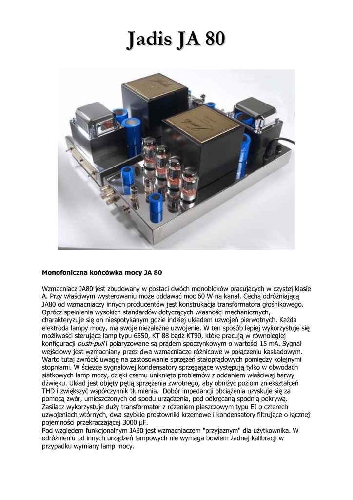 Jadis JA 80 Monofoniczna końcówka mocy JA 80 Wzmacniacz JA80 jest zbudowany w postaci dwóch monobloków pracujących w czystej klasie A. Przy właściwym wysterowaniu moŜe oddawać moc 60 W na kanał. Cechą odróŜniającą JA80 od wzmacniaczy innych producentów jest konstrukacja transformatora głośnikowego. Oprócz spełnienia wysokich standardów dotyczących własności mechanicznych, charakteryzuje się on niespotykanym gdzie indziej układem uzwojeń pierwotnych. KaŜda elektroda lampy mocy, ma swoje niezaleŜne uzwojenie. W ten sposób lepiej wykorzystuje się moŜliwości sterujące lamp typu 6550, KT 88 bądź KT90, które pracują w równoległej konfiguracji push-pull i polaryzowane są prądem spoczynkowym o wartości 15 mA. Sygnał wejściowy jest wzmacniany przez dwa wzmacniacze róŜnicowe w połączeniu kaskadowym. Warto tutaj zwrócić uwagę na zastosowanie sprzęŜeń stałoprądowych pomiędzy kolejnymi stopniami. W ścieŜce sygnałowej kondensatory sprzęgające występują tylko w obwodach siatkowych lamp mocy, dzięki czemu uniknięto problemów z oddaniem właściwej barwy dźwięku. Układ jest objęty pętlą sprzęŜenia zwrotnego, aby obniŜyć poziom zniekształceń THD i zwiększyć współczynnik tłumienia. Dobór impedancji obciąŜenia uzyskuje się za pomocą zwór, umieszczonych od spodu urządzenia, pod odkręcaną spodnią pokrywą. Zasilacz wykorzystuje duŜy transformator z rdzeniem płaszczowym typu EI o czterech uzwojeniach wtórnych, dwa szybkie prostowniki krzemowe i kondensatory filtrujące o łącznej pojemności przekraczającej 3000 µF. Pod względem funkcjonalnym JA80 jest wzmacniaczem "przyjaznym" dla uŜytkownika. W odróŜnieniu od innych urządzeń lampowych nie wymaga bowiem Ŝadnej kalibracji w przypadku wymiany lamp mocy. Wystarczy zuŜyte lampy zastąpić nowymi, dobranymi kwartetami pentod. Ponadto dwa wyłączniki niezaleŜnie sterowane: zasilanie i stand-by, zapewniają optymalne uŜytkowanie wzmacniacza, co skutkuje dłuŜszym czasem Ŝycia lamp. Dane techniczne: Moc wyjściowa (1 kHz): Impedancja obciąŜenia: Znamionowe napięcie wejściowe dla mocy 60 W: Pasmo przenoszenia (±0 dB): Impedancja wejściowa: Maksymalny pobór mocy: Wymiary: ( szer. x wys. x głęb. ) CięŜar: 60 W klasa A 1, 4, 8 lub 16 Ω (przełączana) 775 mV 20 Hz - 20 kHz > 100 kΩ 240 W (kaŜdy monoblok) 260 x 580 x 230 mm 35 kg (kaŜdy monoblok) Zastosowane lampy (dla dwóch kanałów): ECC82/12AU7 - 2 sztuki ECC83/12AX7 - 2 sztuki 6550/KT88/KT90 - 8 sztuk