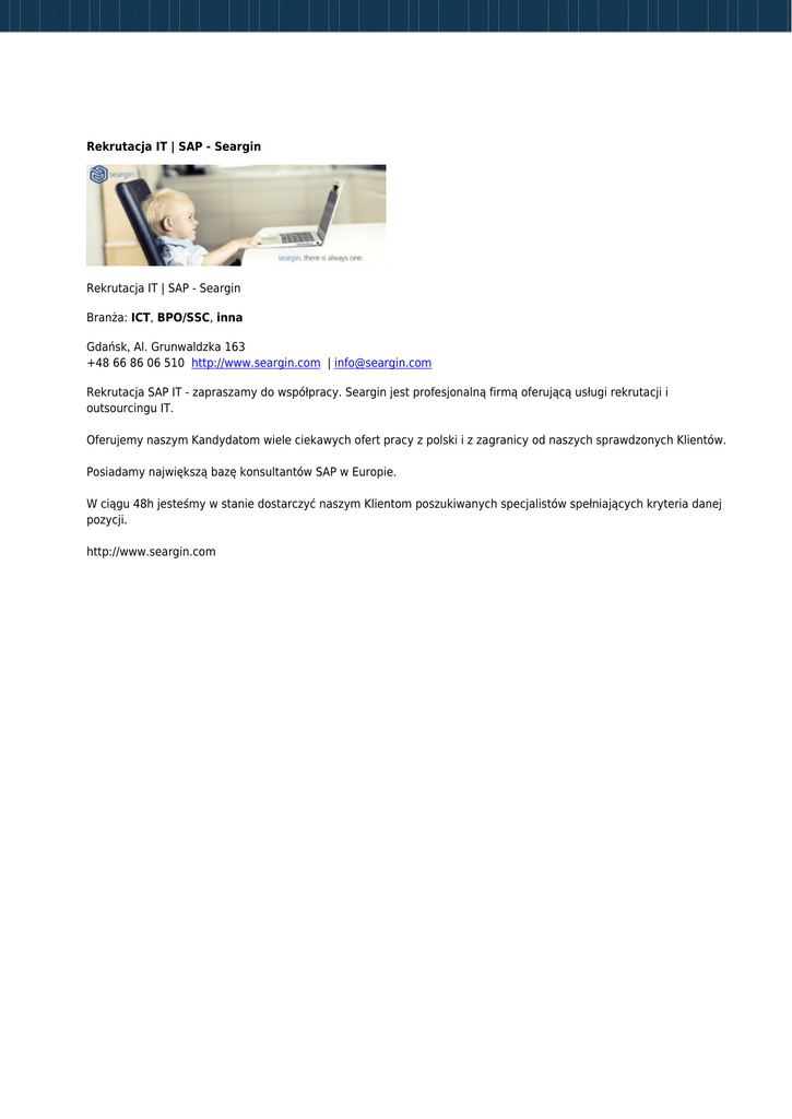 Rekrutacja IT | SAP - Seargin Rekrutacja IT | SAP - Seargin Branża: ICT, BPO/SSC, inna Gdańsk, Al. Grunwaldzka 163 +48 66 86 06 510 http://www.seargin.com | [email protected] Rekrutacja SAP IT - zapraszamy do współpracy. Seargin jest profesjonalną firmą oferującą usługi rekrutacji i outsourcingu IT. Oferujemy naszym Kandydatom wiele ciekawych ofert pracy z polski i z zagranicy od naszych sprawdzonych Klientów. Posiadamy największą bazę konsultantów SAP w Europie. W ciągu 48h jesteśmy w stanie dostarczyć naszym Klientom poszukiwanych specjalistów spełniających kryteria danej pozycji. http://www.seargin.com